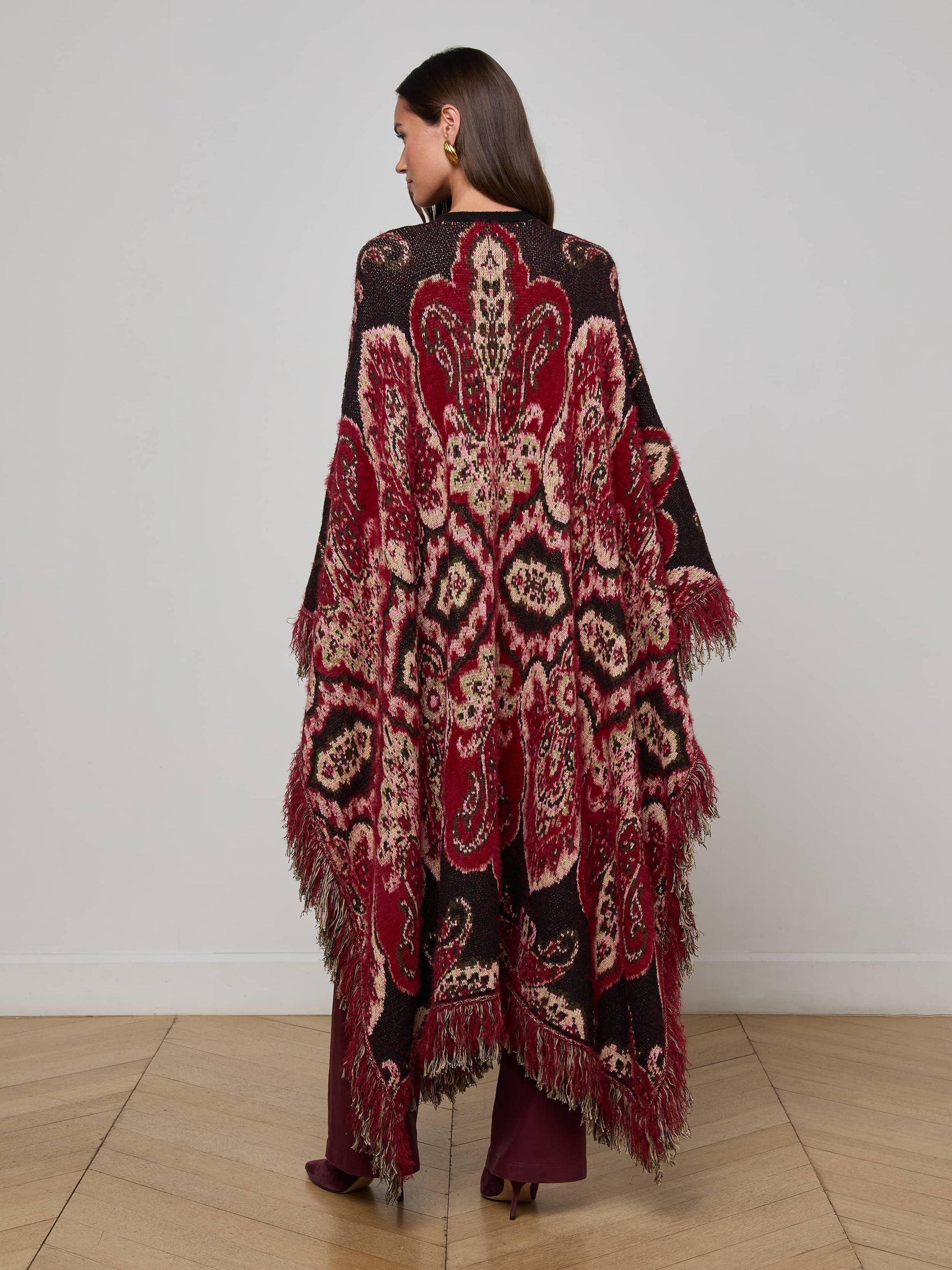 This style debuted at our Fall ‘25 NYFW presentation. Dramatic in scale and rich in detail, the Naoko poncho transforms any look with its artfully chic presence. A tapestry-inspired jacquard showcases an oversized paisley motif, framed by thick fringe for added texture. The open-front design drapes effortlessly, while the intricate pattern evokes vintage opulence with a free-spirited edge. More than just a layer, it’s a standout piece that will set trends.