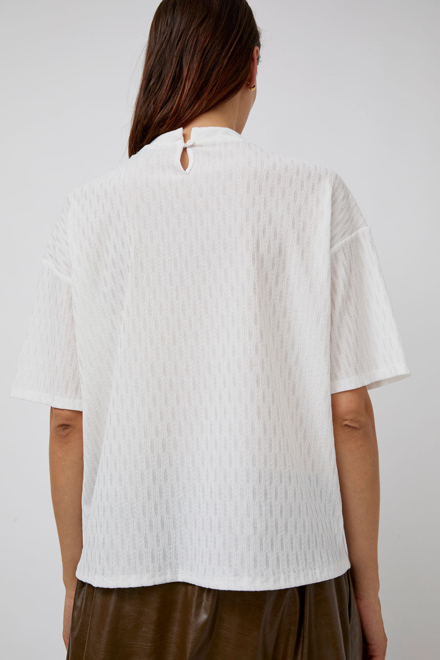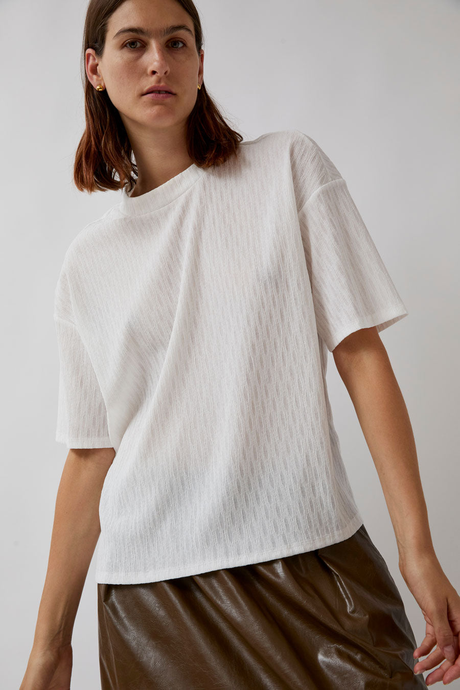 Casual cool boxy t-shirt cut with subtle, monochromatic texture. A wardrobe workhorse with depth to add visual interest.