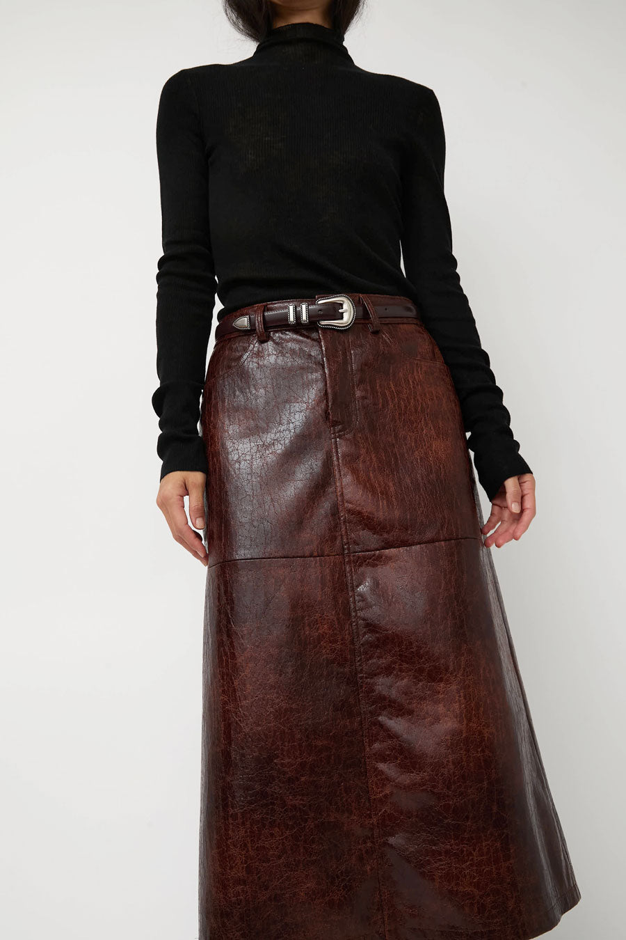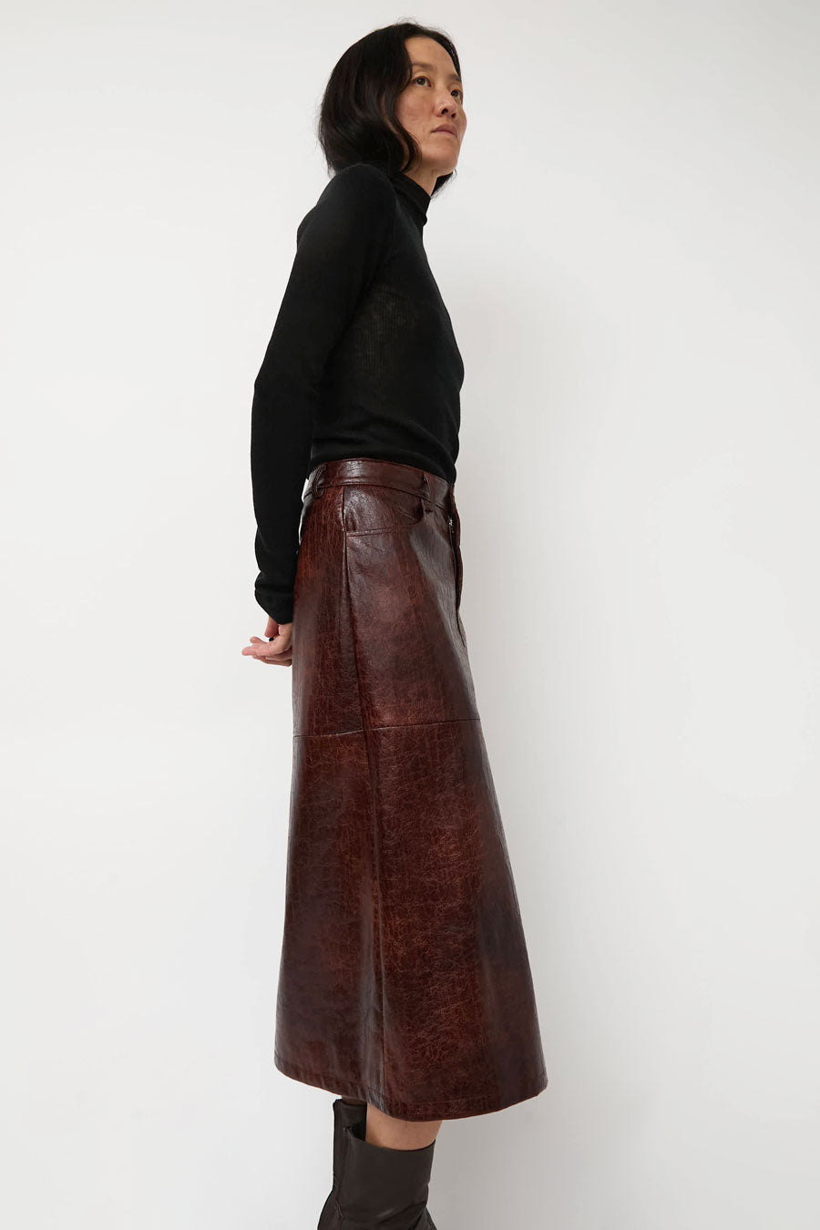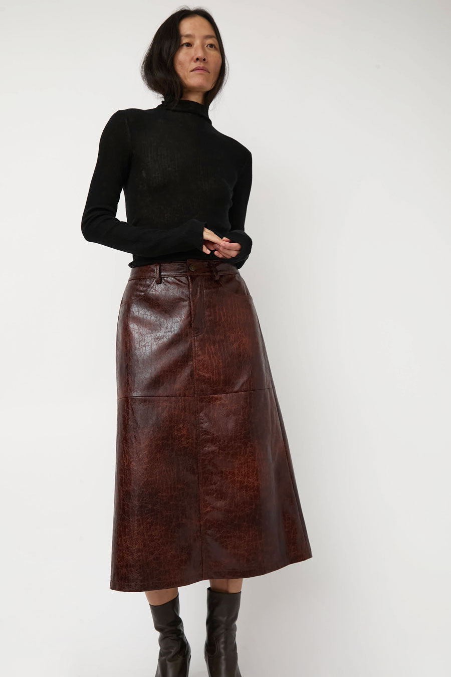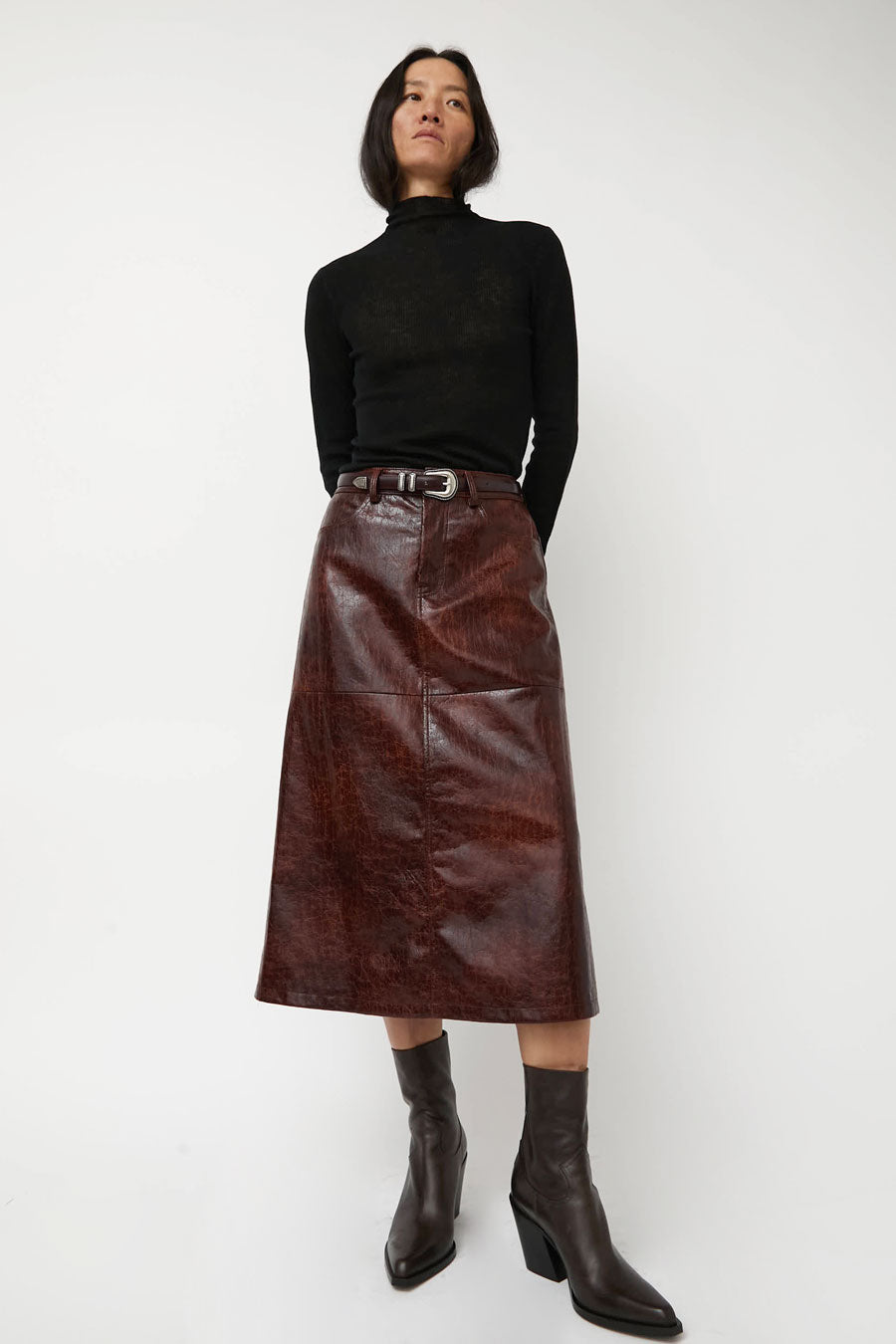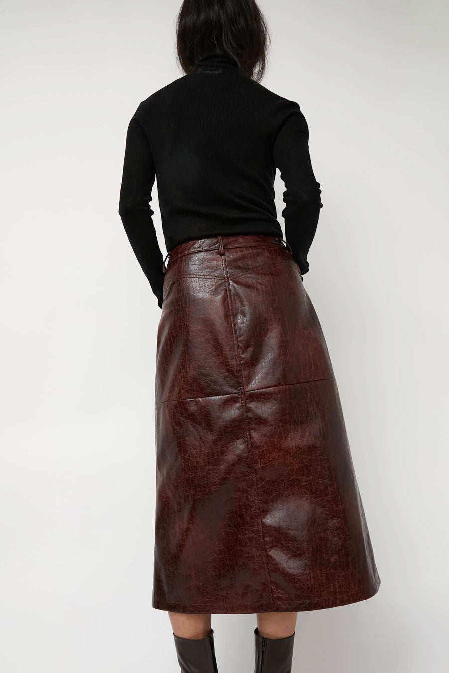 Vegan leather skirt with streamlined a-line shape. Paneled seam detailing. A cold weather wardrobe staple for years to come.