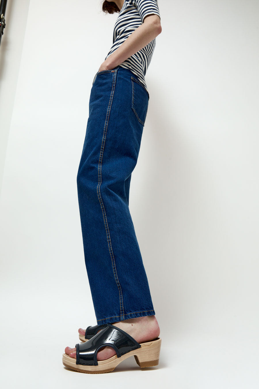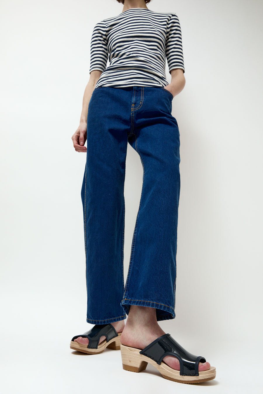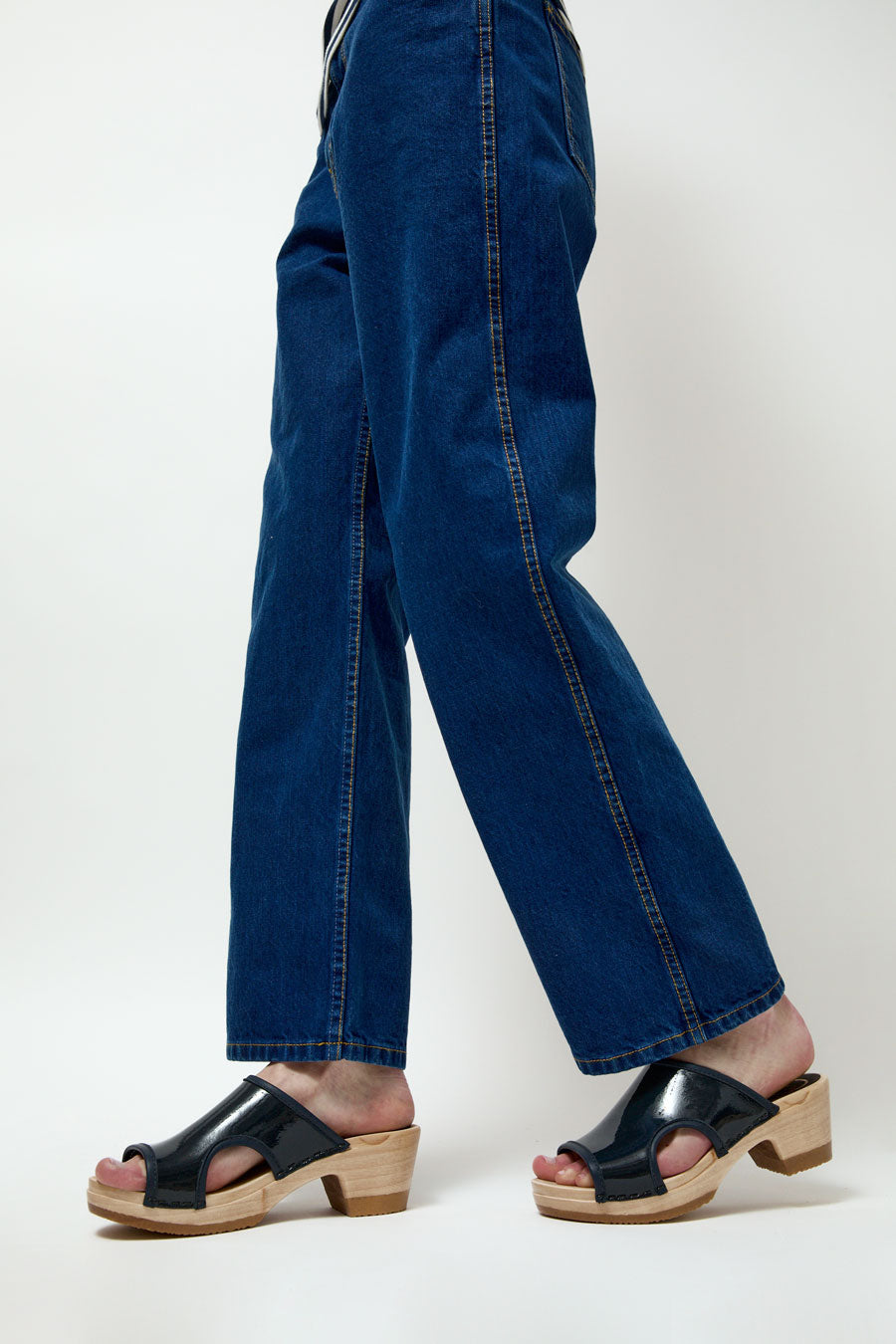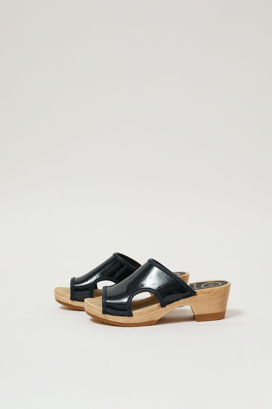 Open toe clog slide on mid heel. Navy blue patent leather upper. Side cut outs and double-needle stitching. Lacquered, lightweight wood base. Unlined.