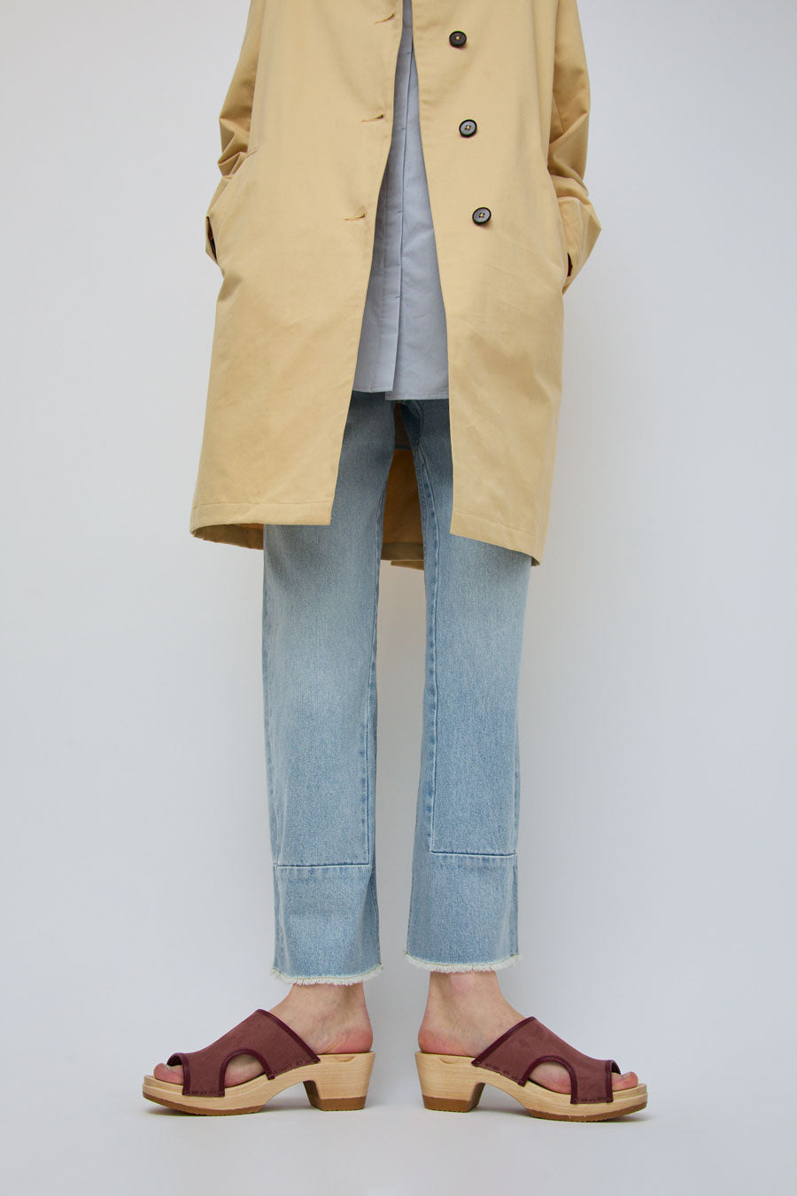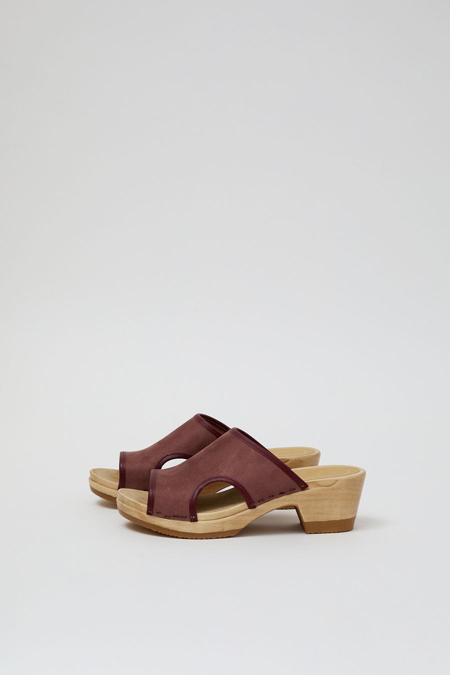 Open toe clog slide on mid heel. Dusty rose leather upper. Side cut outs and double-needle stitching. Lacquered, lightweight wood base. Unlined.