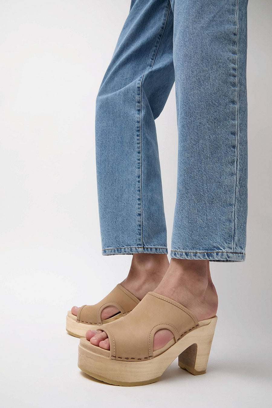 Open toe clog slide on platform heel. Smooth, pale beige nubuck upper. Side cut outs and double-needle stitching. Lacquered, lightweight wood base. Unlined.