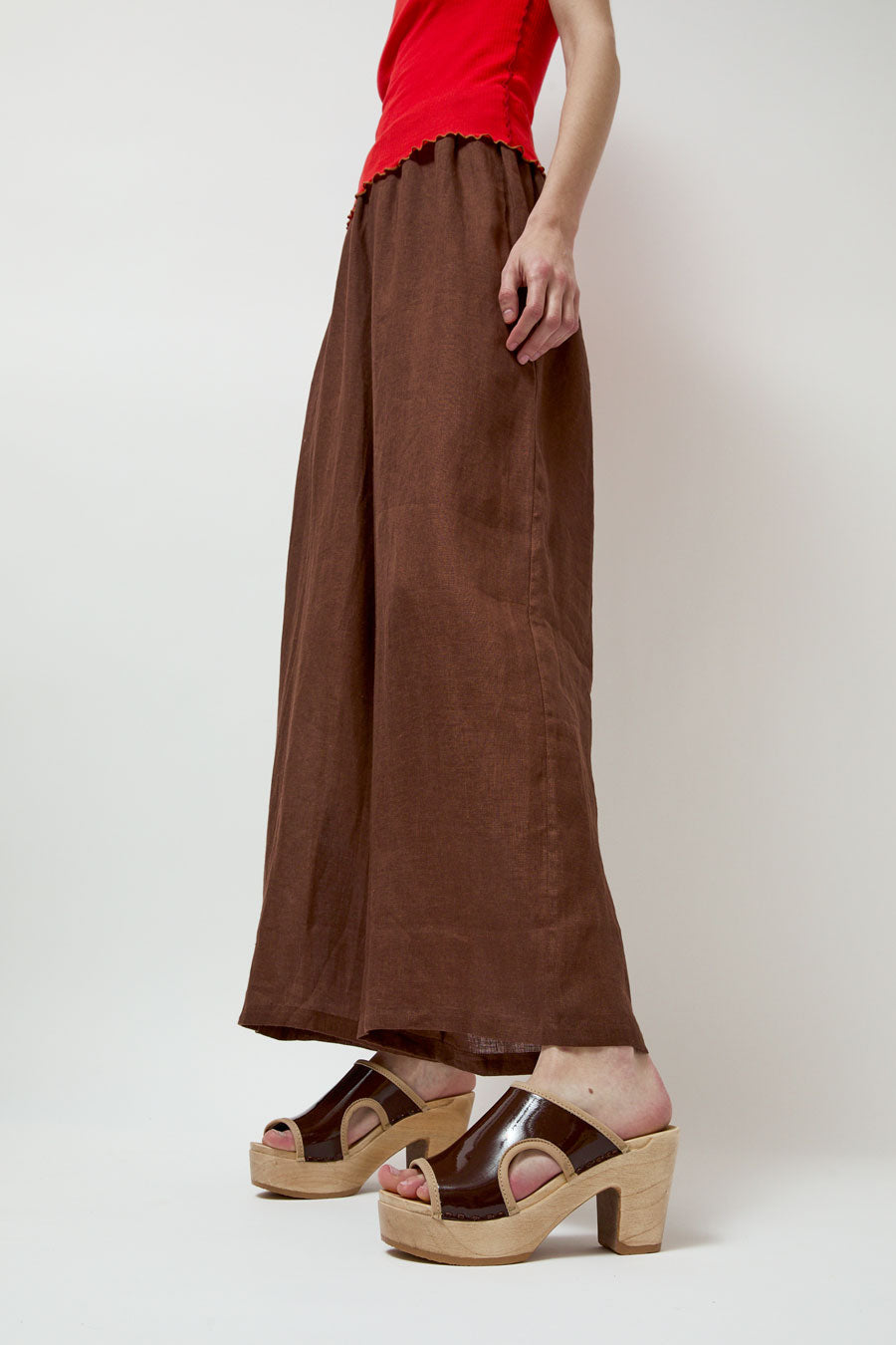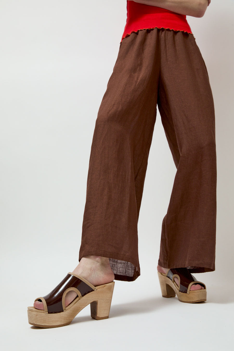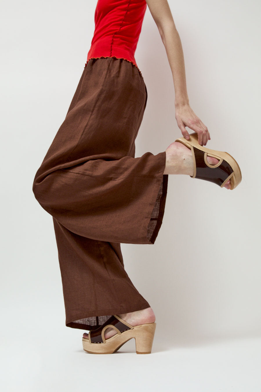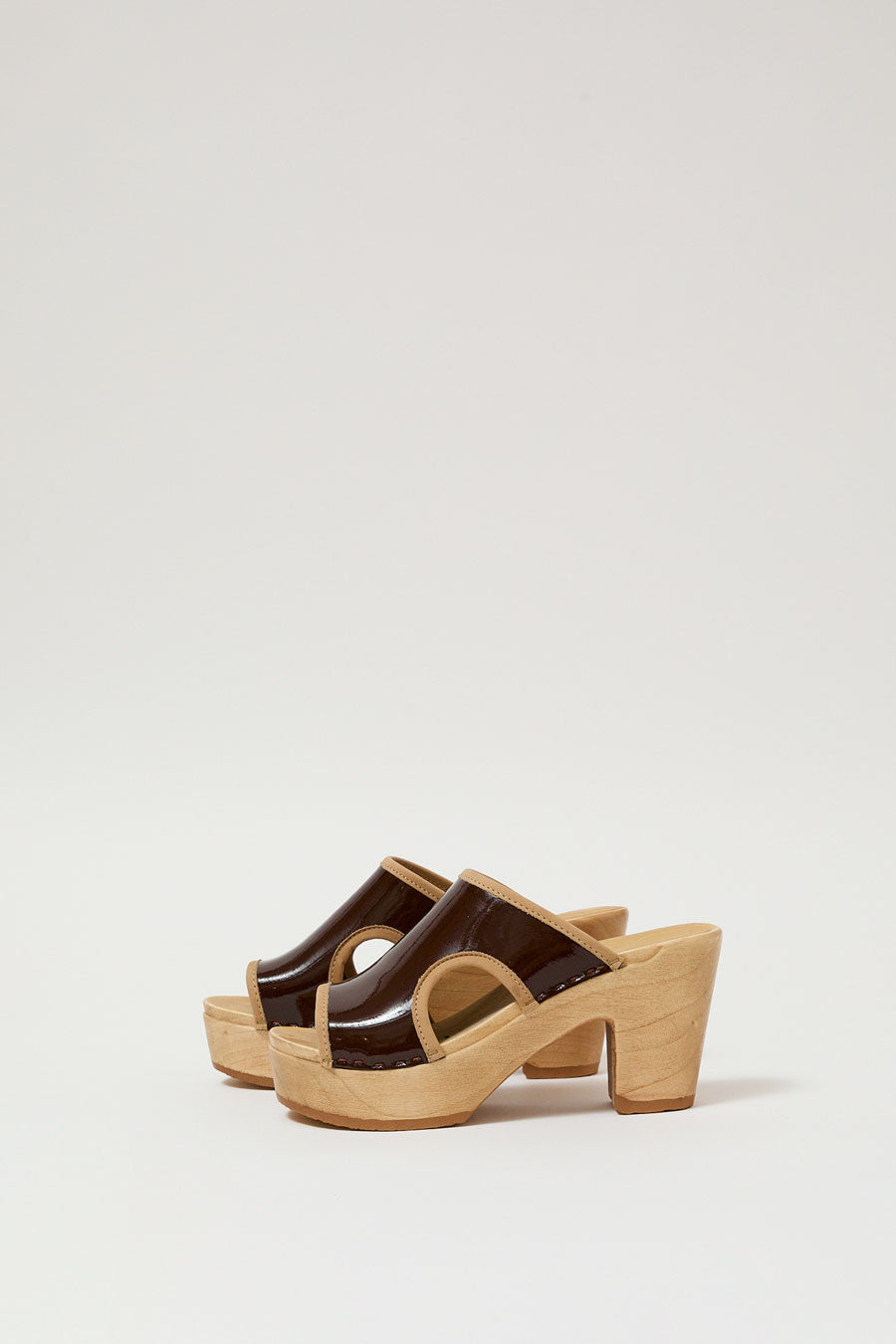 Open toe clog slide on platform heel. Dark chocolate brown patent leather upper. Side cut outs and double-needle stitching. Lacquered, lightweight wood base. Unlined.