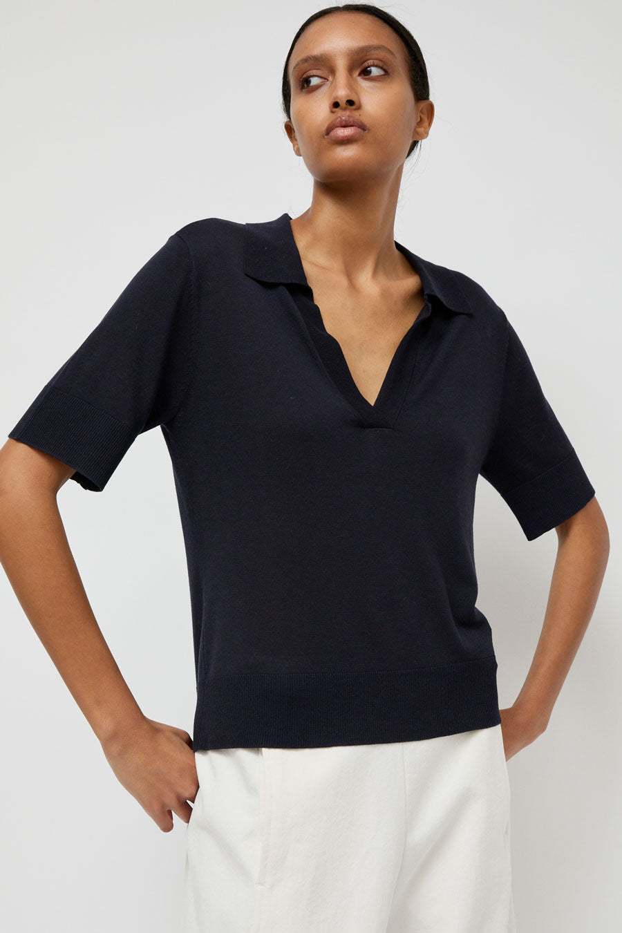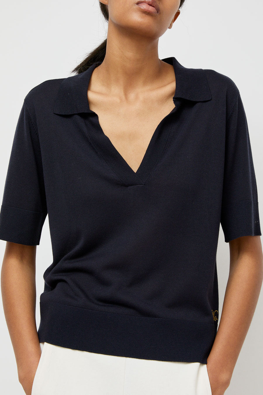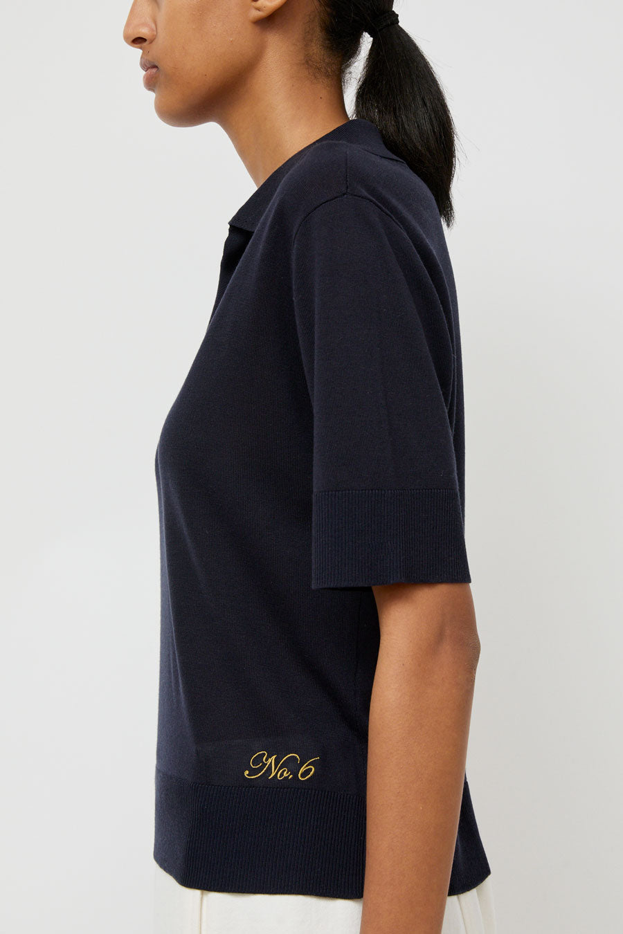 Super soft wool and tencel blend knit polo with liquid drape. Half sleeve with ribbed cuff, wide ribbed hem, and open, buttonless collar. Punctuated with embroidered No.6 logo at hip.