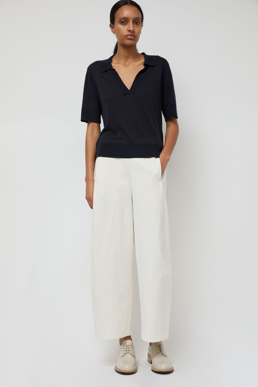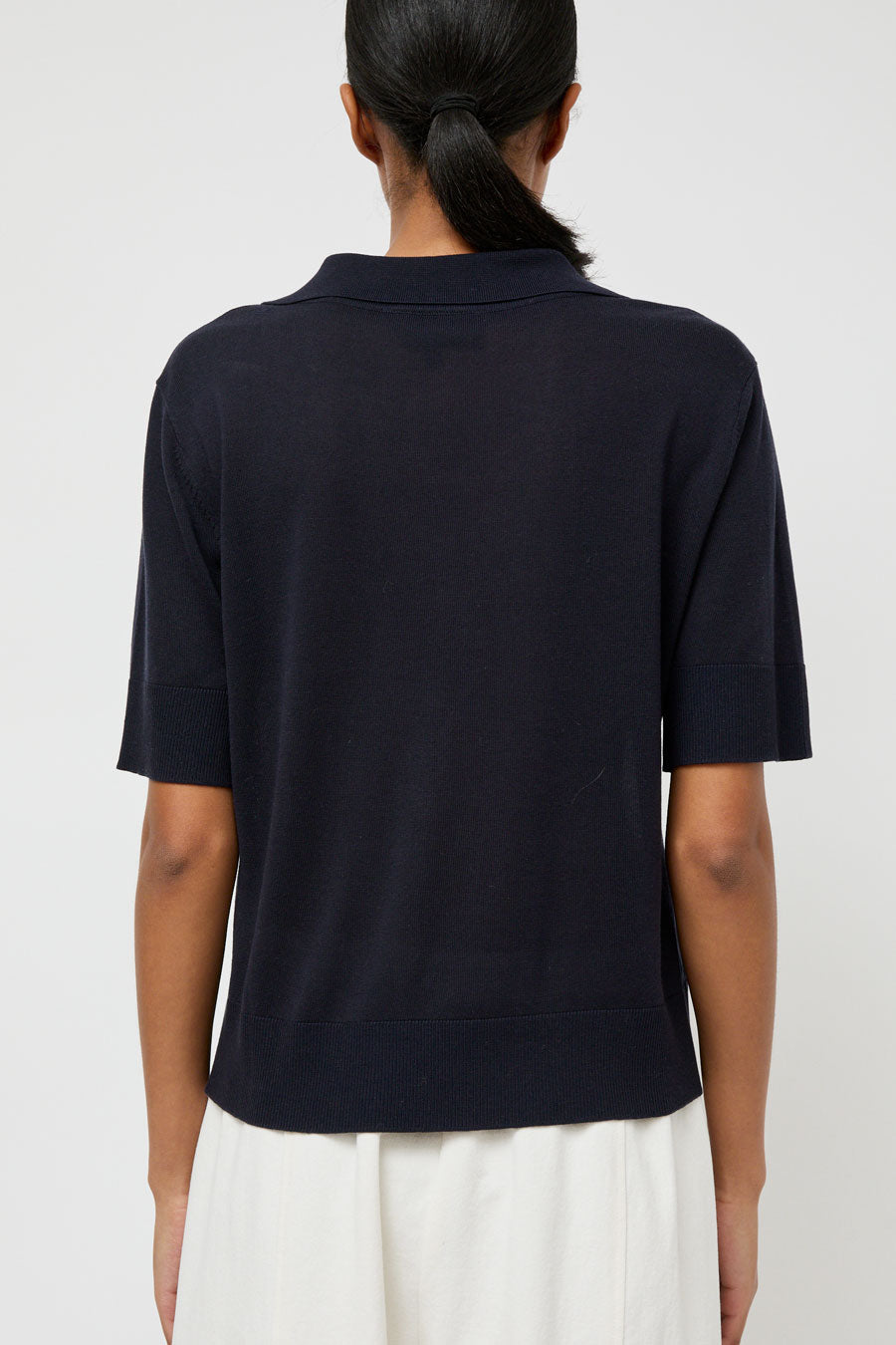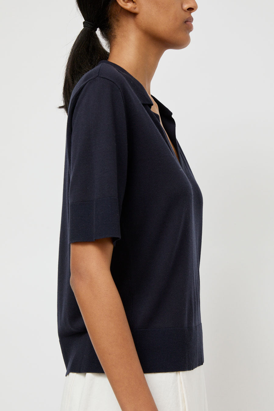 Super soft wool and tencel blend knit polo with liquid drape. Half sleeve with ribbed cuff, wide ribbed hem, and open, buttonless collar. Punctuated with embroidered No.6 logo at hip.