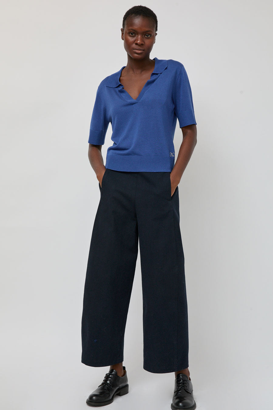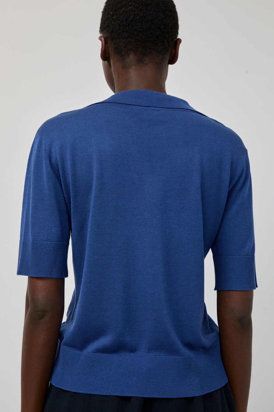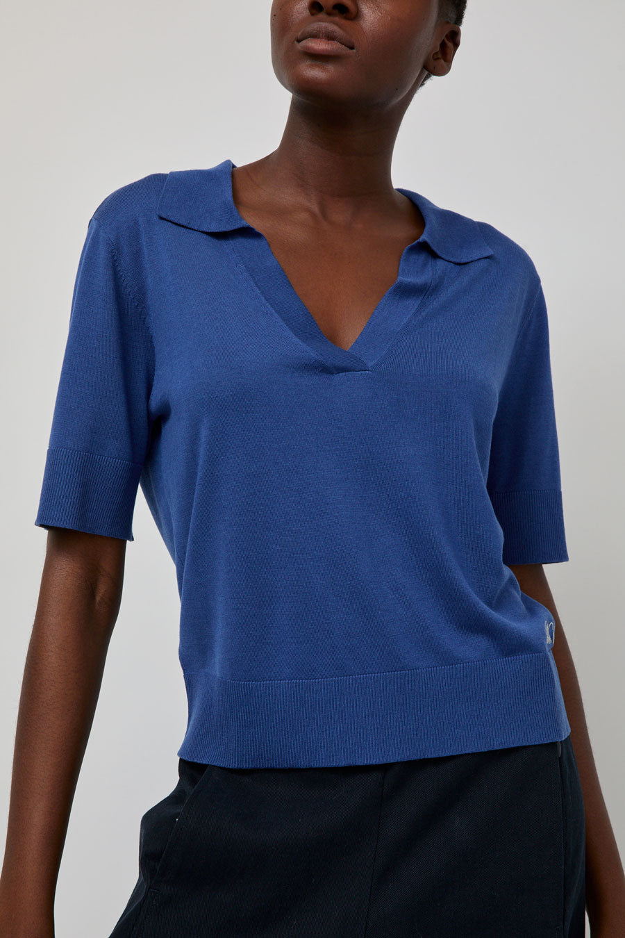 Super soft wool and tencel blend knit polo with liquid drape. Half sleeve with ribbed cuff, wide ribbed hem, and open, buttonless collar. Punctuated with embroidered No.6 logo at hip.