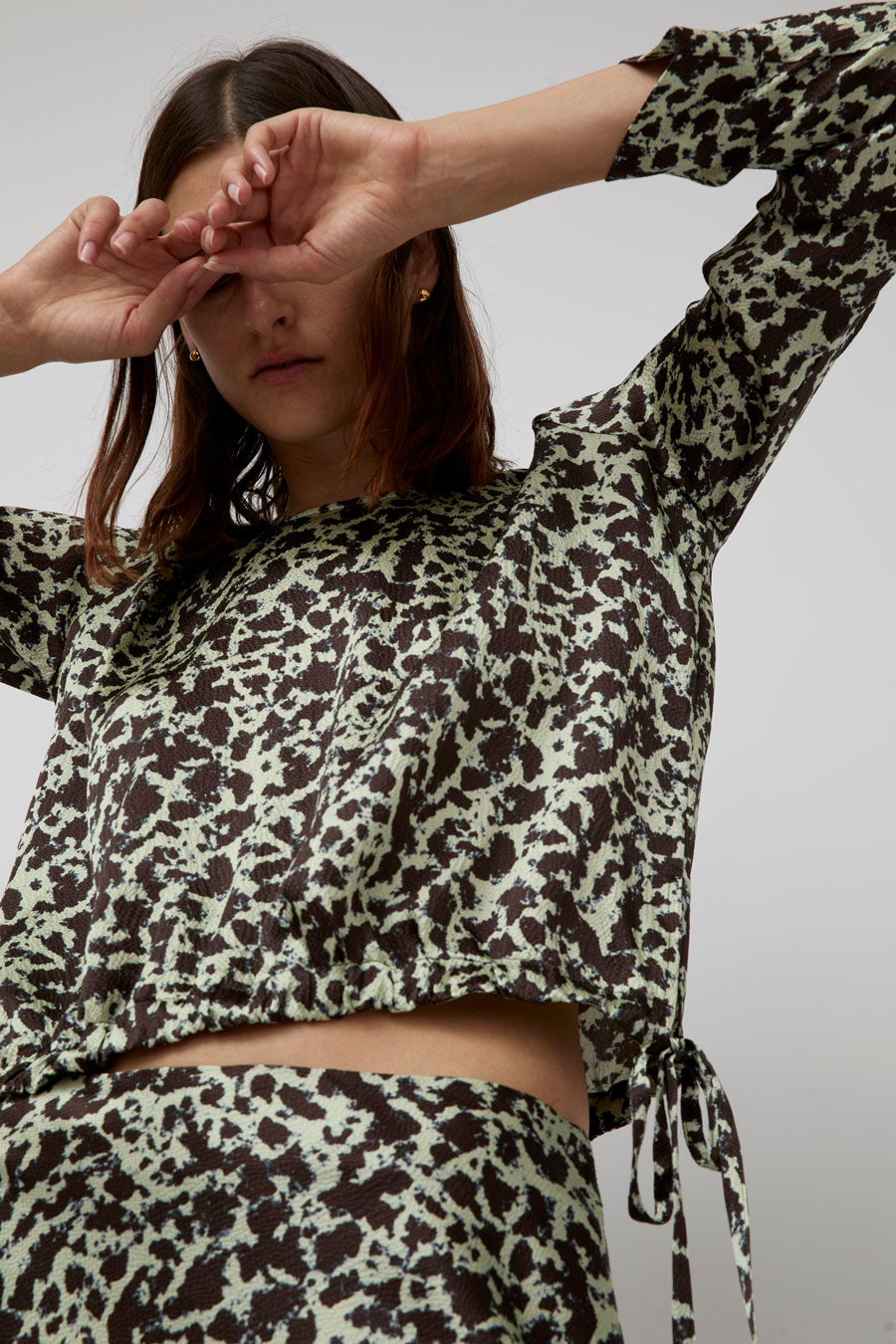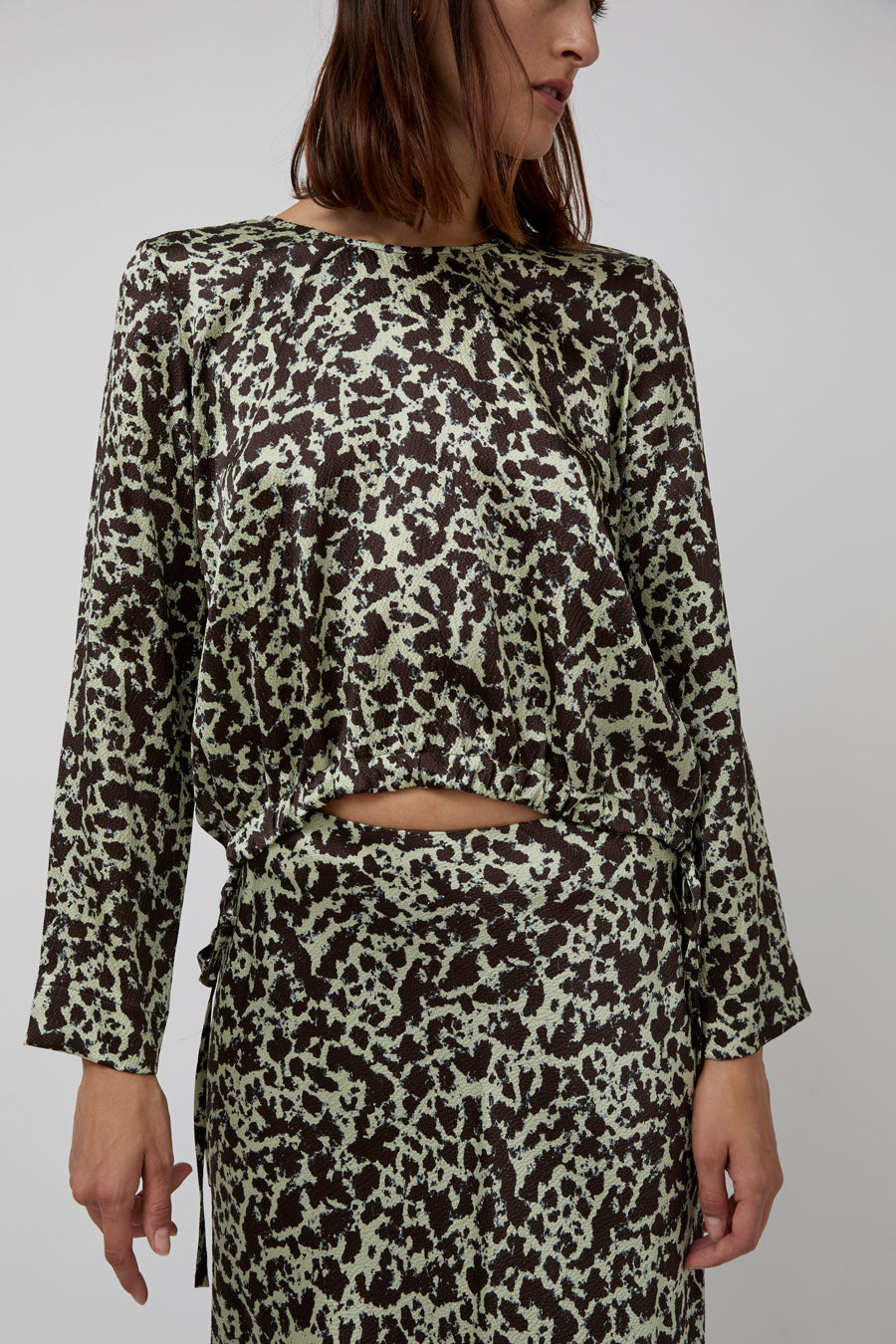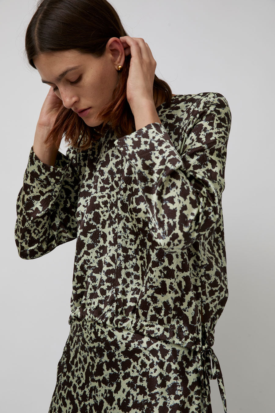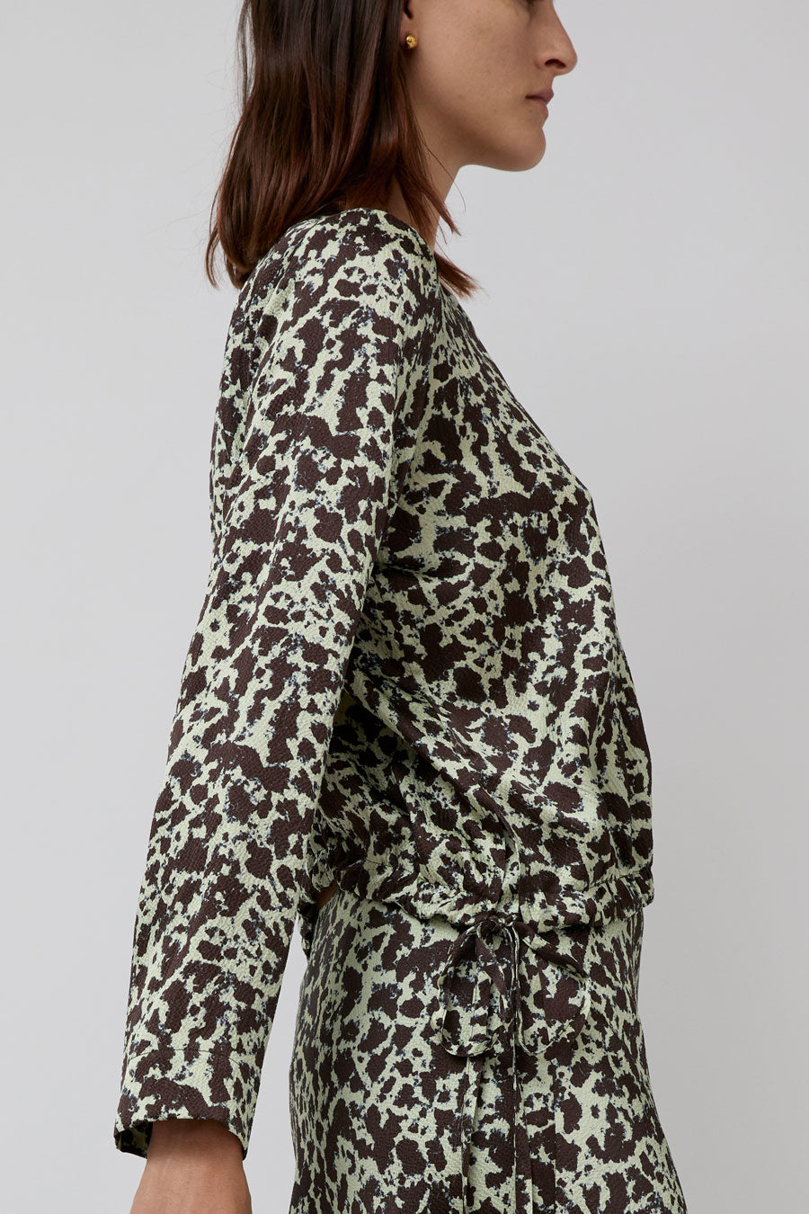 Modern yet flowing long-sleeved top cut in textured, hammered silk. Crew neckline and slightly belled sleeve. Features a curved drawstring hem with side tie closures for multiple styling options.