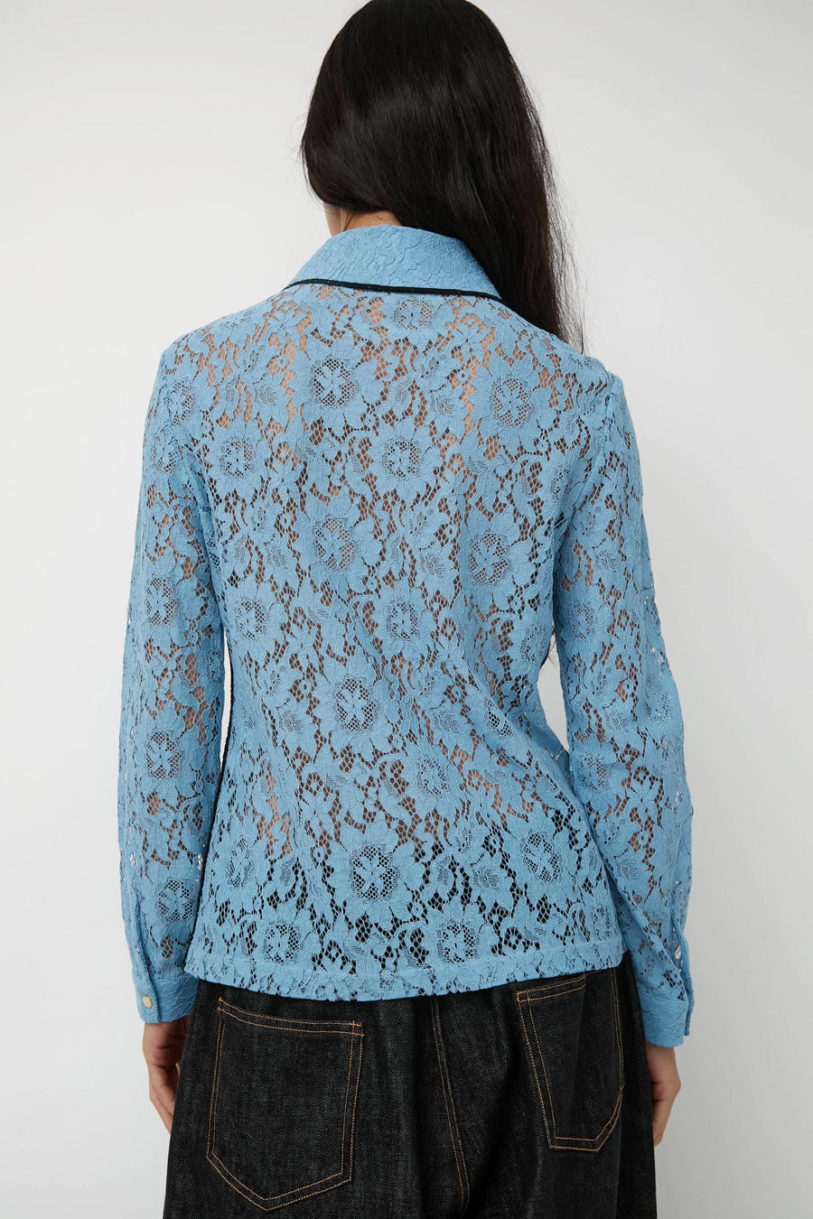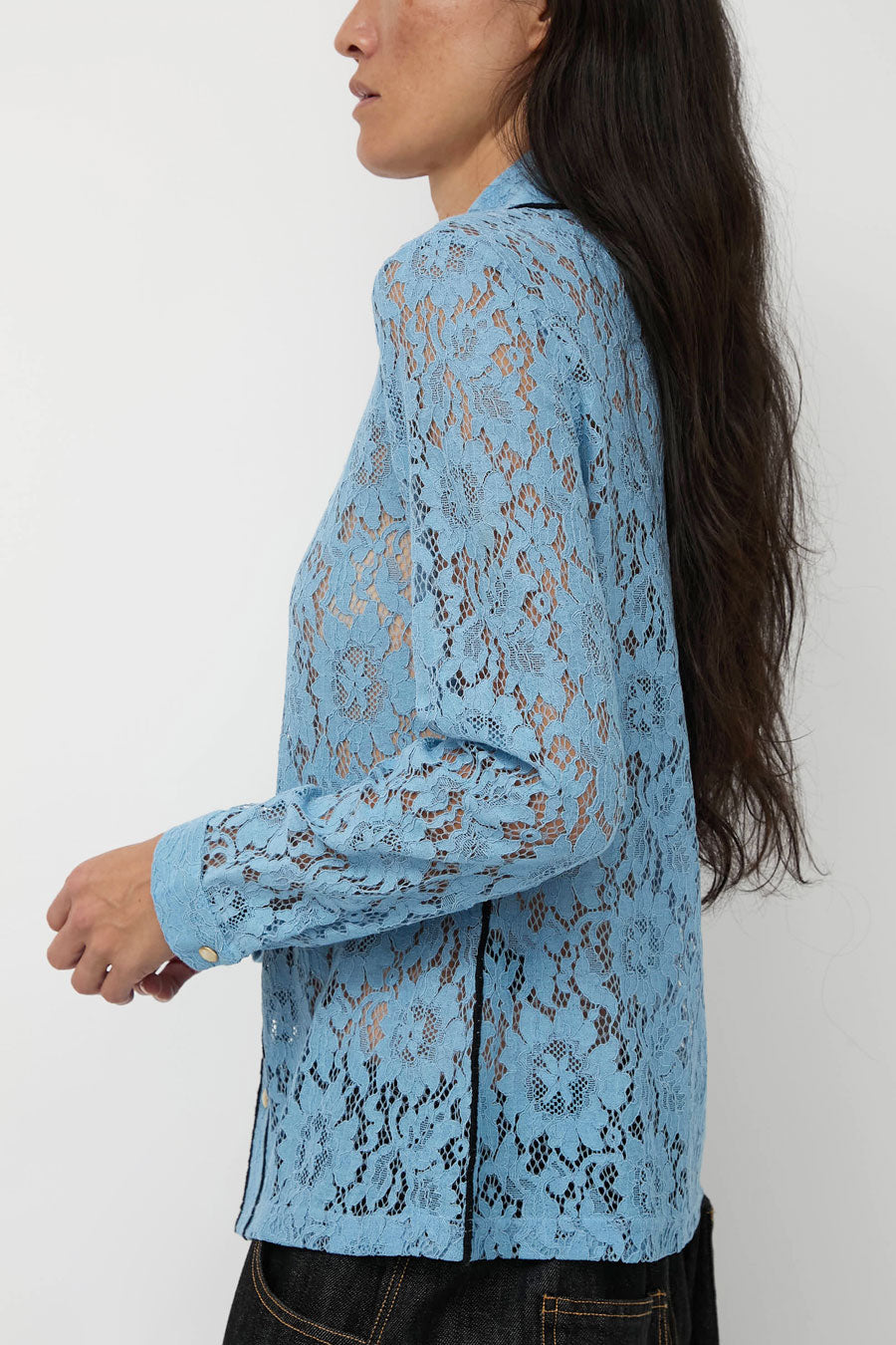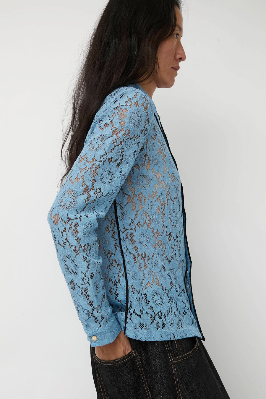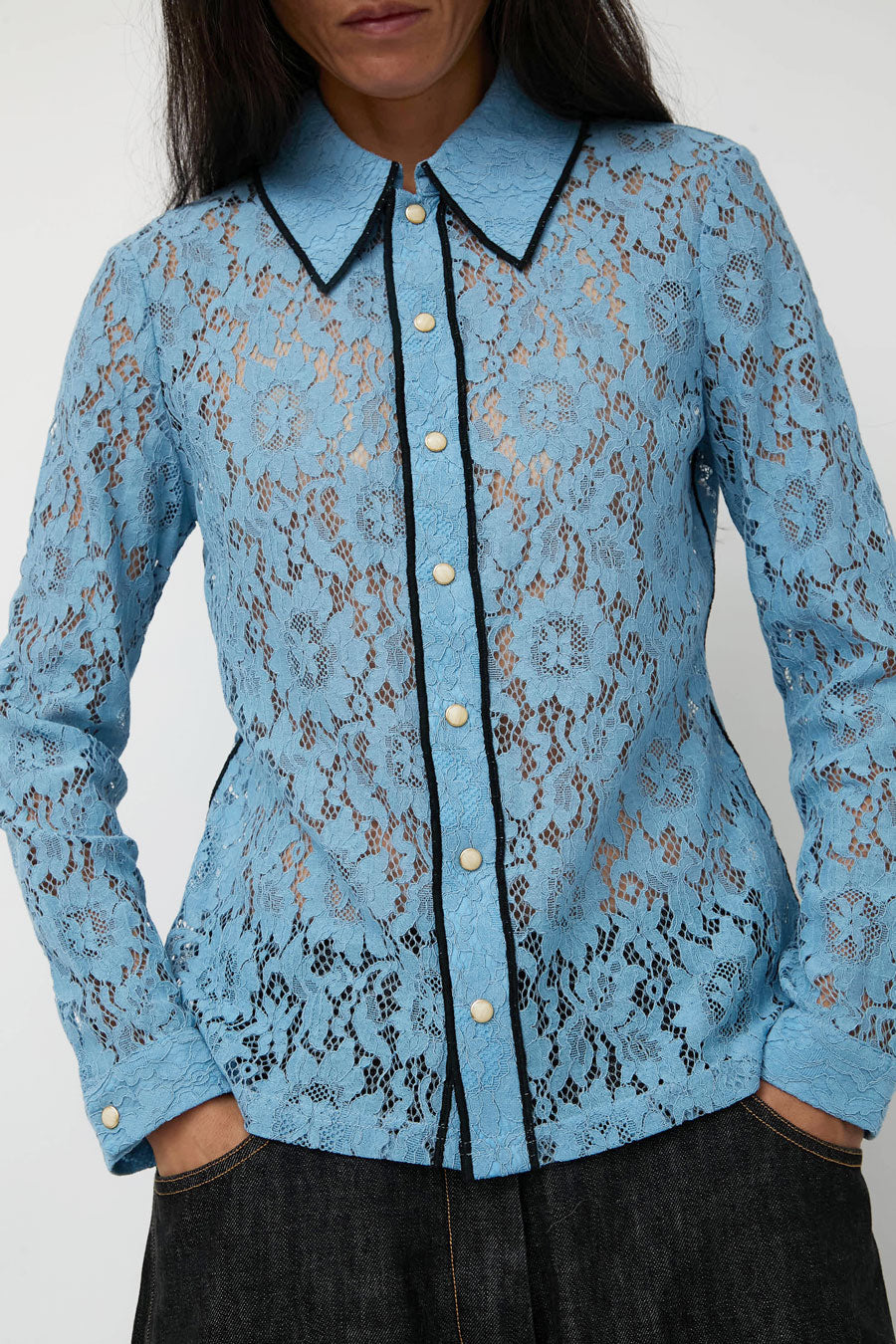 Long sleeve sleeve collared shirt cut in an open work floral lace. Pointed collar and pearlescent snap closure. Contrast stitching at edges. Adds a bit of romance to the everyday.