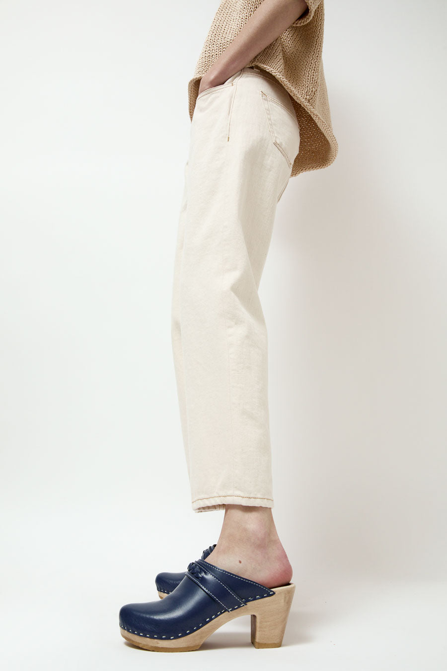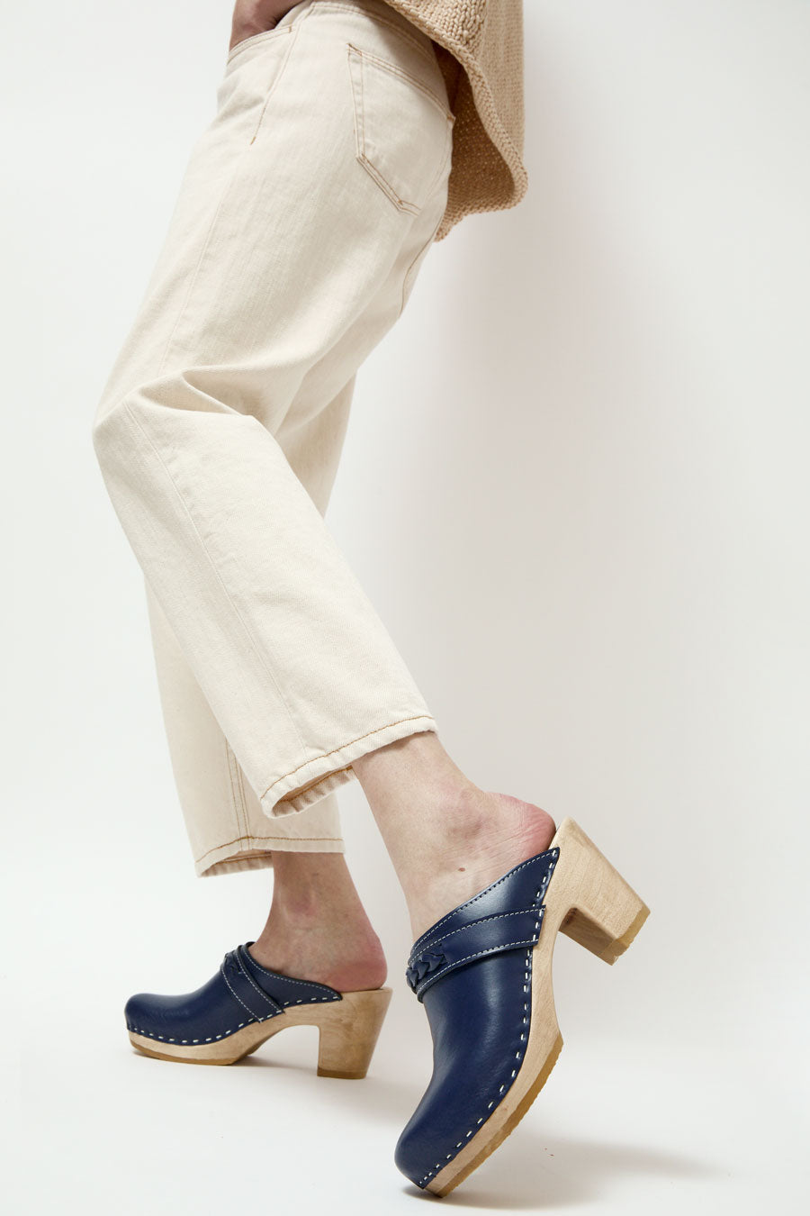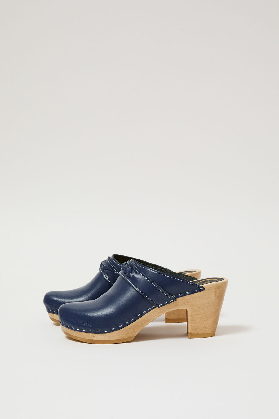 Slip on, closed-toe clog with braided band detail on high heel base. Smooth dark blue leather upper. Rounded toe and open back. Lightweight, lacquered wood base. Surprisingly comfortable for a high heeled shoe. Unlined.