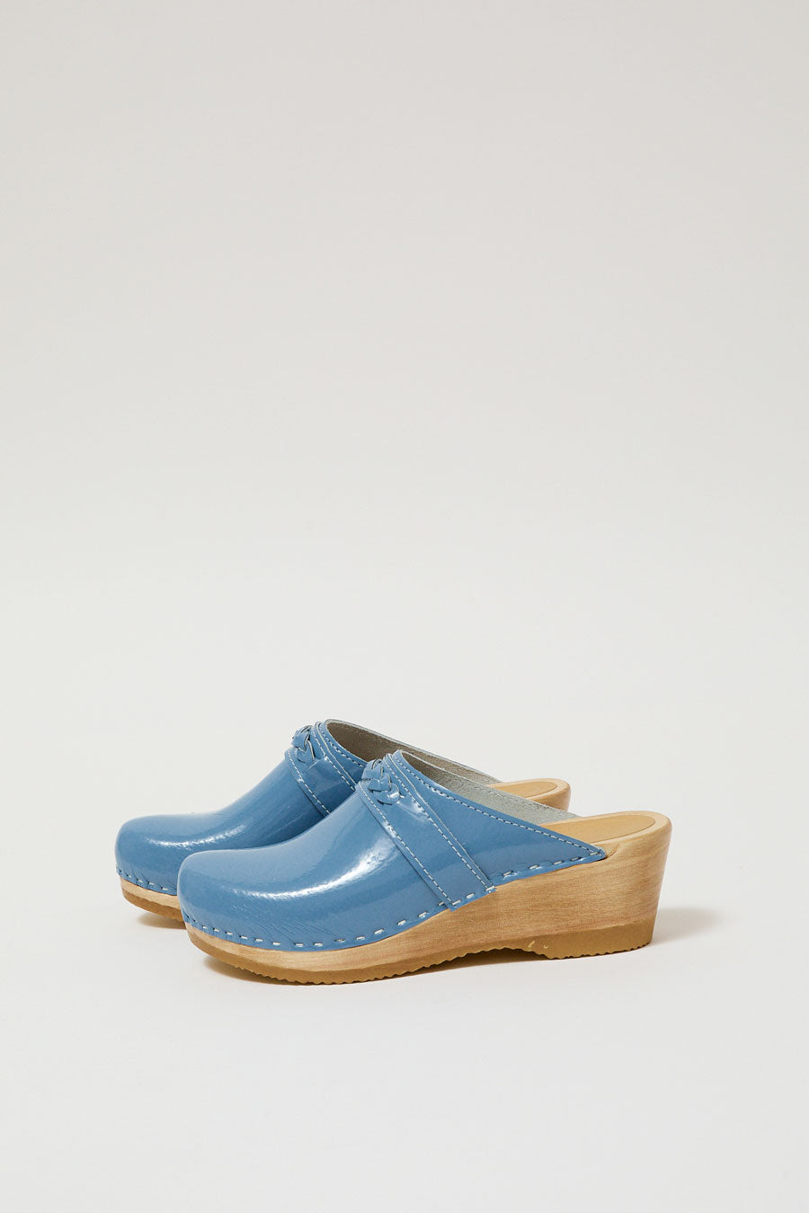Slip on, closed-toe clog with braided band detail on a comfy mid-wedge base. Mid blue patent leather upper. Stitched collar, slightly rounded toe and open back. Lacquered, lightweight wooden base.