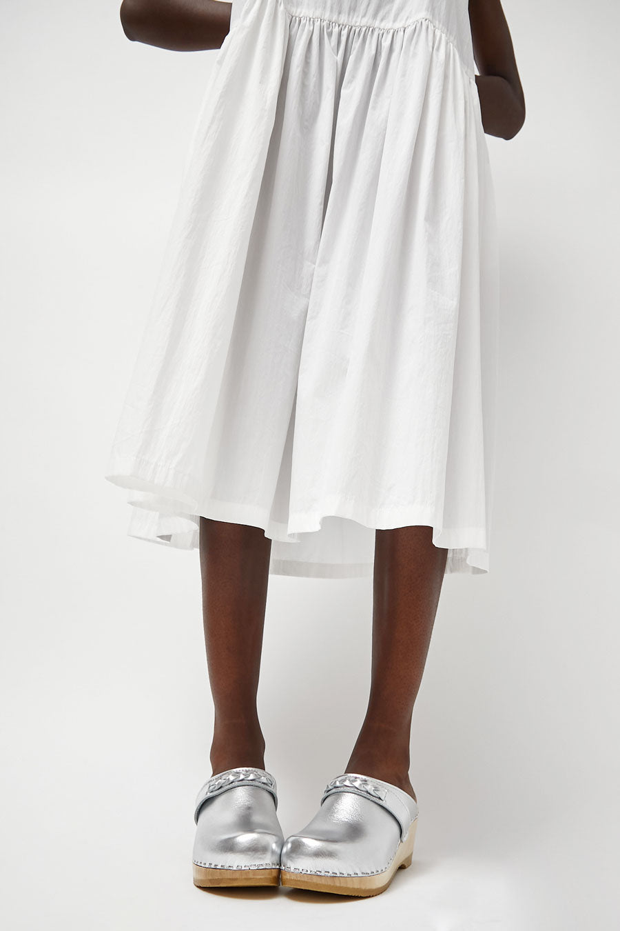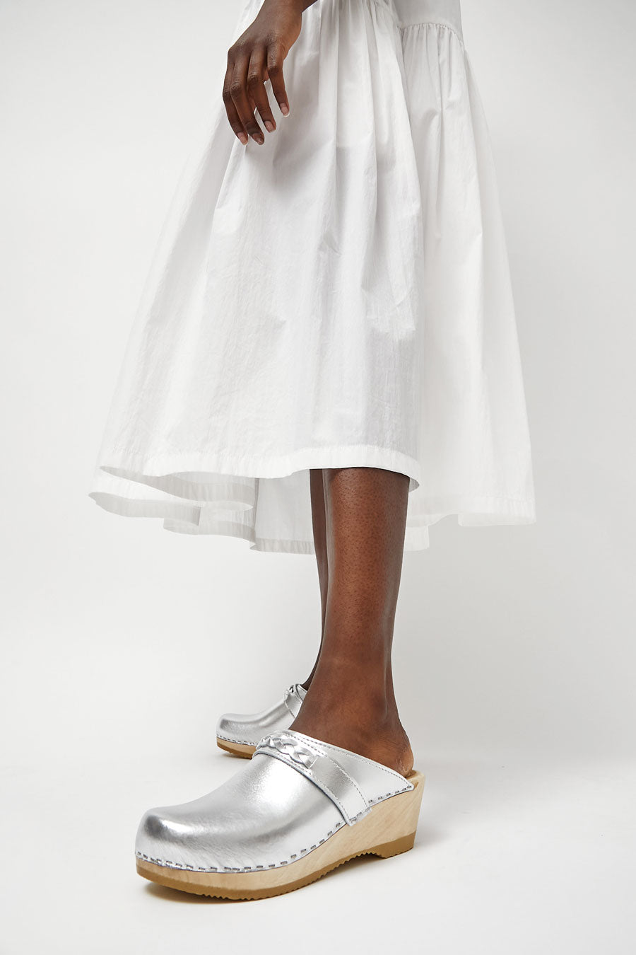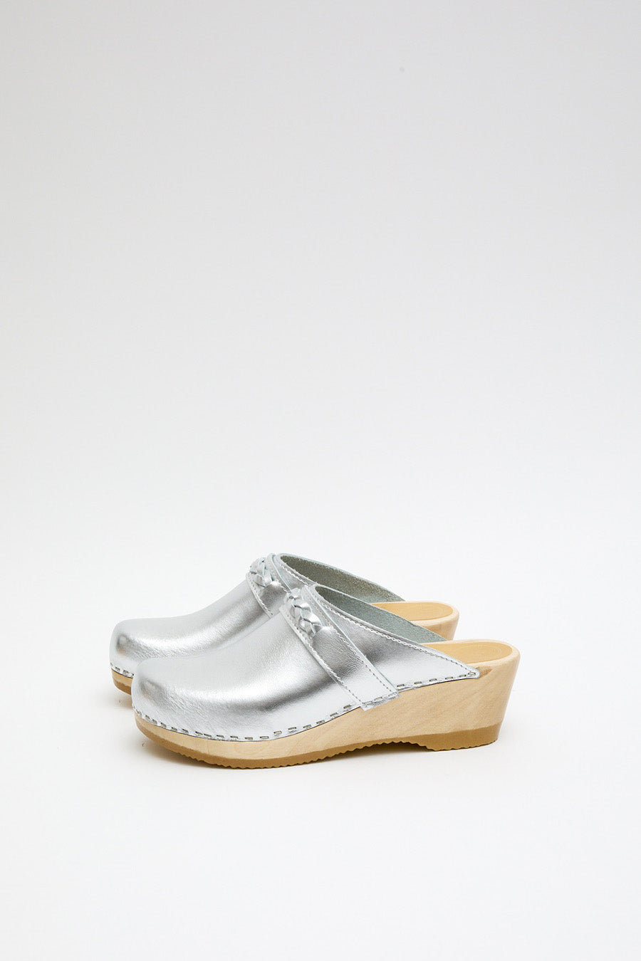 Slip on, closed toe clog with braided band detail on a comfy mid wedge base. High shine metallic leather upper. Stitched collar, slightly rounded toe and open back. Lacquered, lightweight wooden base.