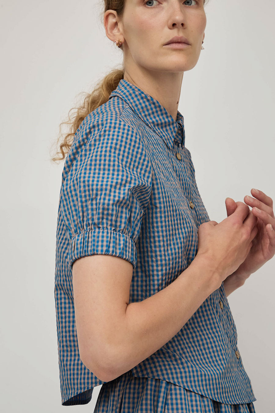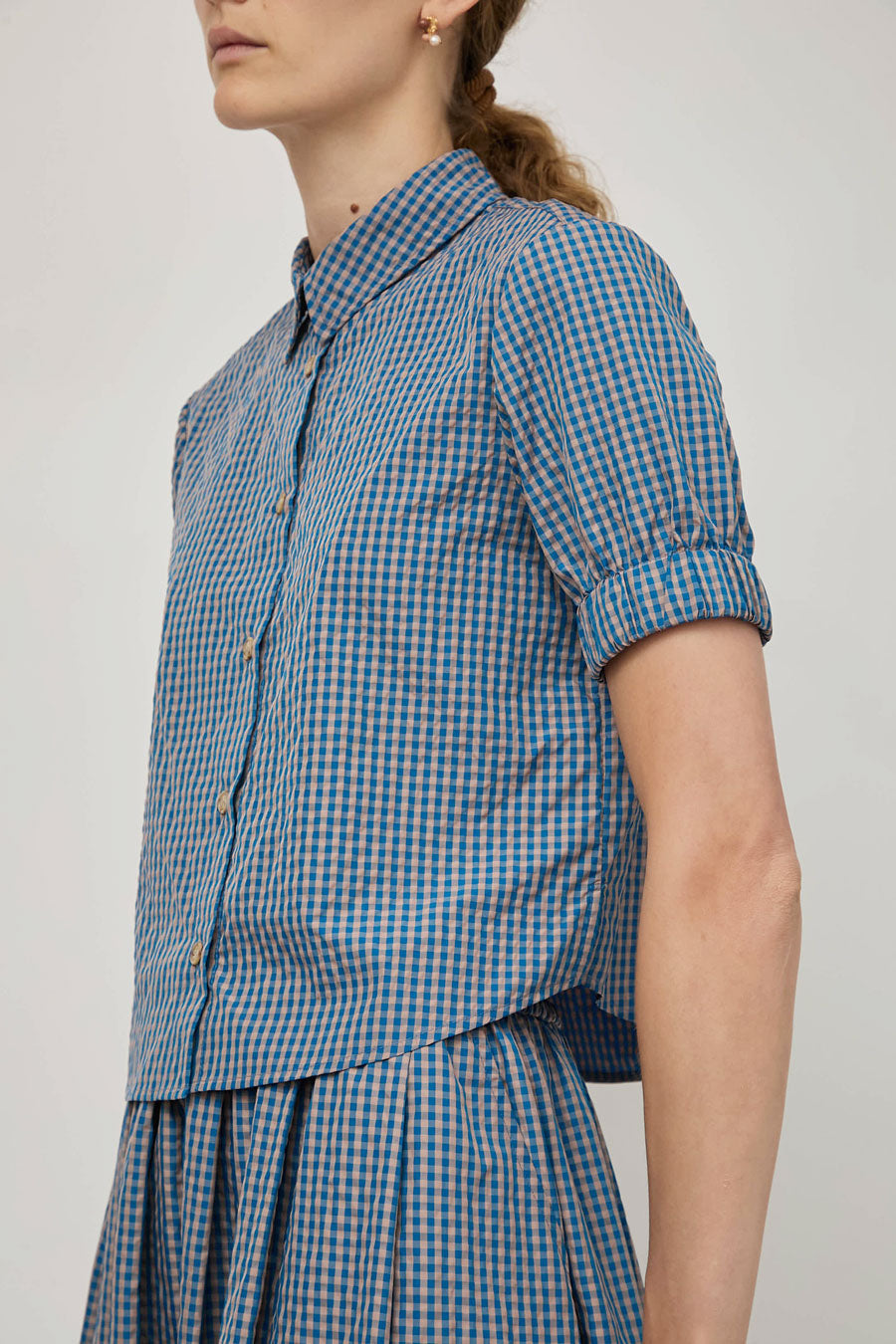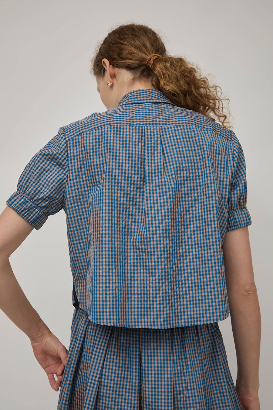Short sleeve collared button down cut in a textured nylon blend gingham. Cropped length and elasticated cuff. Lightweight sporty fabric makes this great for packing. For the full look, wear it with the No.6 Mel Skirt in Pink Gingham.