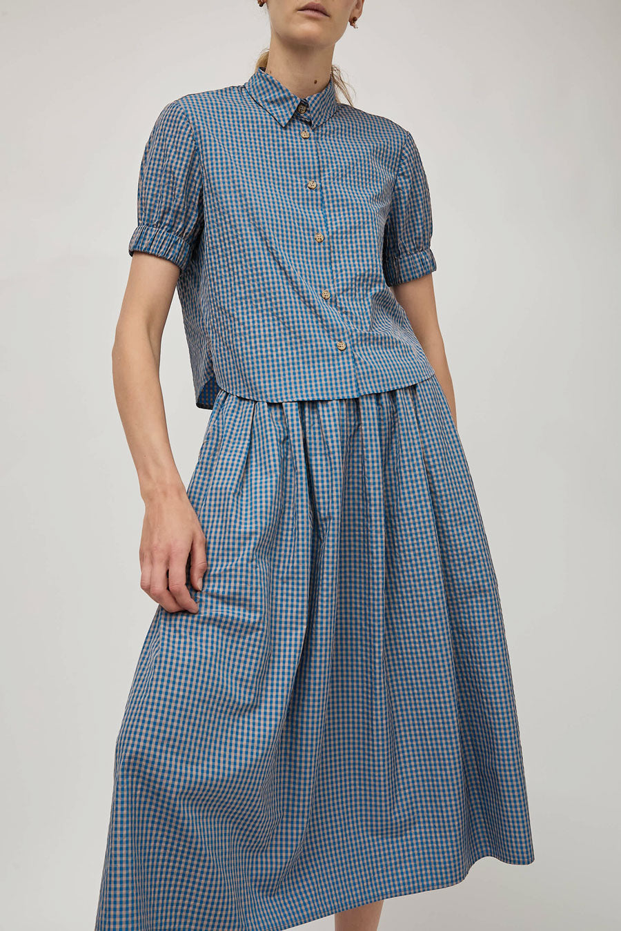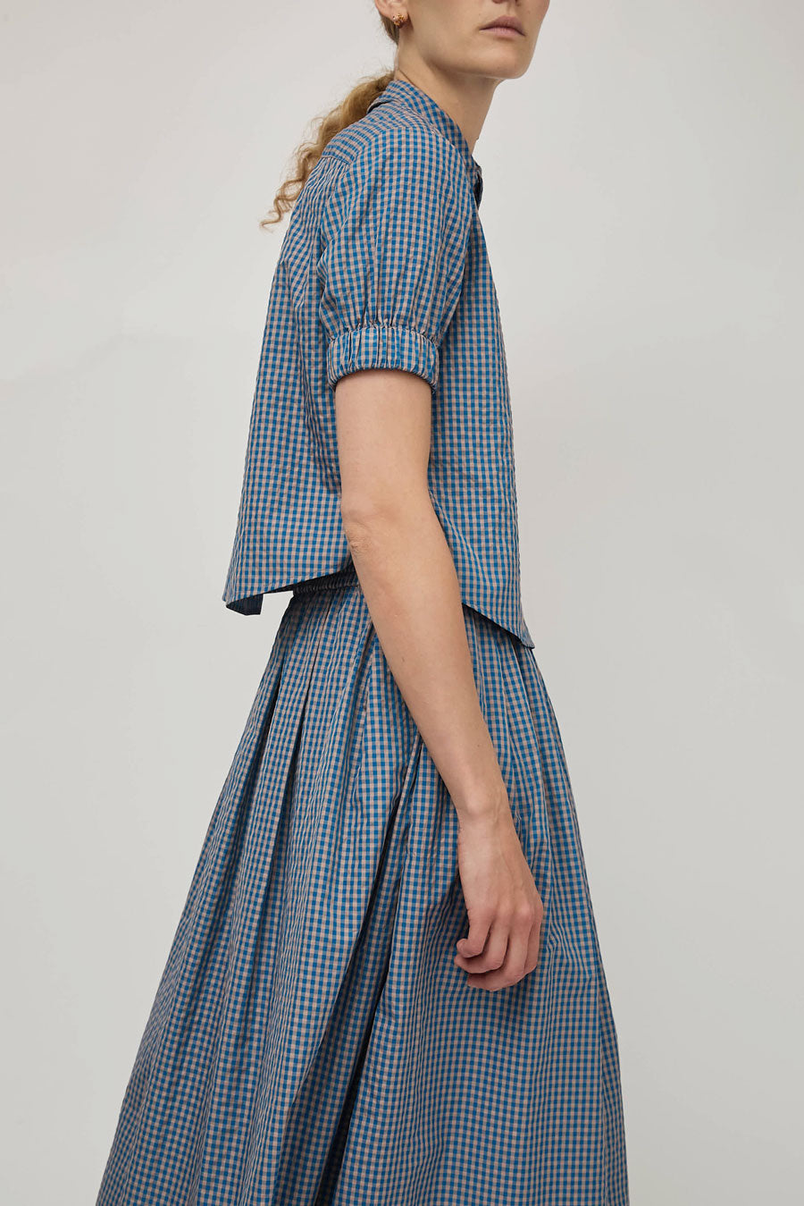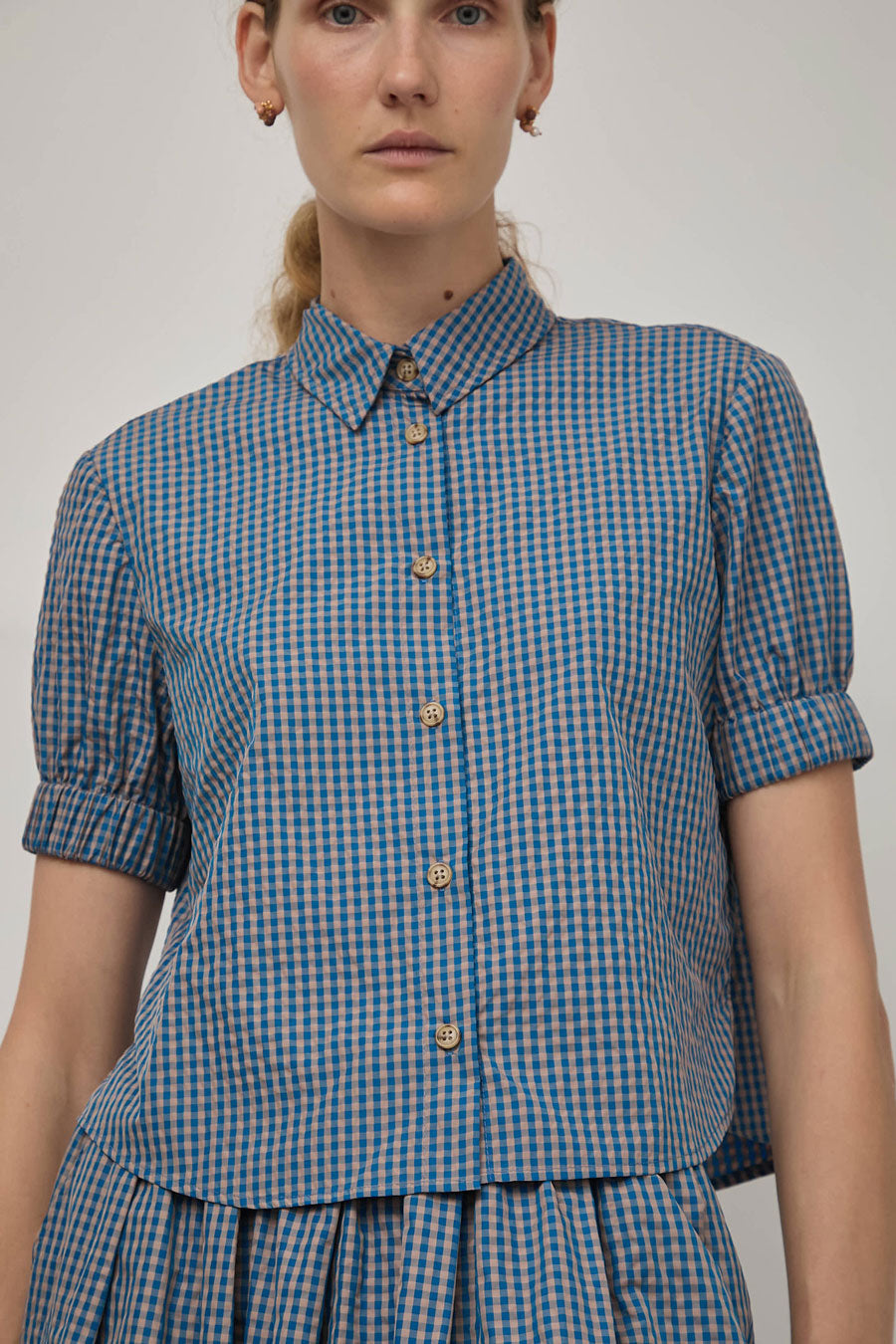 Short sleeve collared button down cut in a textured nylon blend gingham. Cropped length and elasticated cuff. Lightweight sporty fabric makes this great for packing. For the full look, wear it with the No.6 Mel Skirt in Pink Gingham.