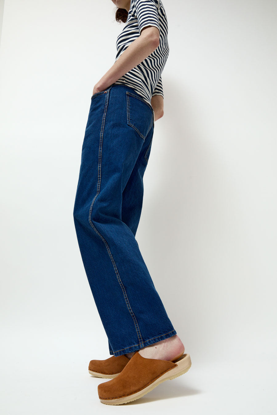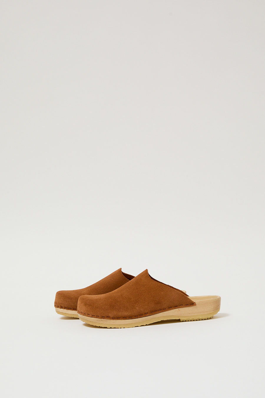 A No.6 favorite. Chic, modern, perfect for outdoor and indoor, socks or no socks. Clean lines, flat base, perfect all year round. Warm brown suede upper. Lacquered, lightweight wood base.