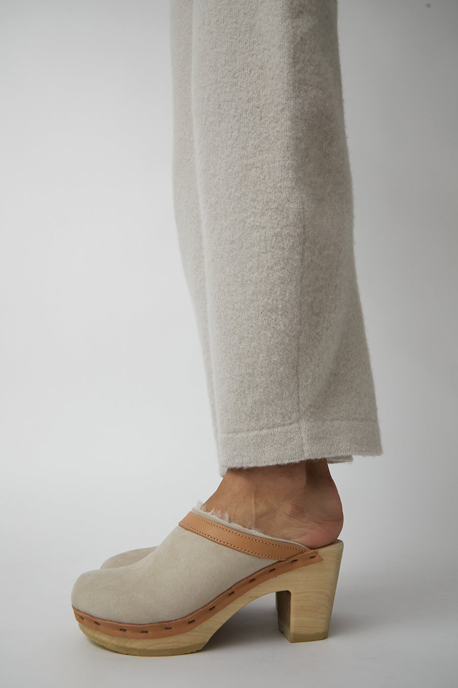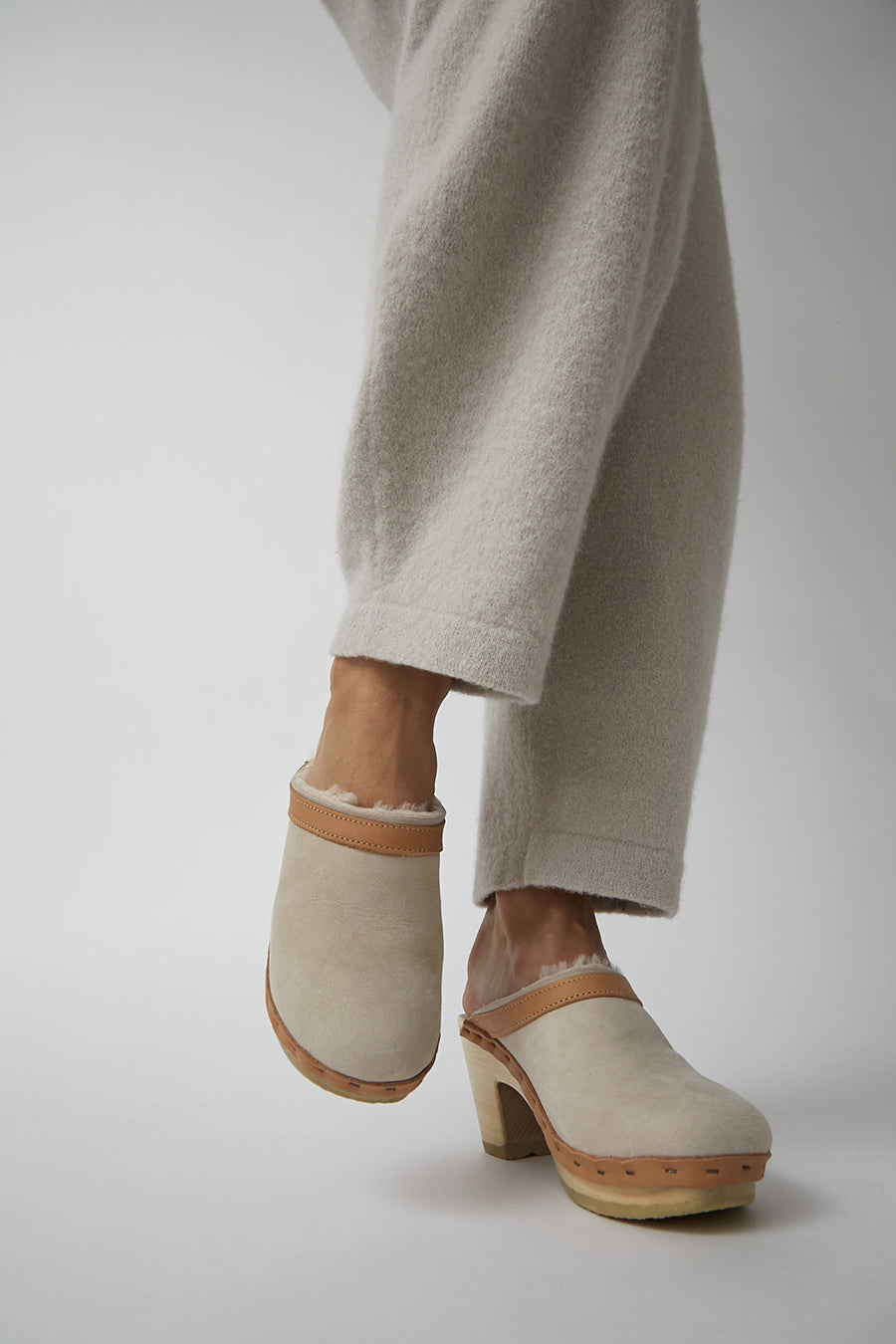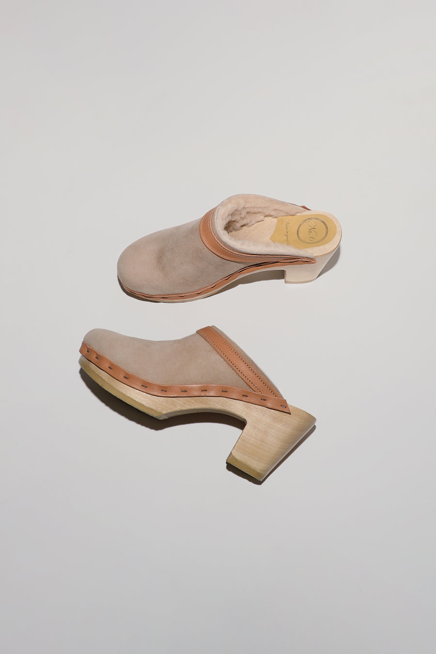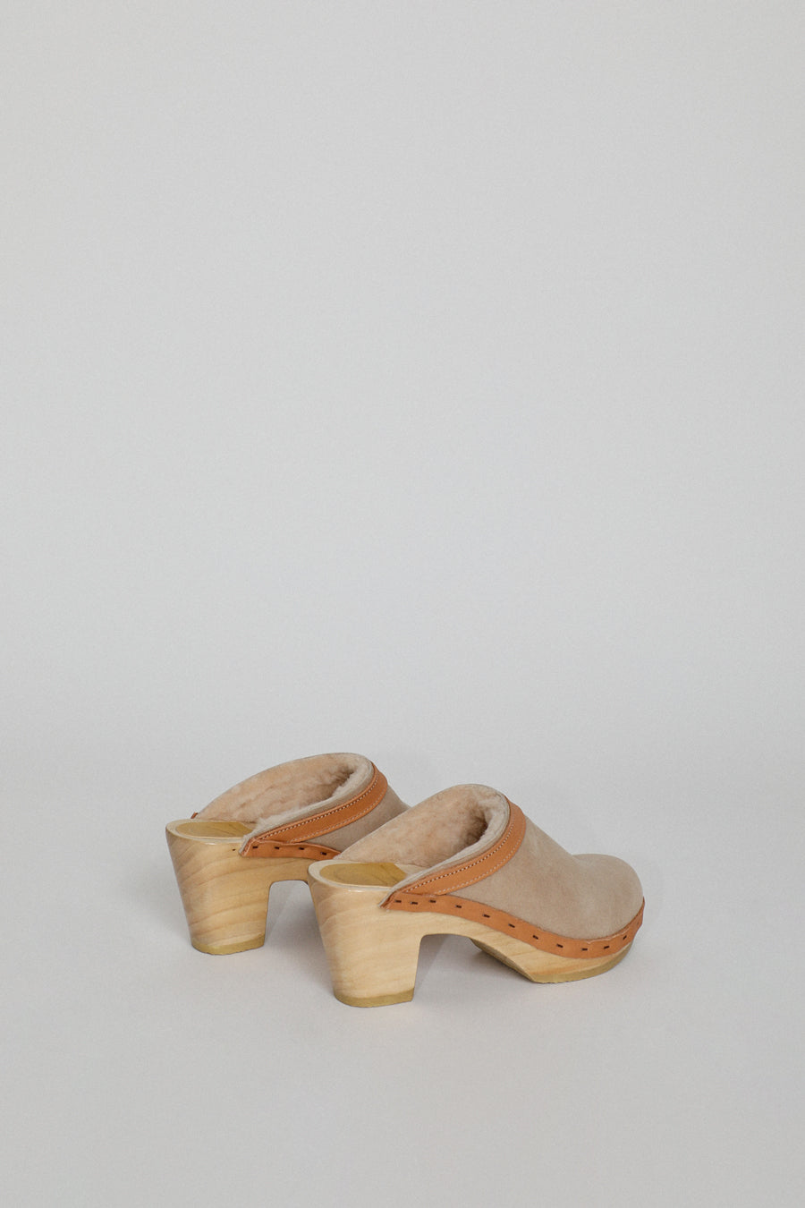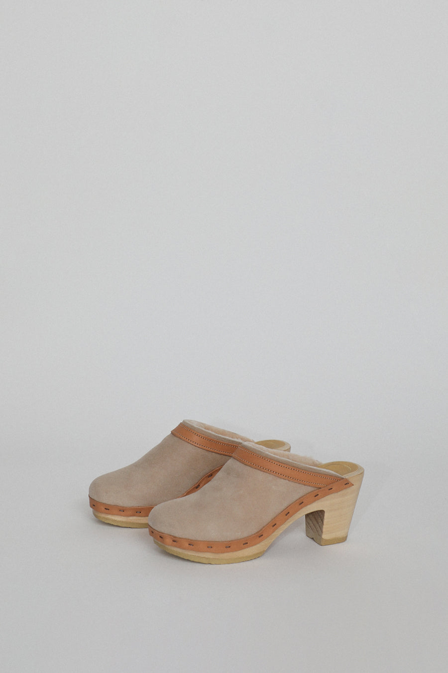 No.6 Dakota Shearling Clog on High Heel in Bone Suede and Desert