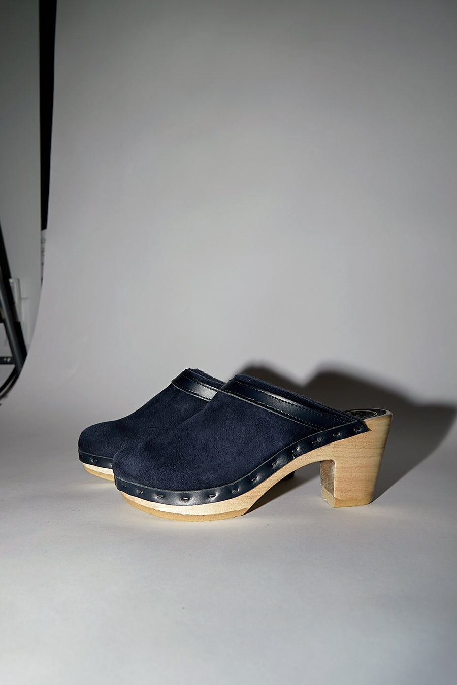 No.6 Dakota Shearling Clog on High Heel in Navy Suede and Night