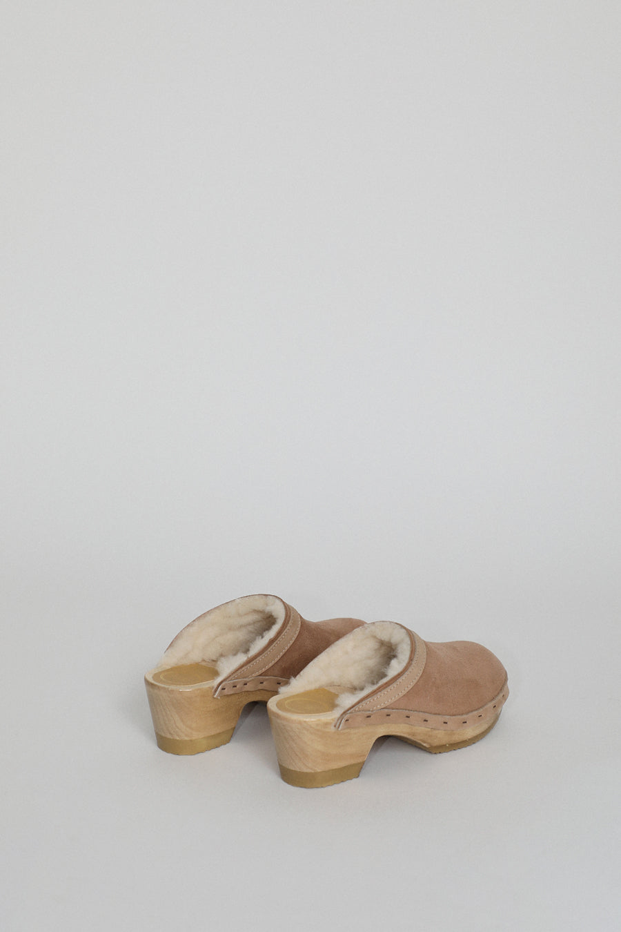 Slipper meet clog, clog meet slipper. Mid heel clog with sheepskin upper. Perfect for when the weather starts to get cold. We love this for indoors and outdoors. Fawn suede is a light tan suede with off-white shearling. Please note: This style has a low instep, initial fit may be snug. Upper will stretch and give with wear.