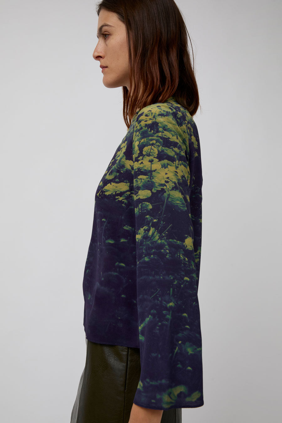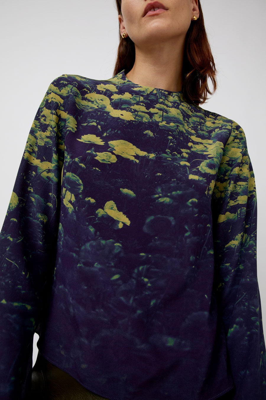 Modern silk blouse with long sleeves and mock neckline. Graphic floral print. An easy to wear wardrobe workhorse with striking, unique design details.