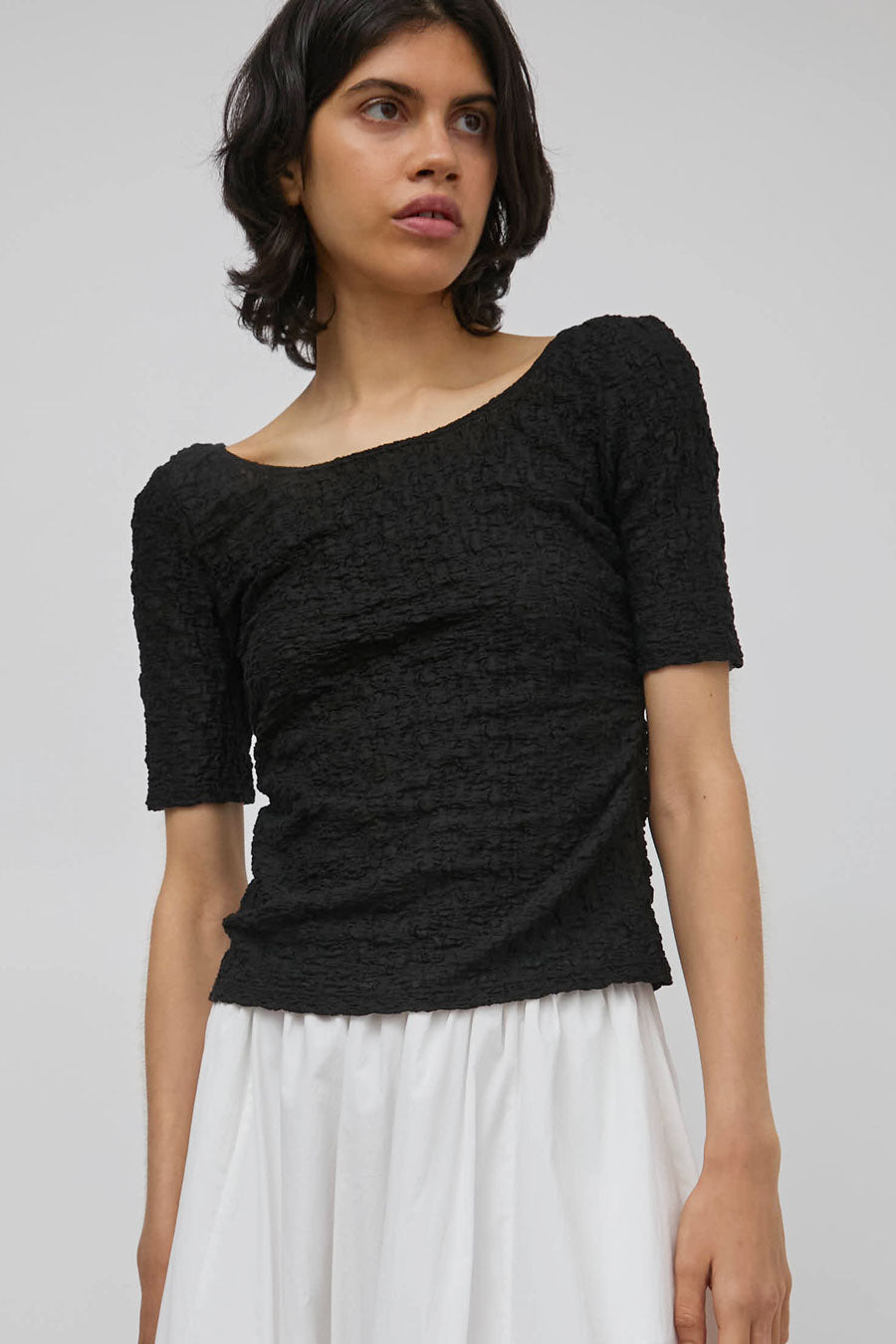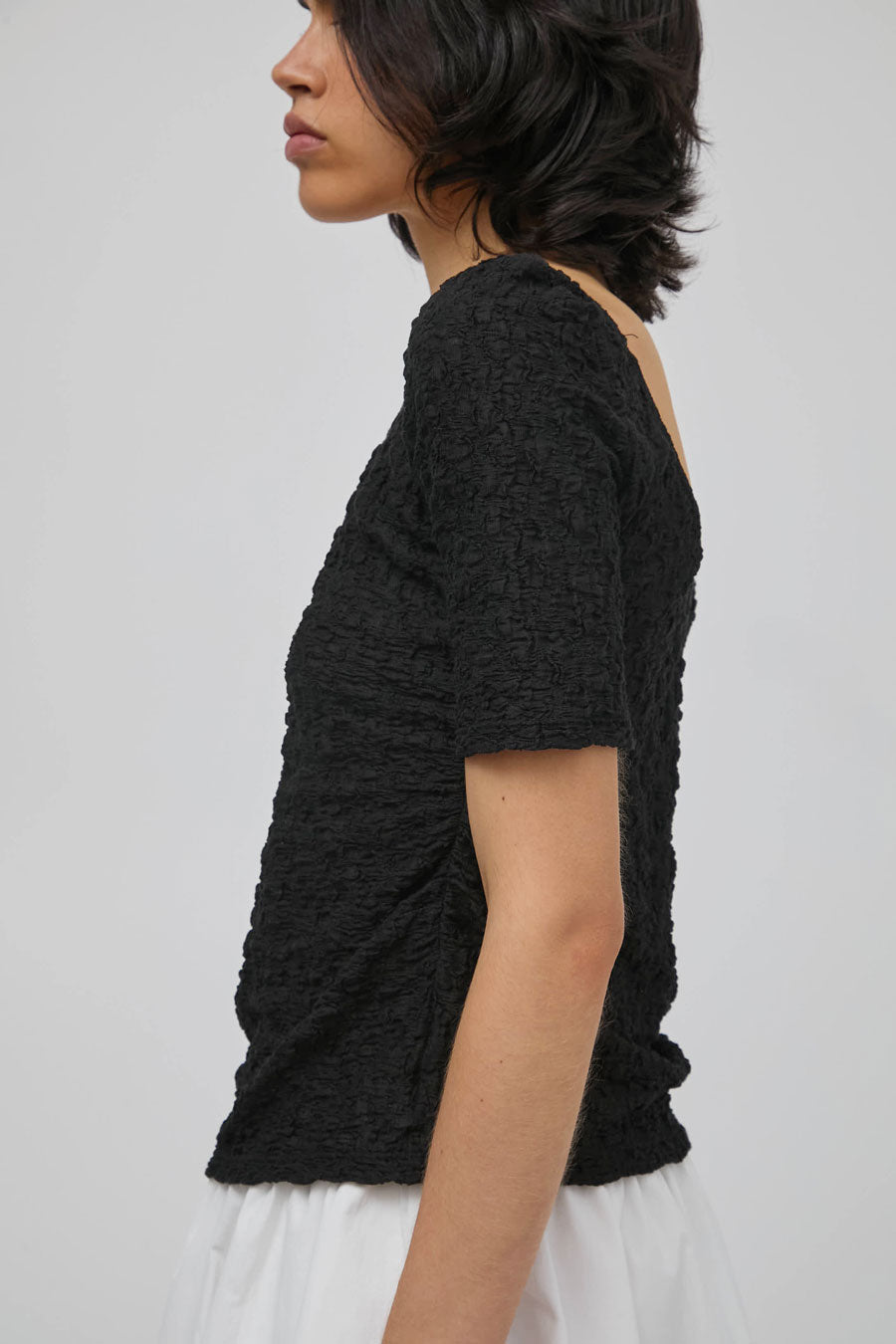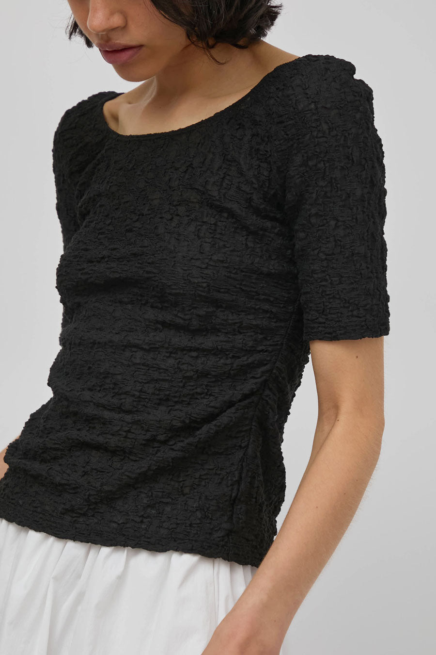 Textured cotton blend t-shirt with ruched side seams and a bit of vertical stretch. Slim fit with short sleeve and scoop neckline in front and back. Adds a little romance to your everyday wardrobe.