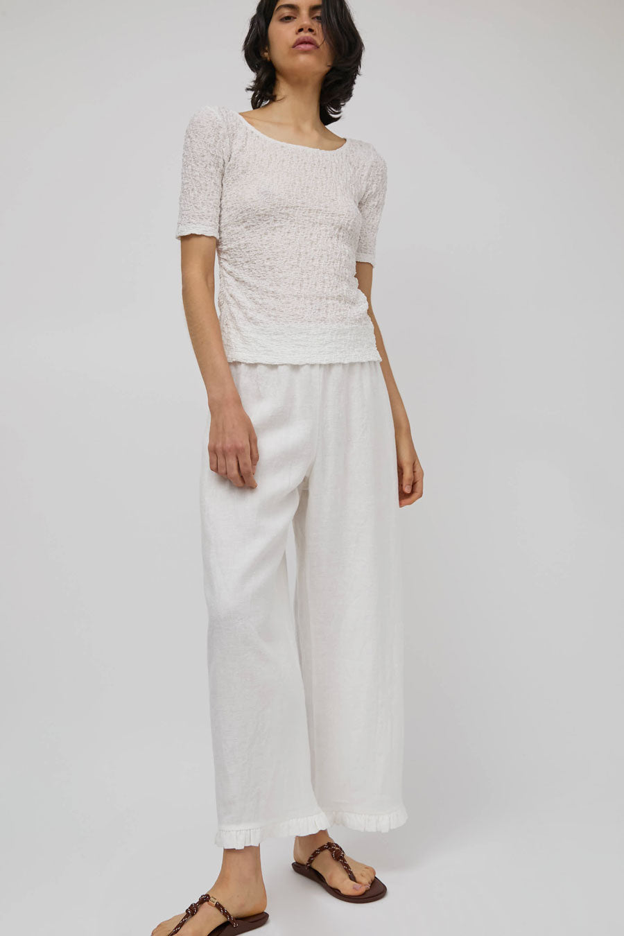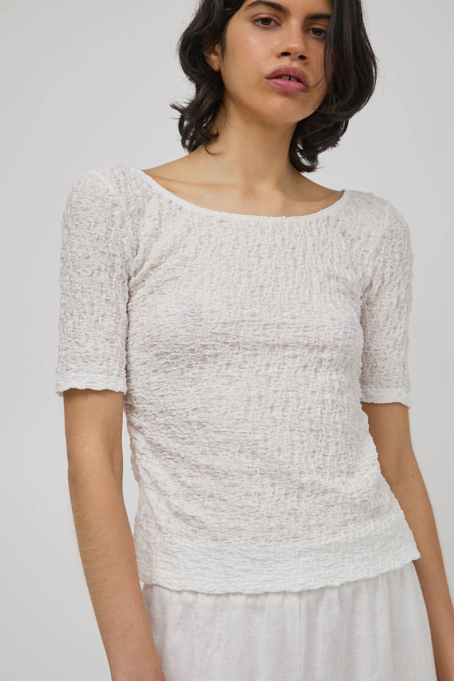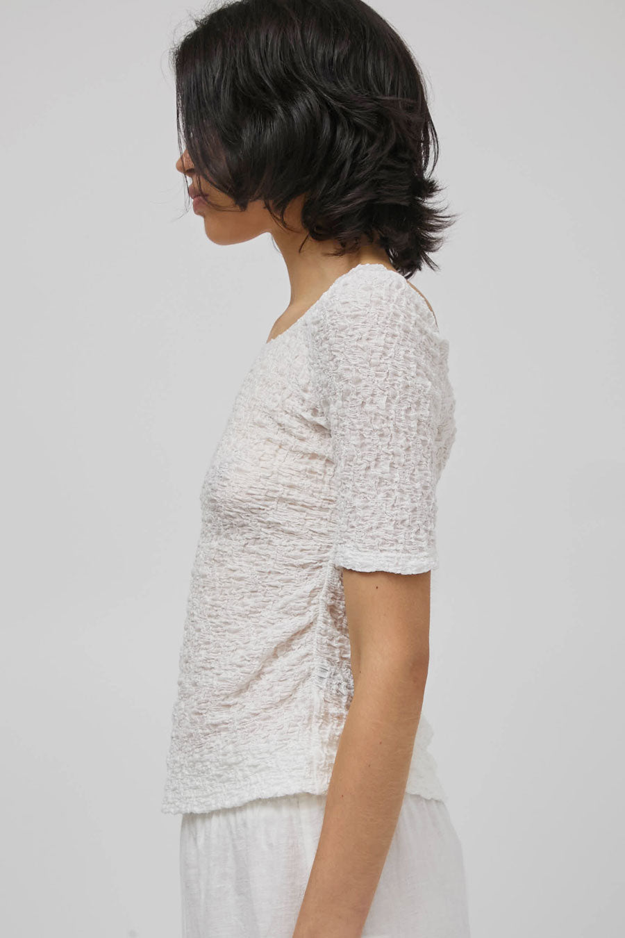 Textured cotton blend t-shirt with ruched side seams and a bit of vertical stretch. Slim fit with short sleeve and scoop neckline in front and back. Adds a little romance to your everyday wardrobe.
