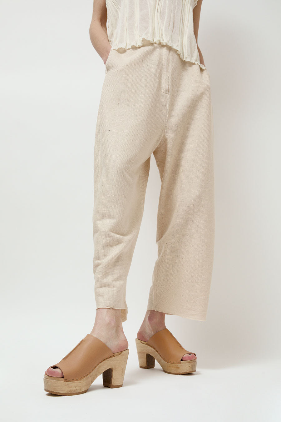 Open toe clog slide on platform heel. Warm, medium brown leather upper with top seam detail. Lacquered, lightweight wood base. Unlined.