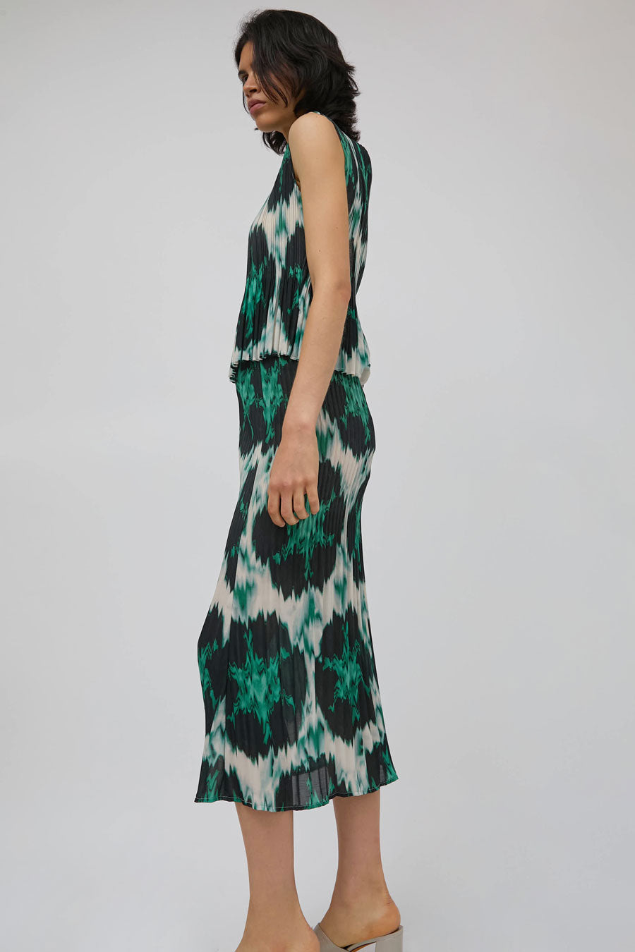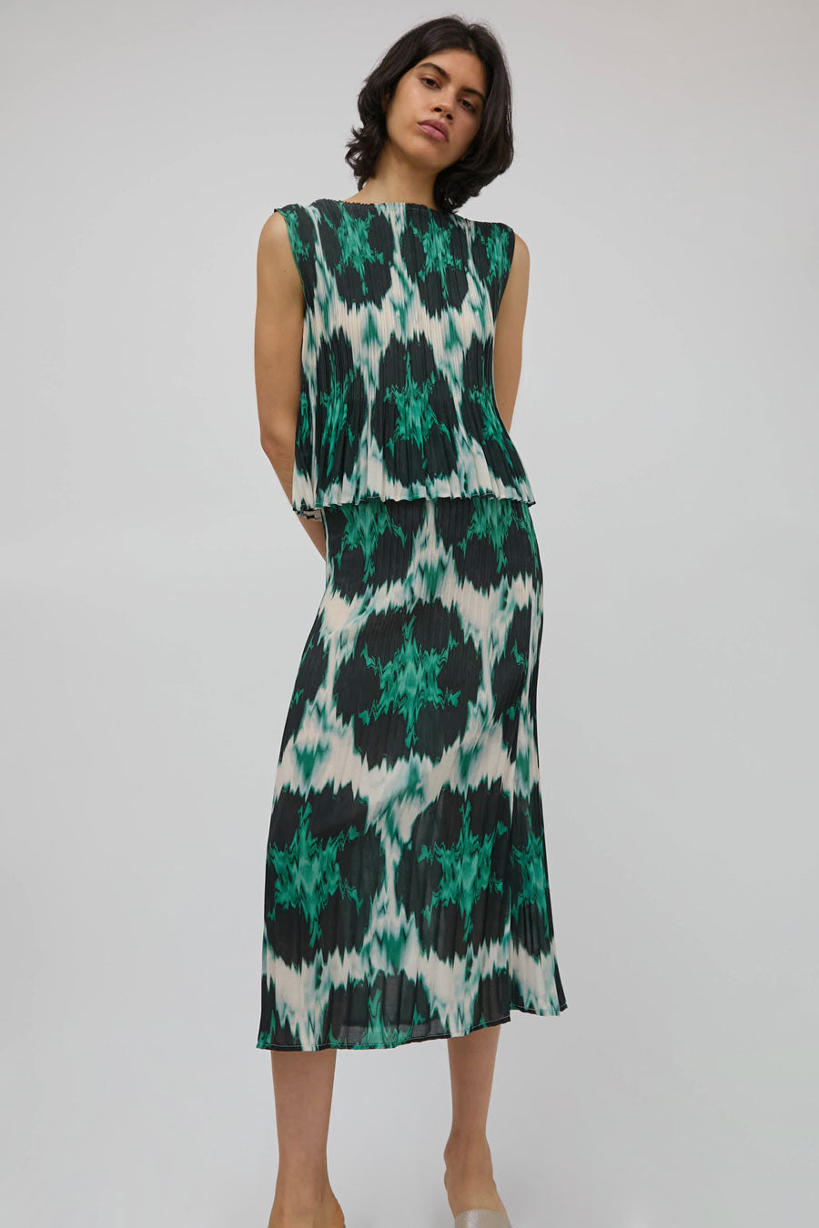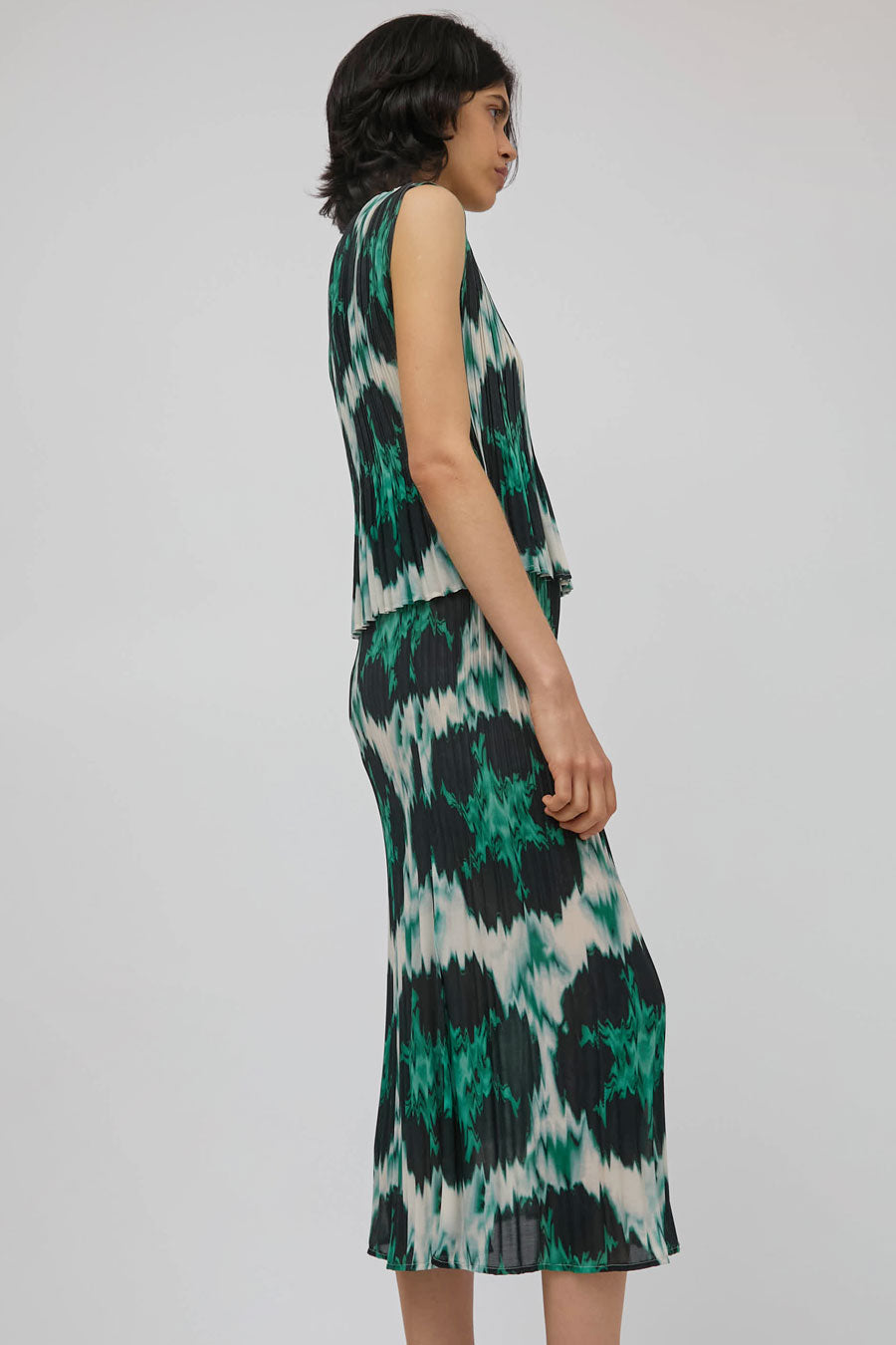 Easy to wear mid-length skirt in a bold abstract floral print. Pleated fabric with comfortable elasticated waistband. For the full look, wear with the No.6 Rae Tank in Emerald Ikat.