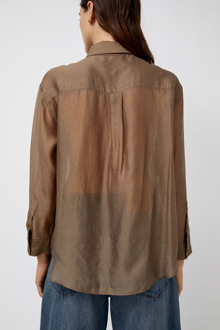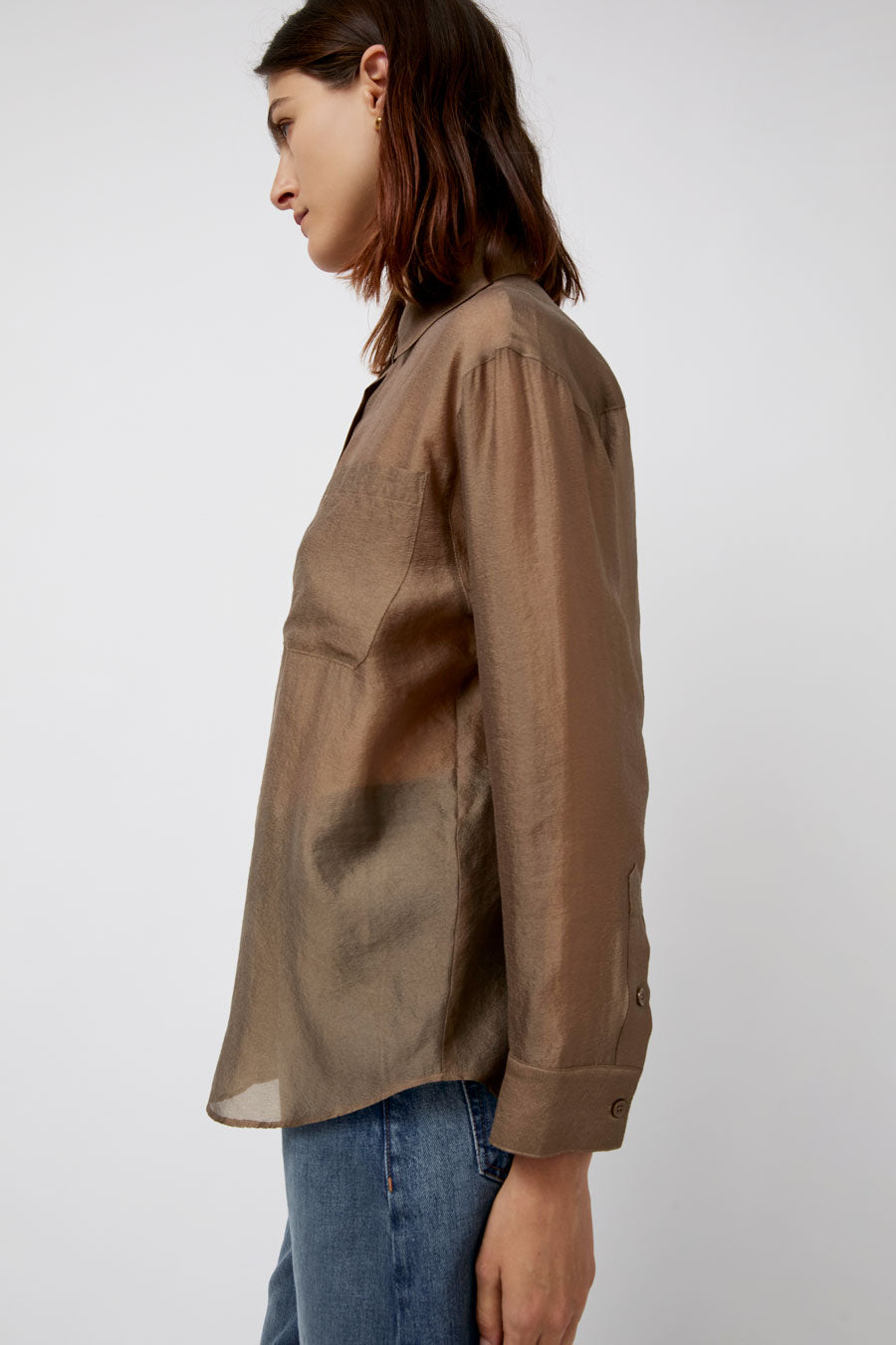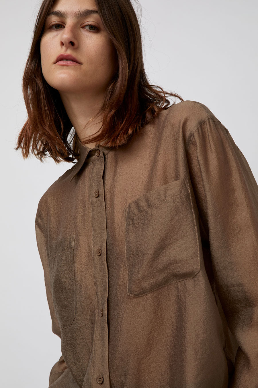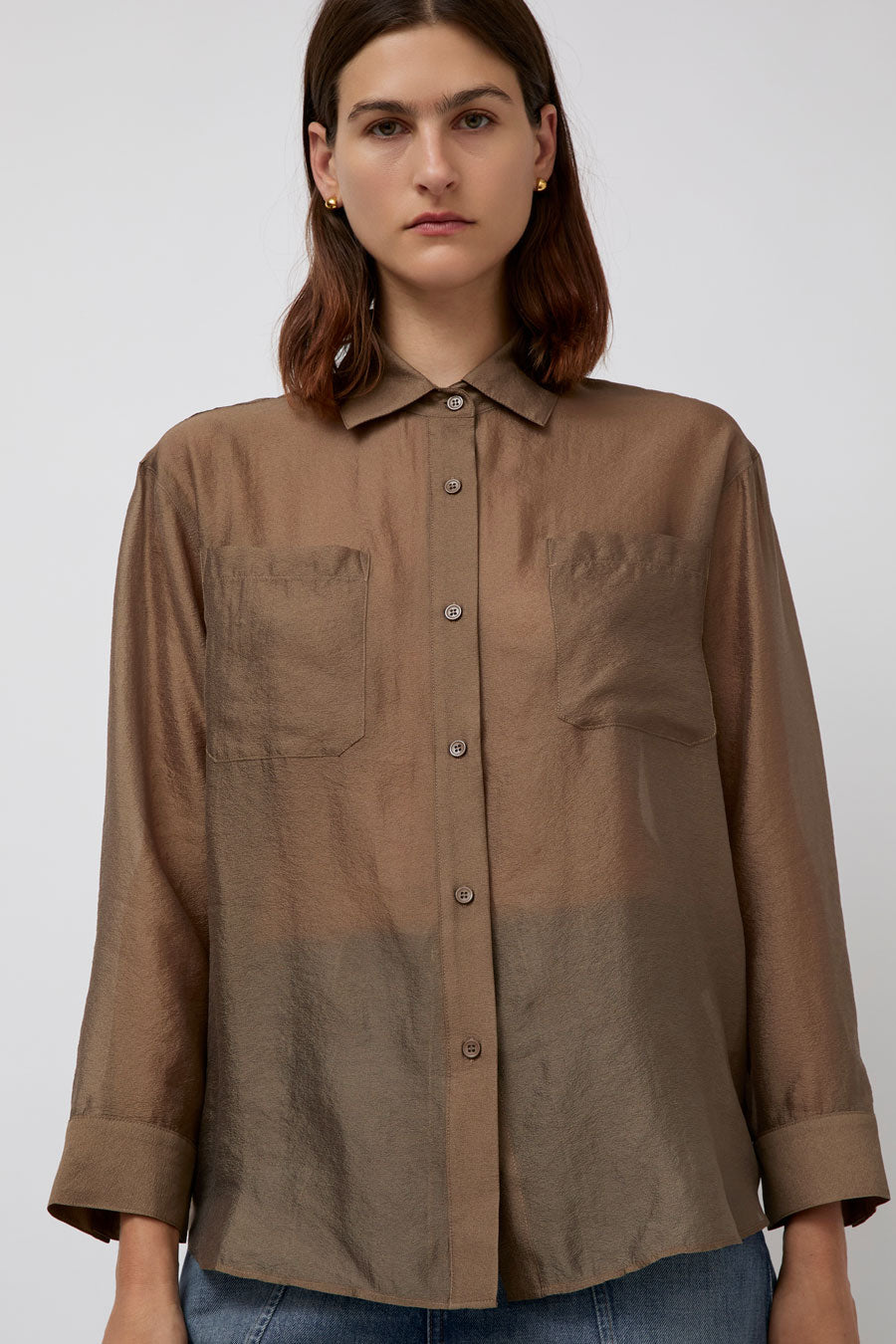 Classic collared button-down shirt in semi-sheer viscose blend. Front patch pockets. Easy to style. Looks great tucked or open as a duster.