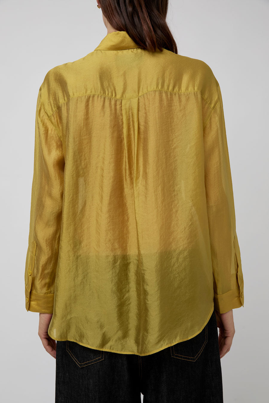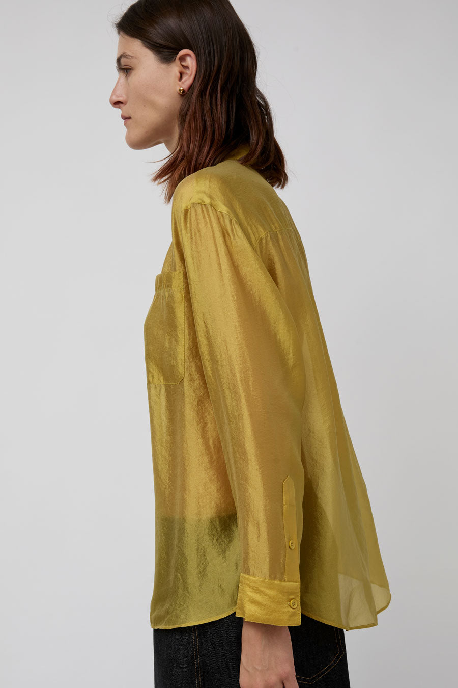 Classic collared button-down shirt in semi-sheer viscose blend. Front patch pockets. Easy to style. Looks great tucked or open as a duster.