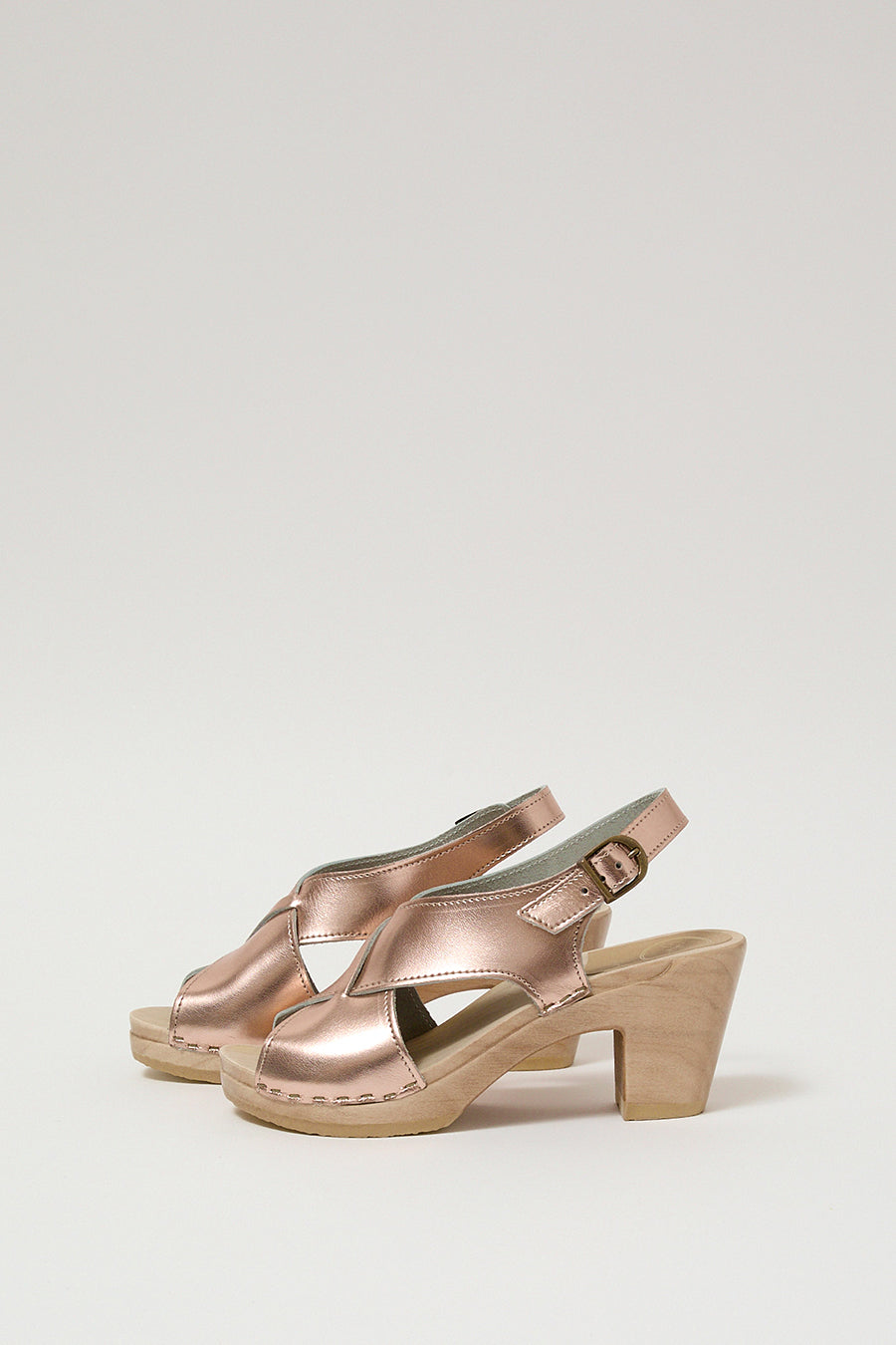 Cross front clog sandal with slingback strap on high heel. Metallic rose gold leather upper. Lacquered, lightweight wood base. Unlined. Surprisingly comfortable for a high heeled shoe. Unlined.