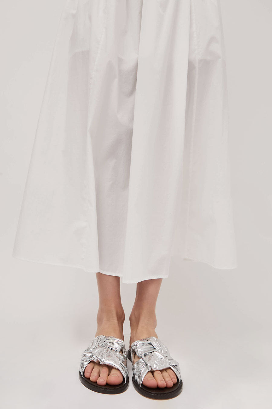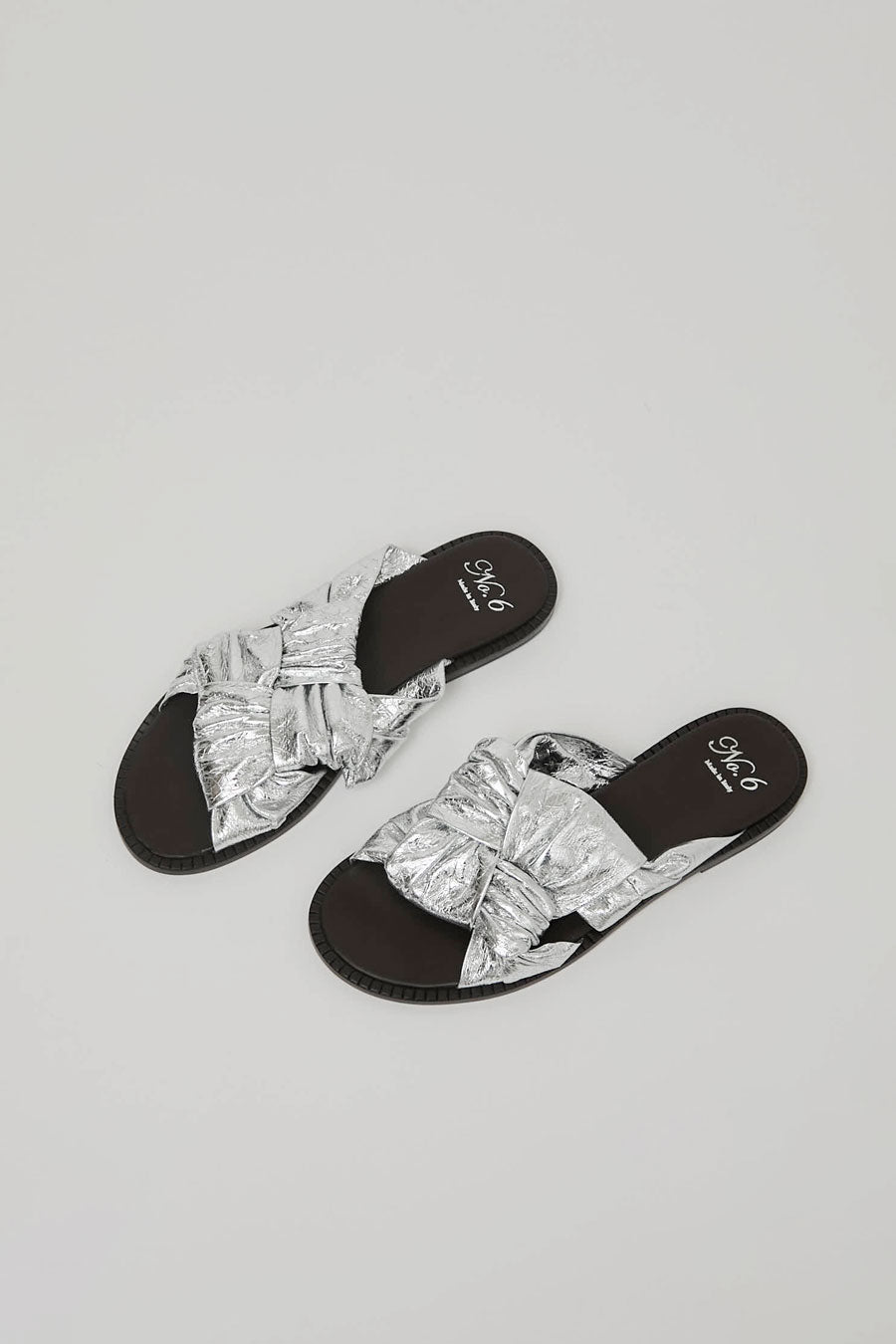 Flat sandal with buttery soft knotted leather upper. Slide on. Padded sole for added comfort. Intentionally taut upper for secure fit. Leather will give with wear.