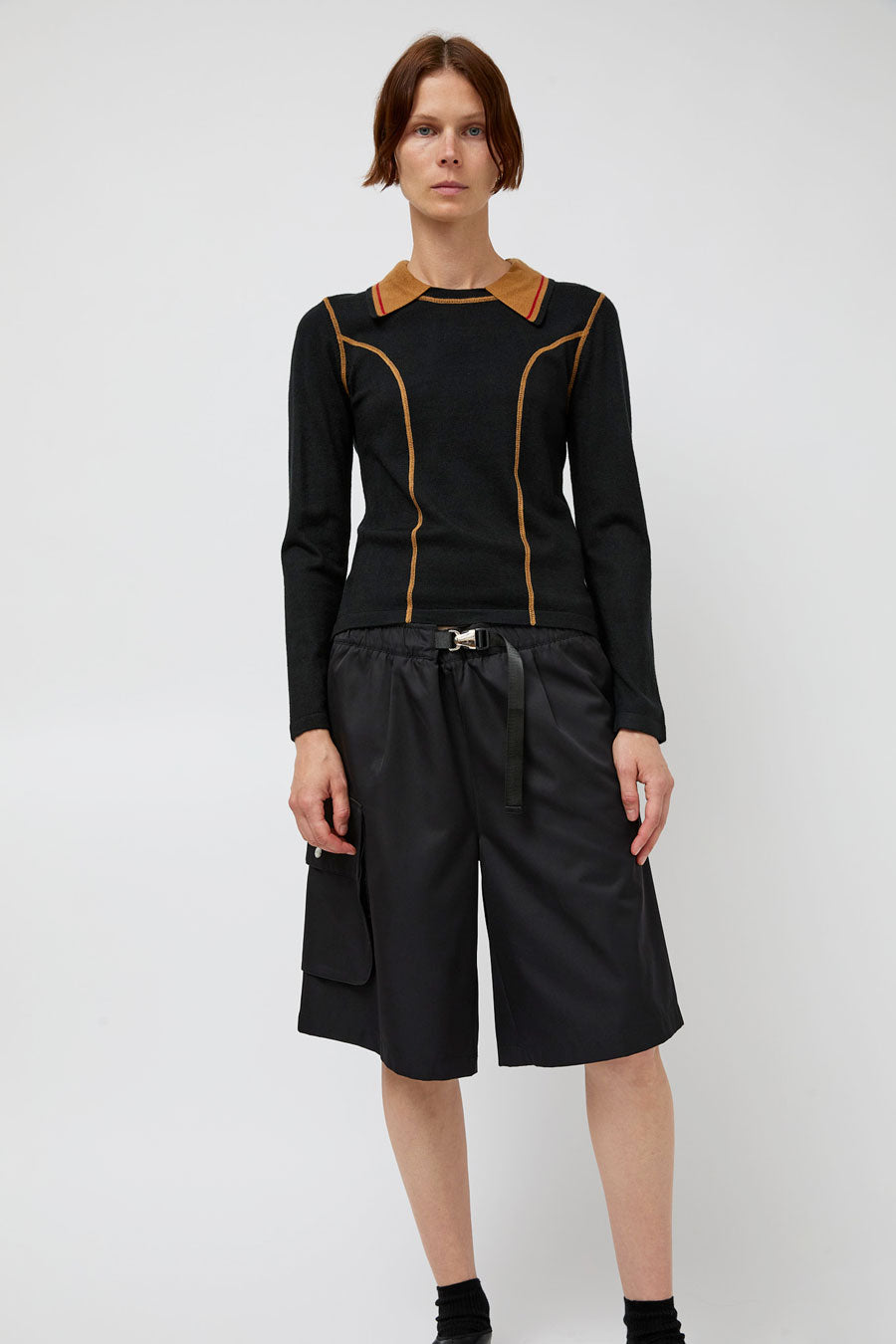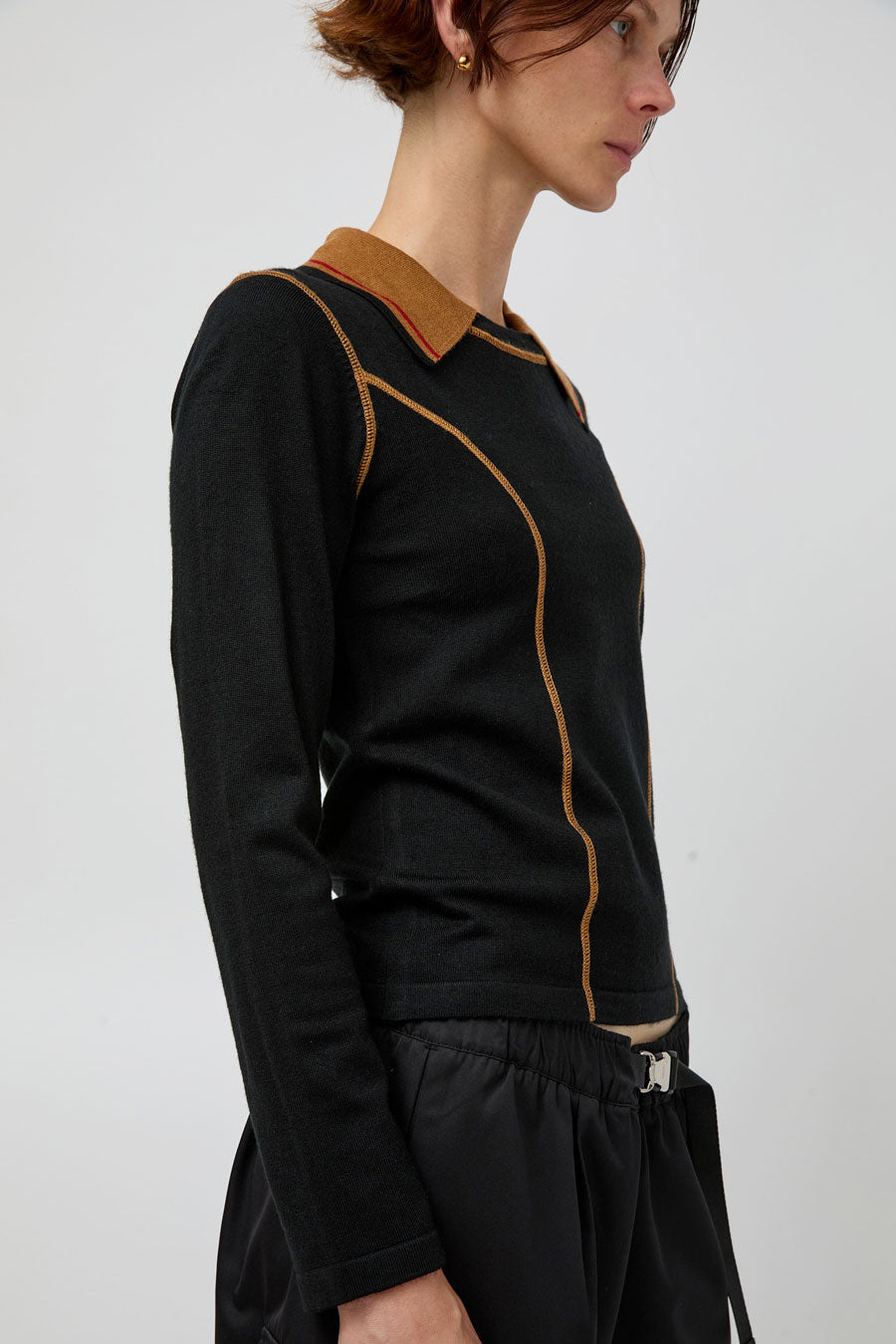 Knit long-sleeve shirt with contrast stitching. Contrasting colorblocked mock collar.
