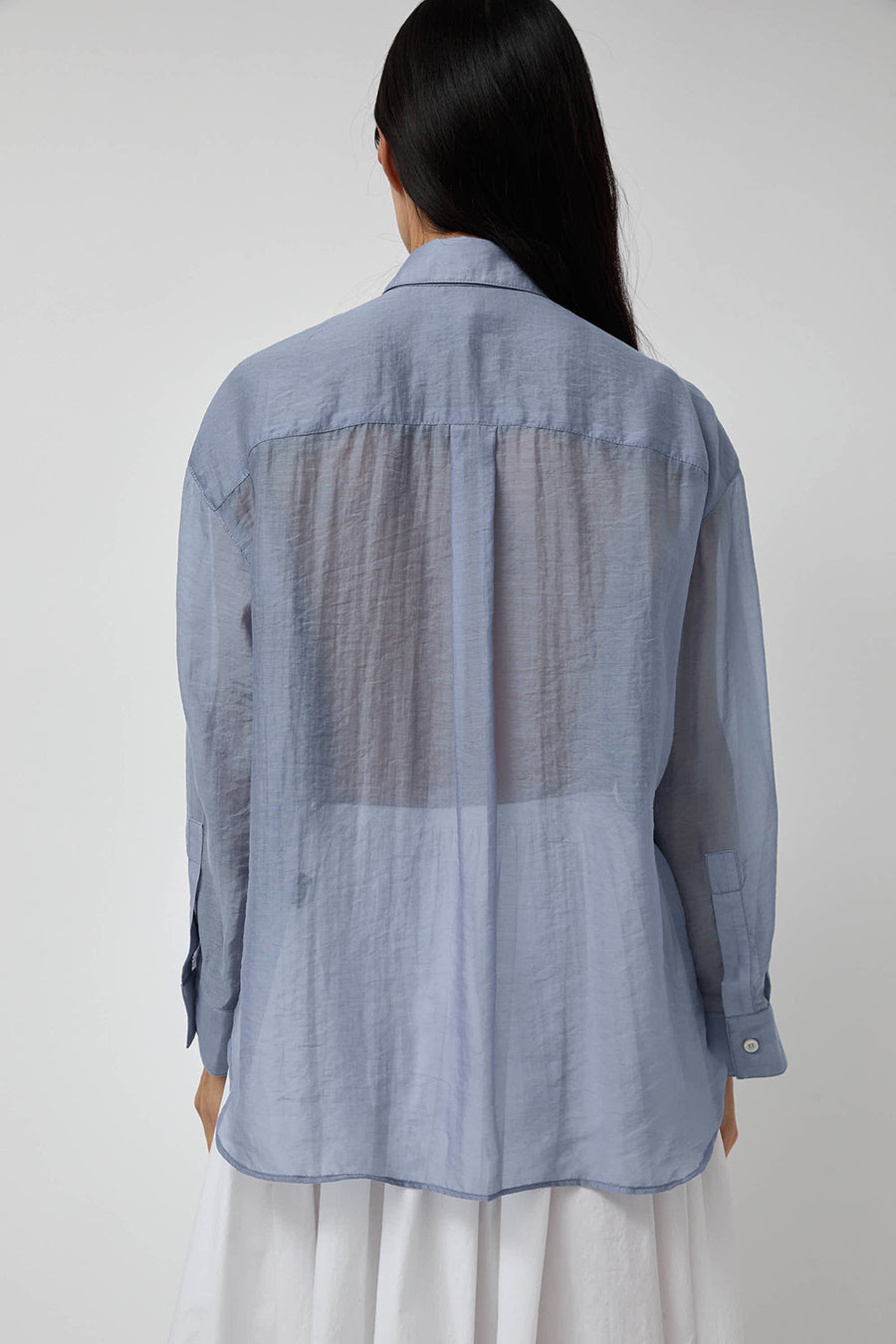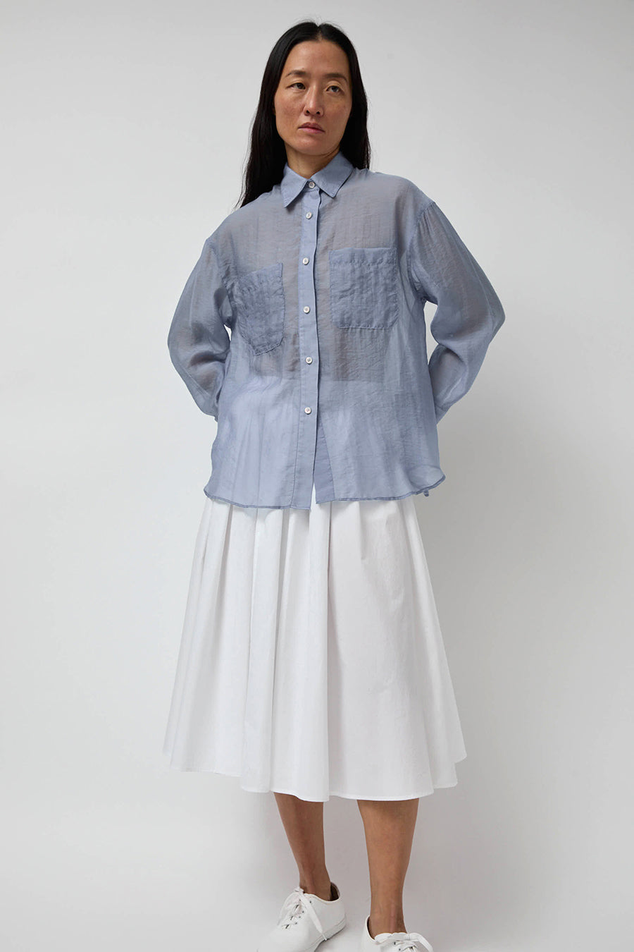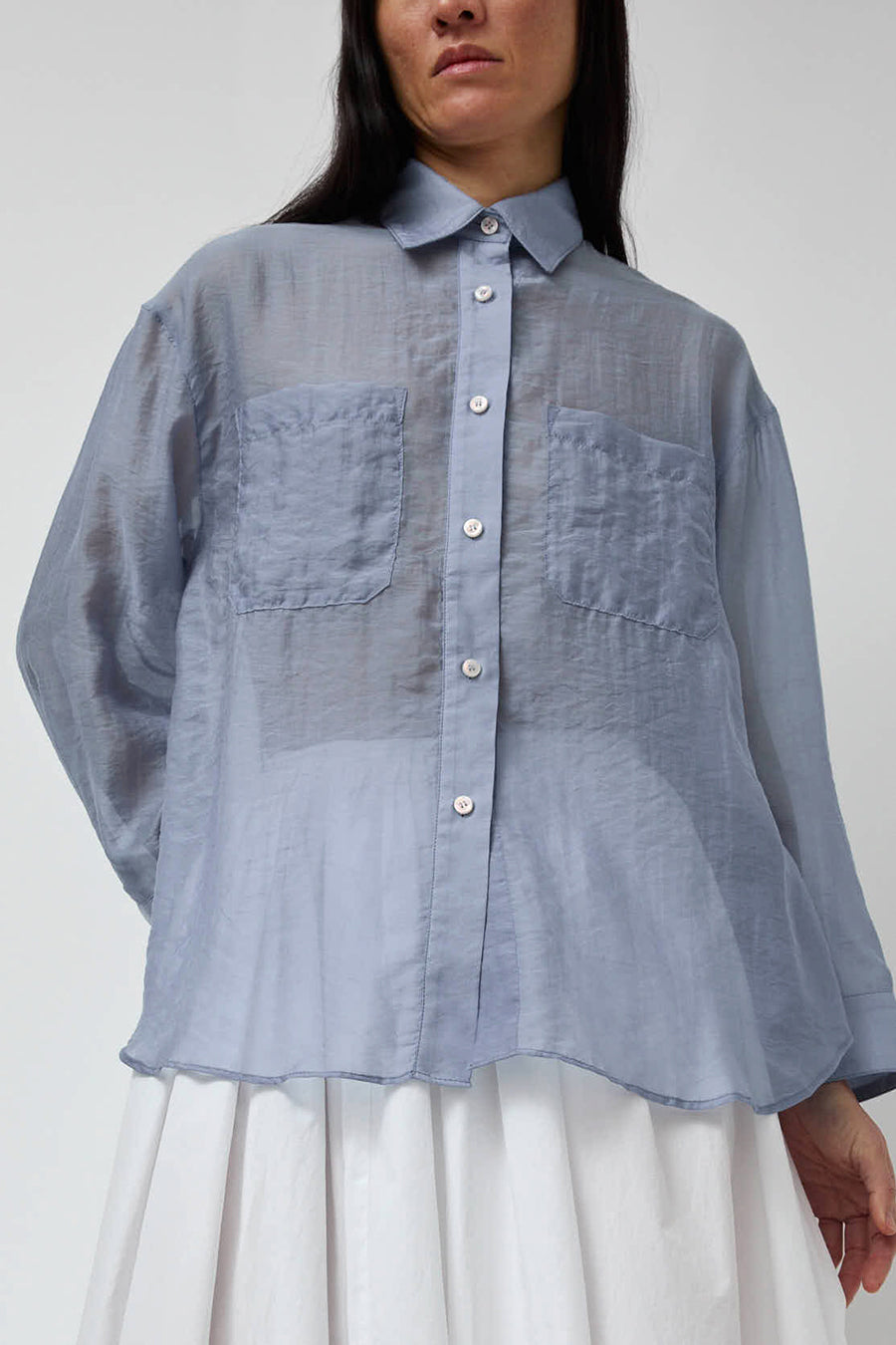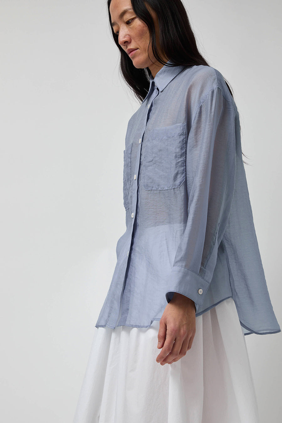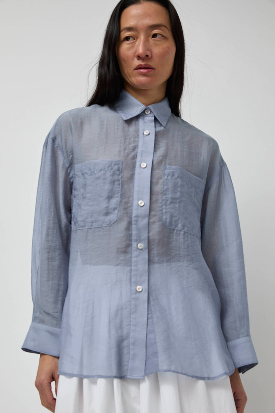 Classic collared button-down shirt in semi-sheer organza. Front patch pockets. Easy to style. Looks great tucked or open as a duster.