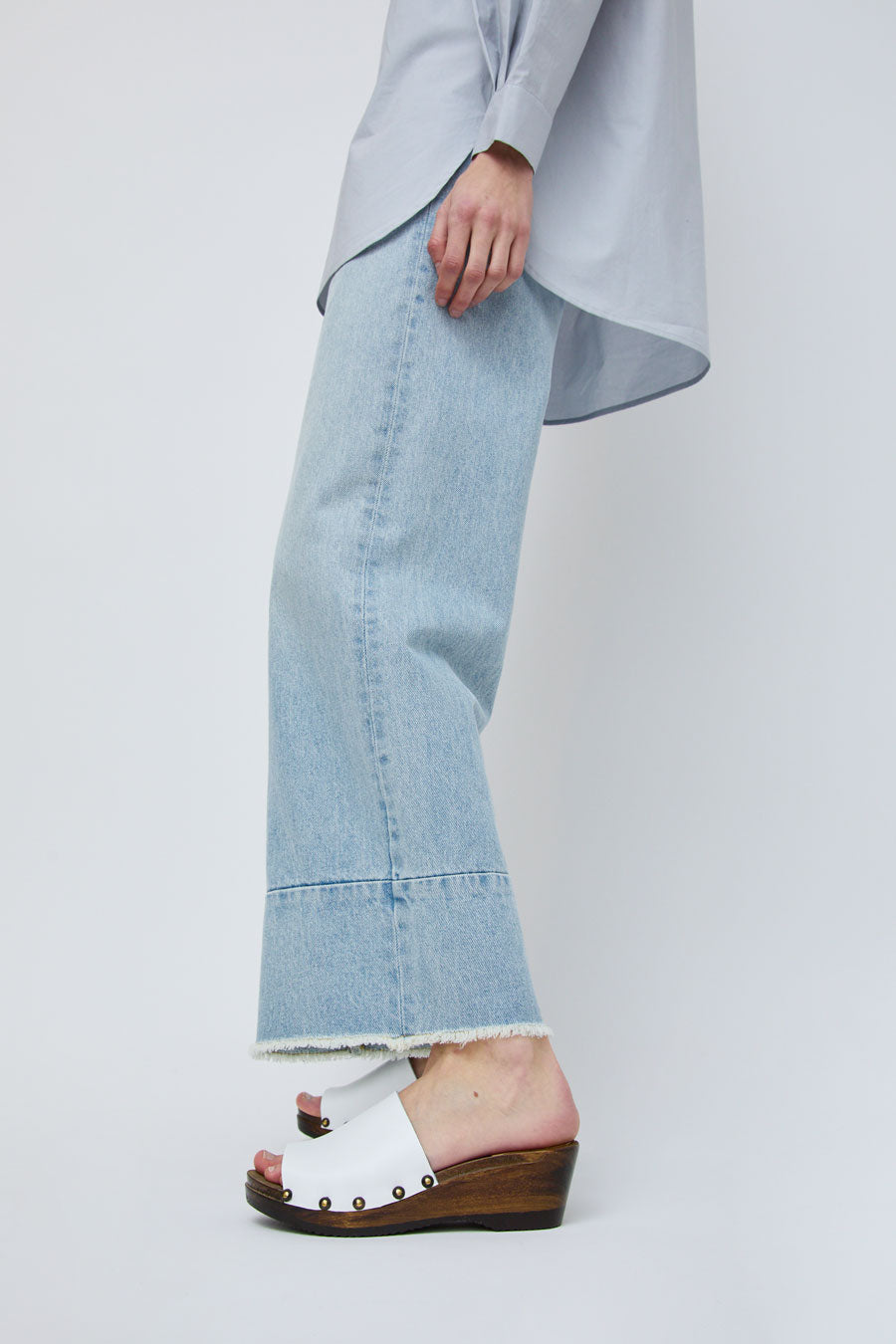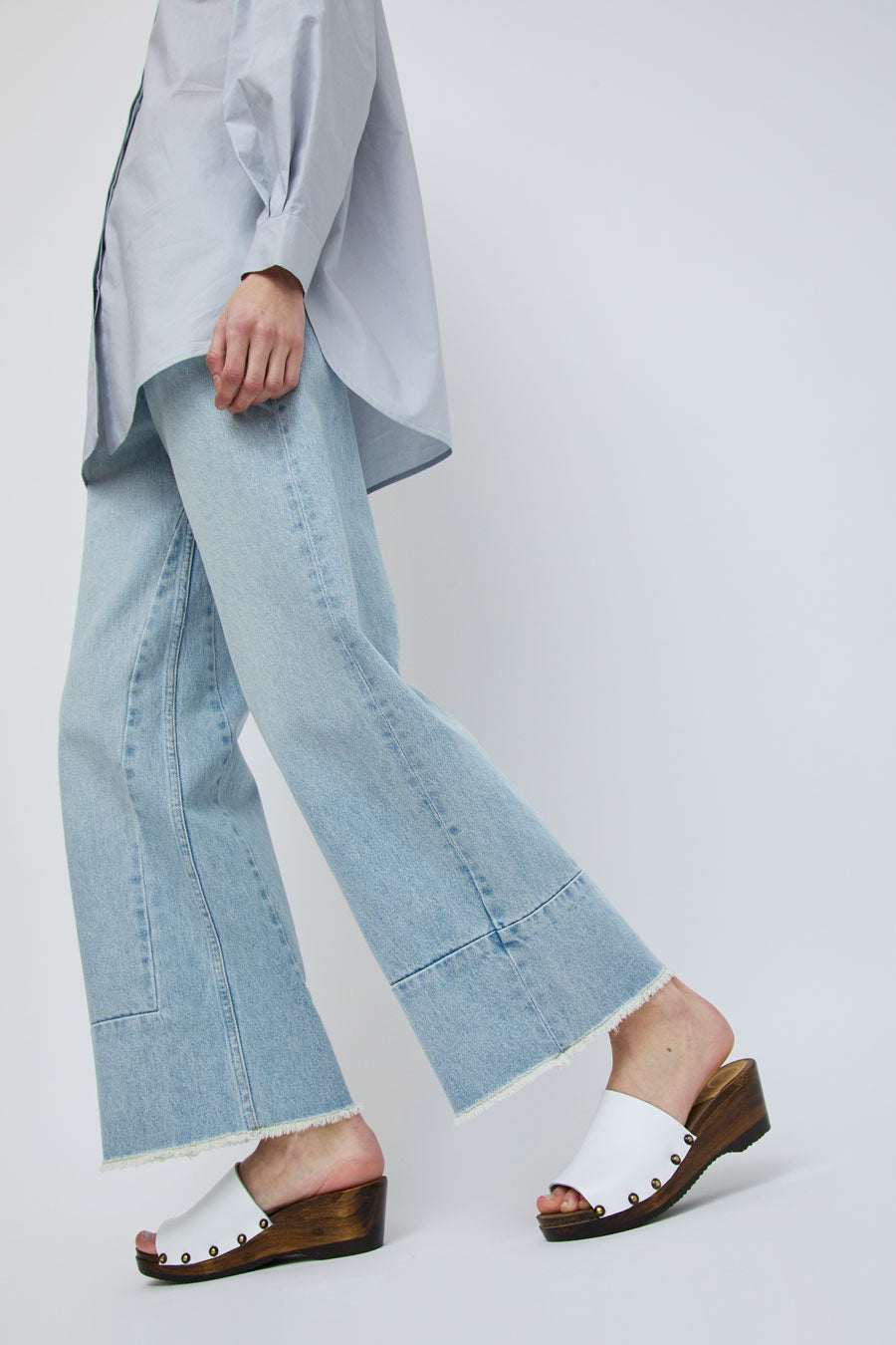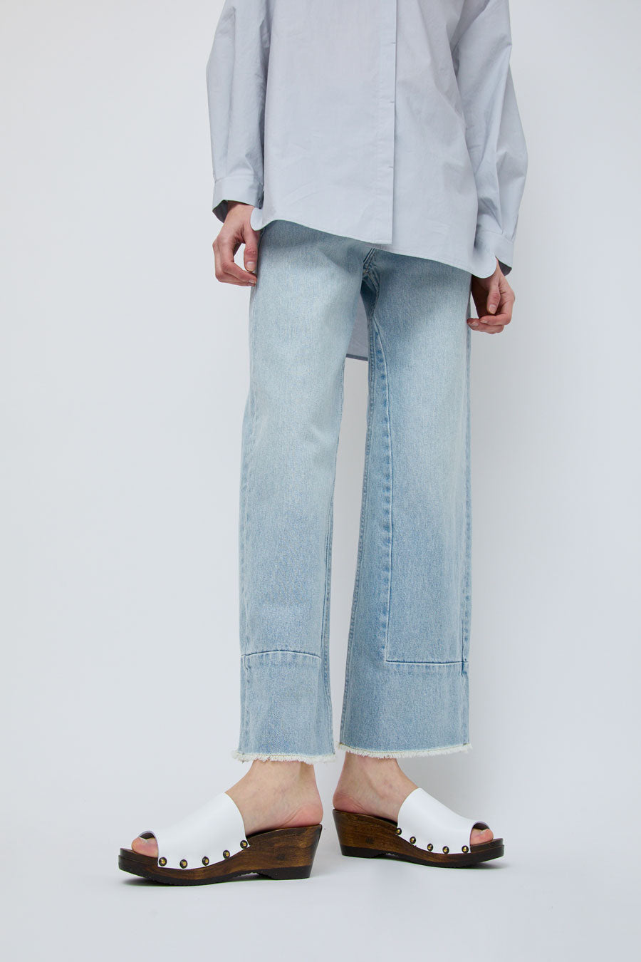New this season. Open toe mule with stud detailing on stained mid wedge base. Smooth white leather upper. Lacquered, lightweight wood base. Unlined.