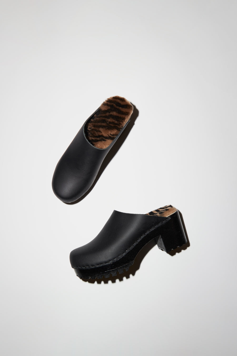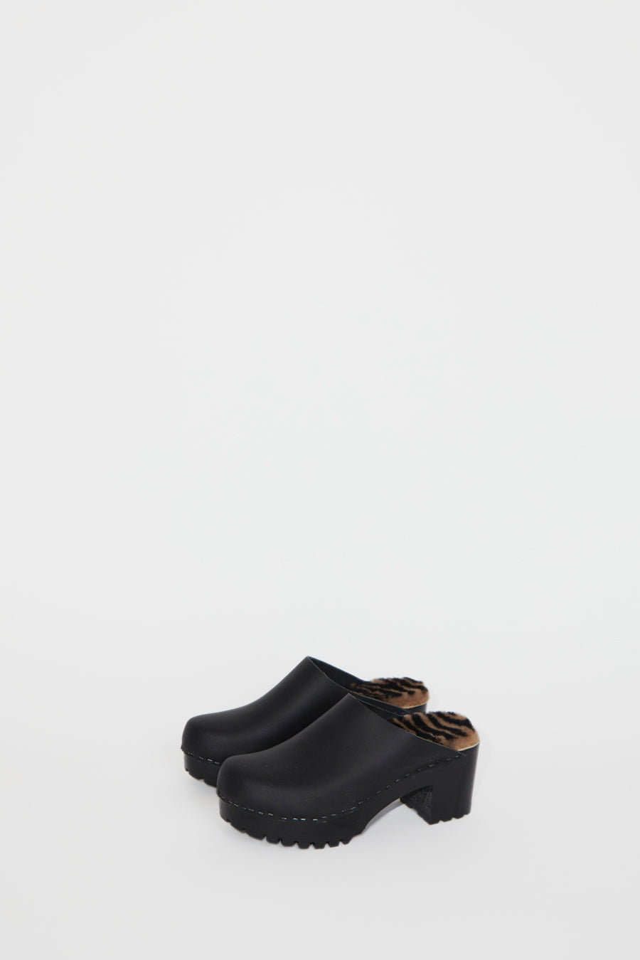 No.6 Liza Clog on Mid Tread in Black with Zebra Shearling on Black Base
