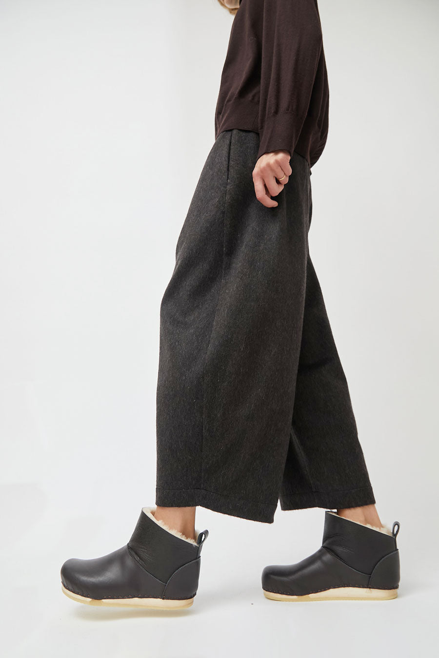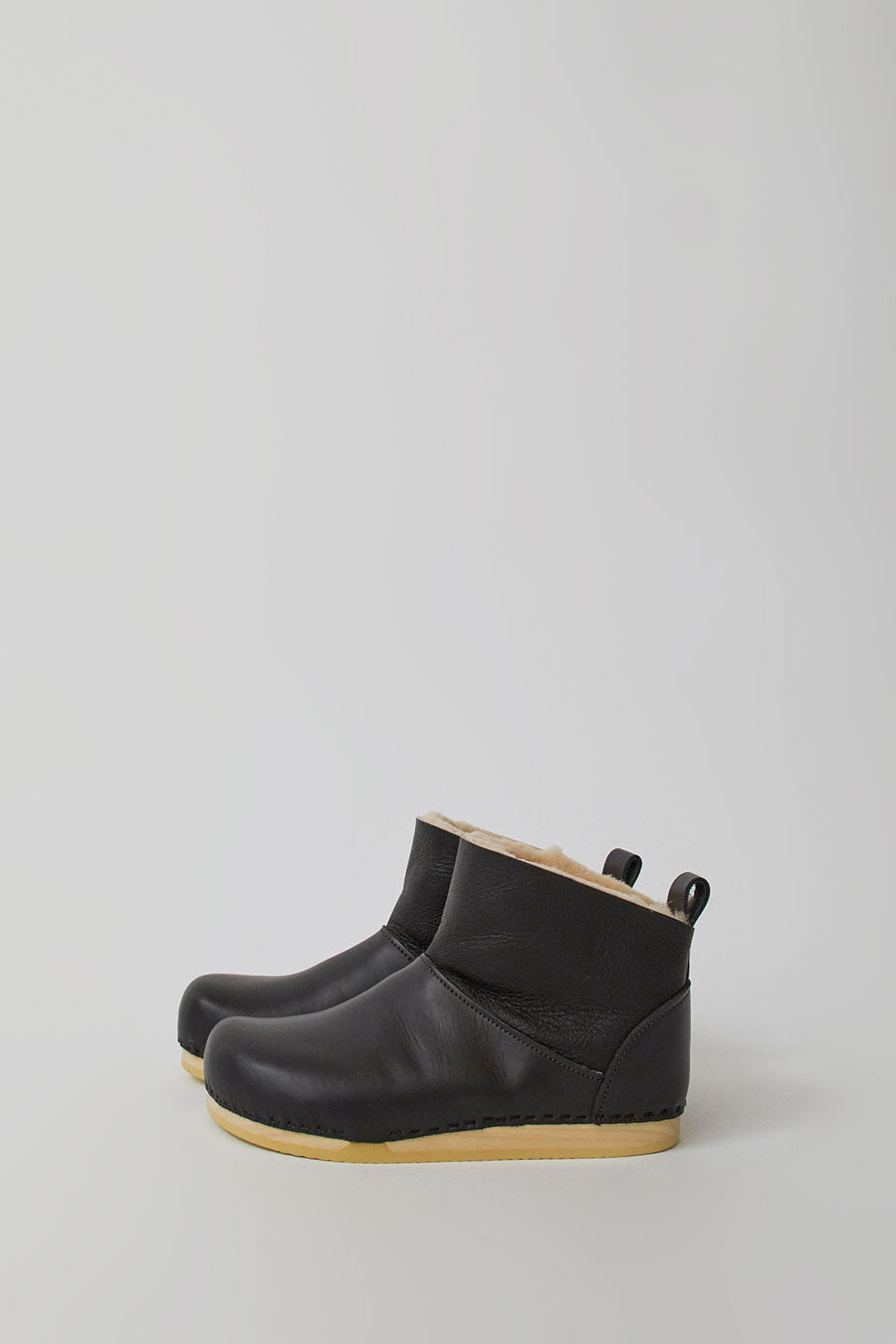 Our newest clog boot. Slip on, fully shearling lined boot on our bendable flat base. Leather toe, heel cap, and back tab. Low, asymmetrical shaft. Lightweight, lacquered wood base. Super warm, walkable, and great for everyday wear.