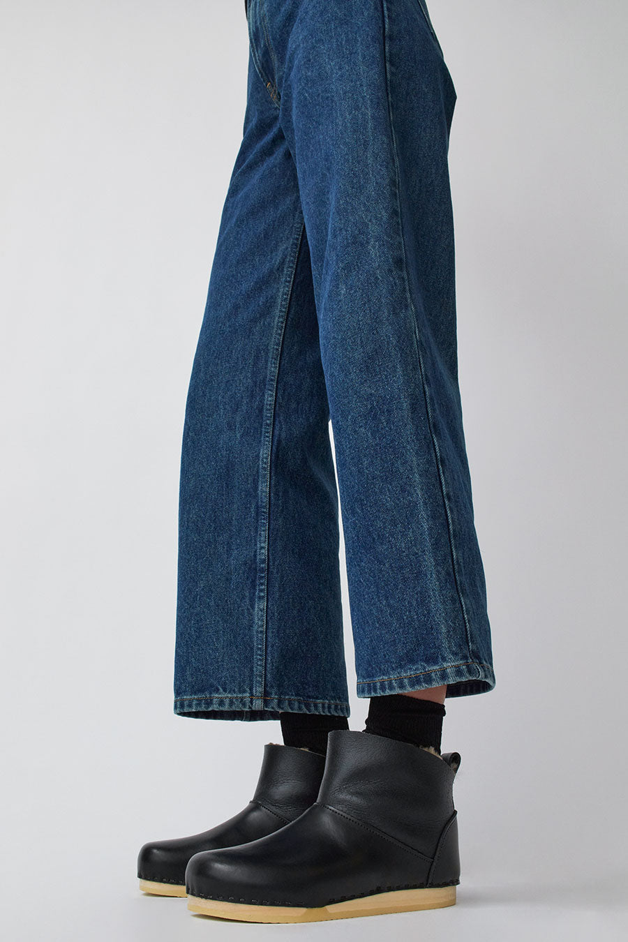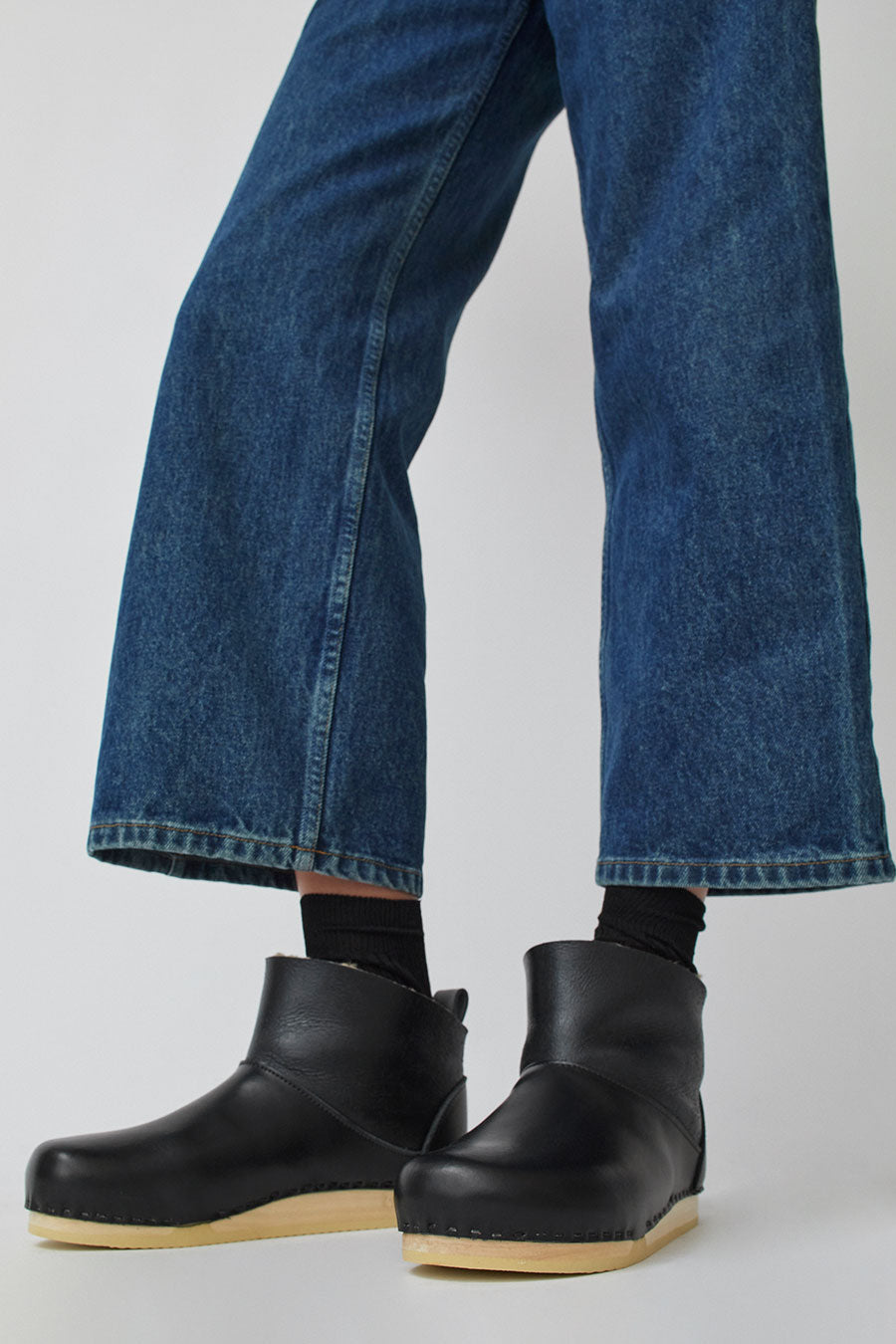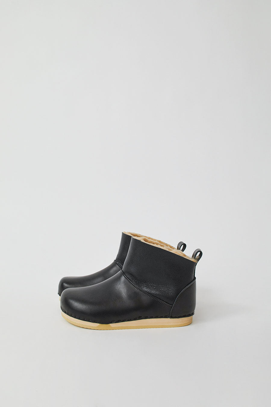 Our newest clog boot. Slip on, fully shearling lined boot on our bendable flat base. Leather toe, heel cap, and back tab. Low, asymmetrical shaft. Lightweight, lacquered wood base. Super warm, walkable, and great for everyday wear.