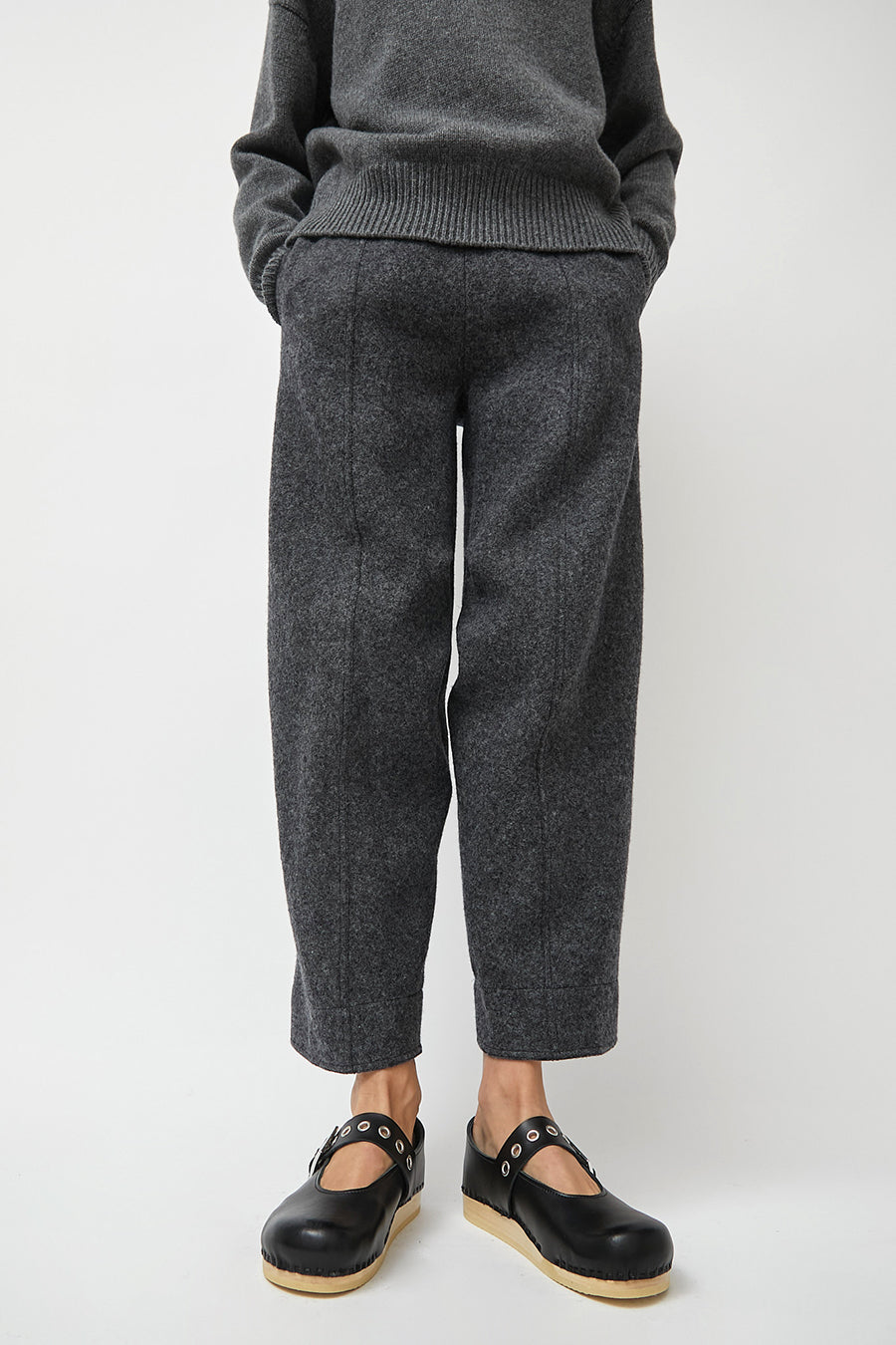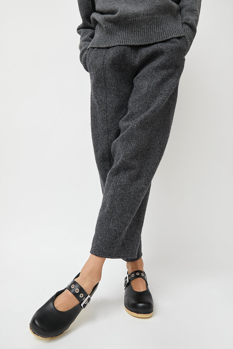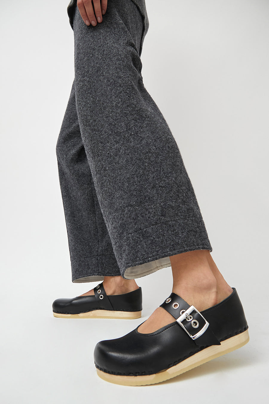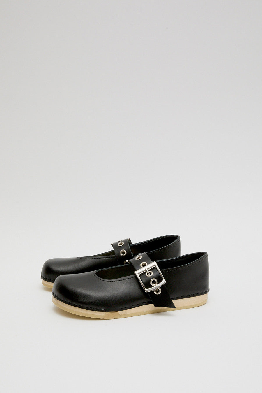 Maryjane style clogs with closed toe and closed heel in smooth black leather on our flat, bendable base. Adjustable leather strap across the foot features metallic eyelet details. Lacquered, lightweight wood base. Unlined.