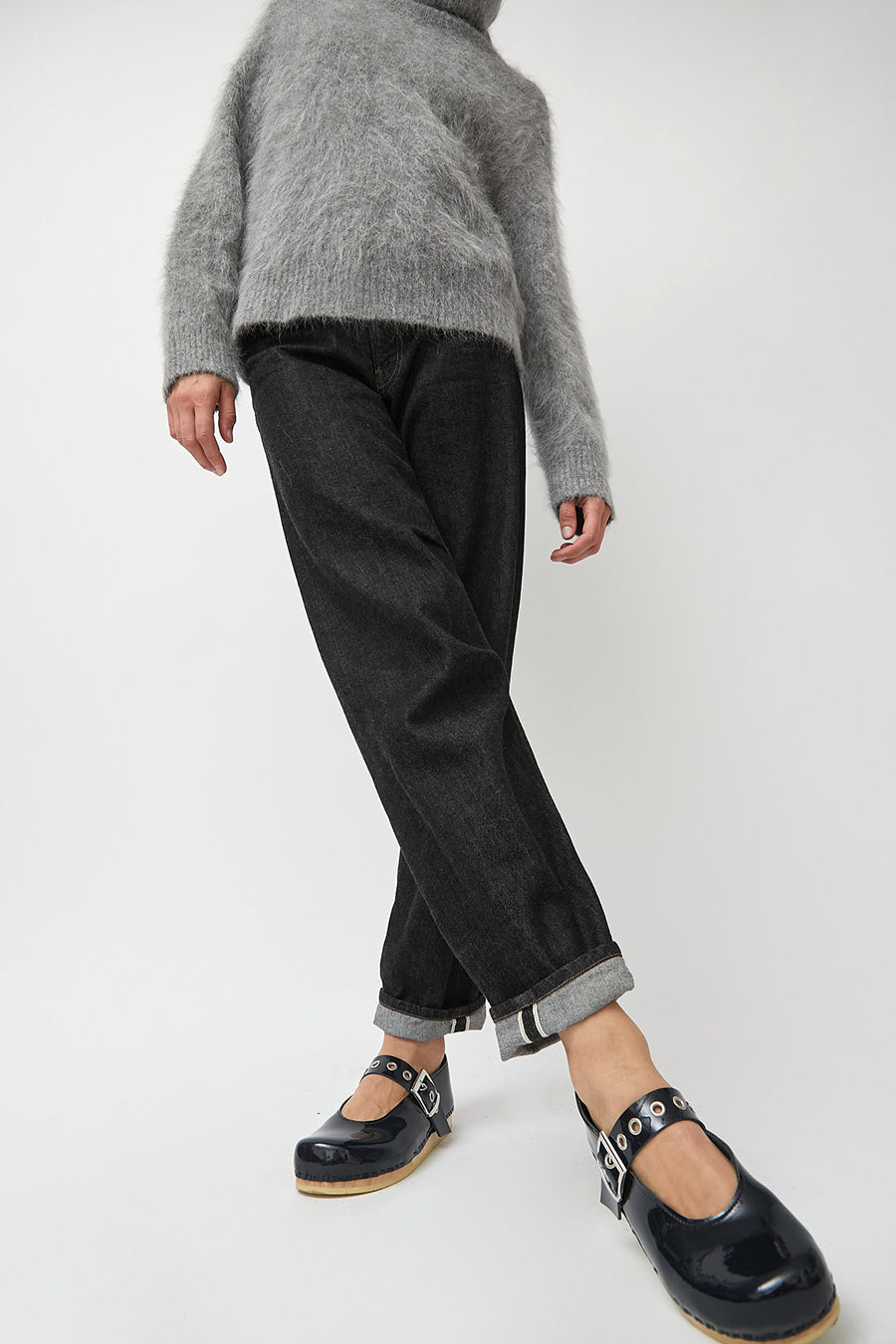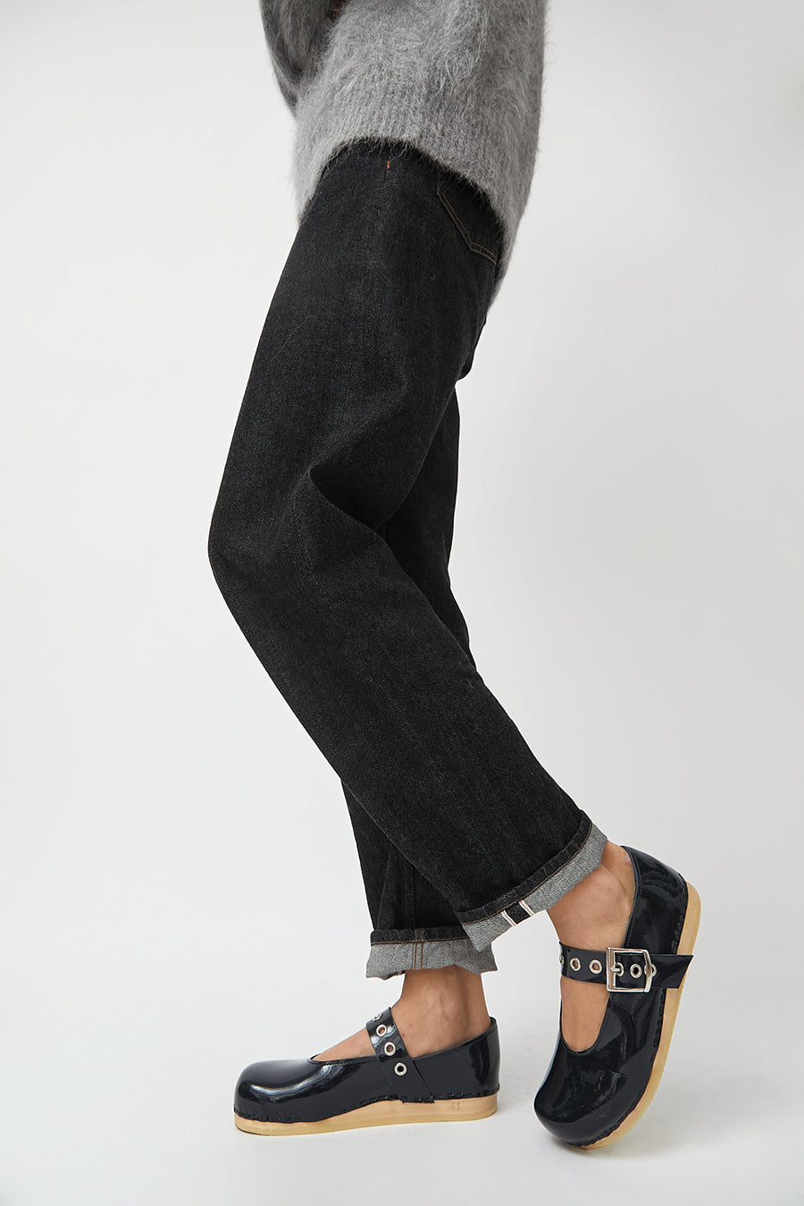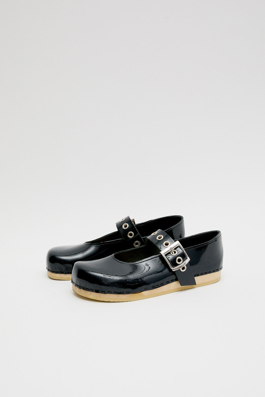 Maryjane style clogs with closed toe and closed heel in navy patent leather on our flat, bendable base. Adjustable leather strap across the foot features metallic eyelet details. Lacquered, lightweight wood base. Unlined.