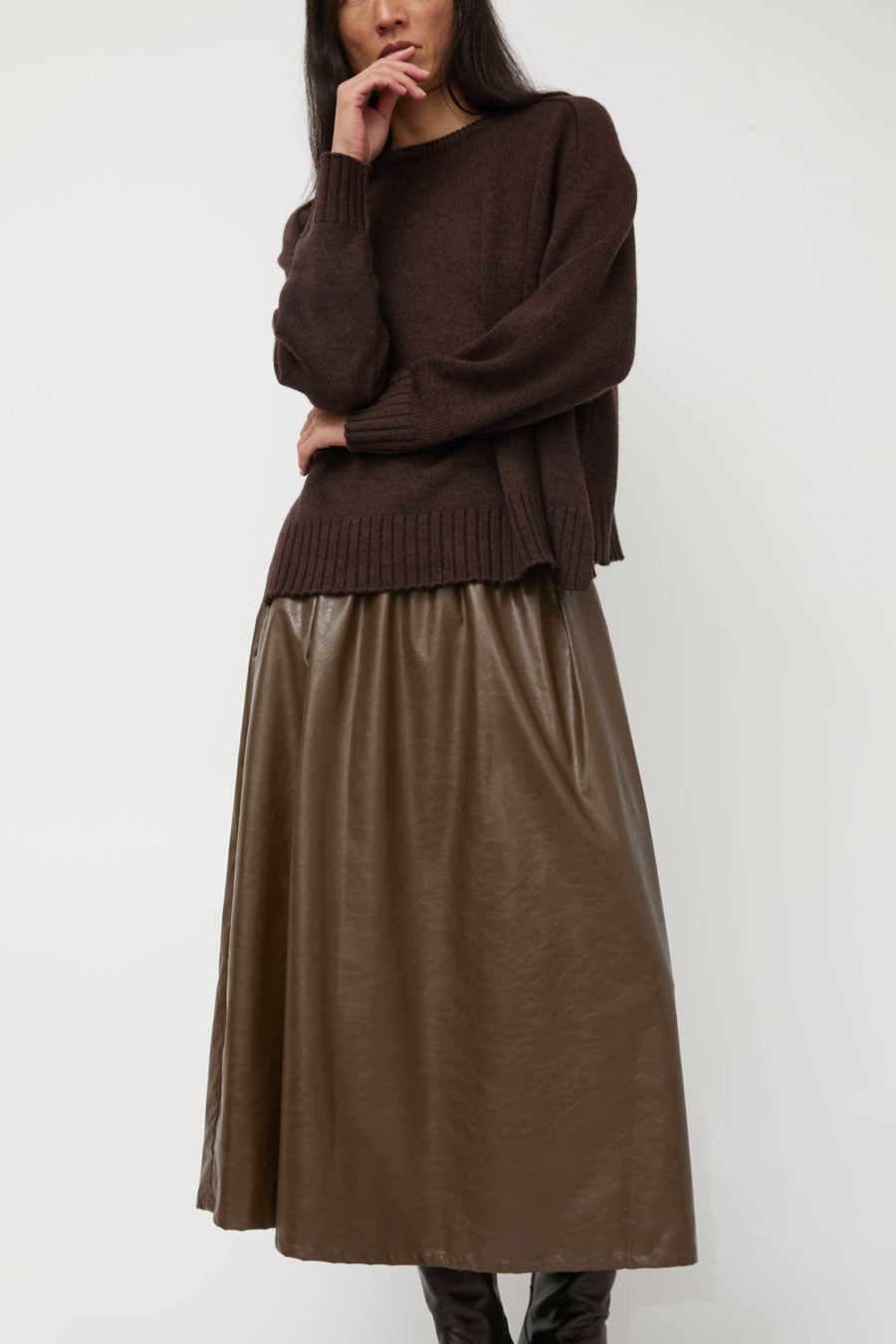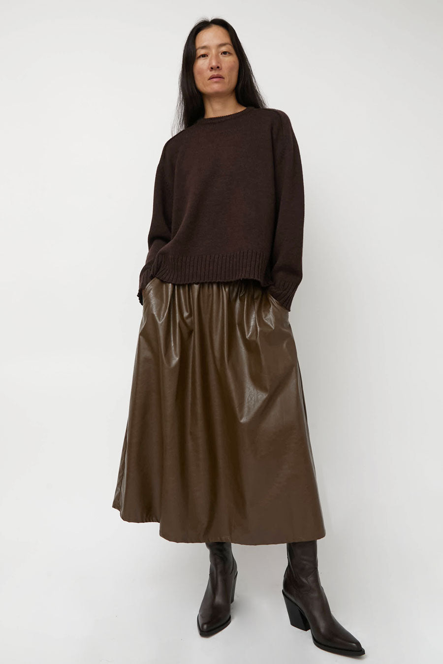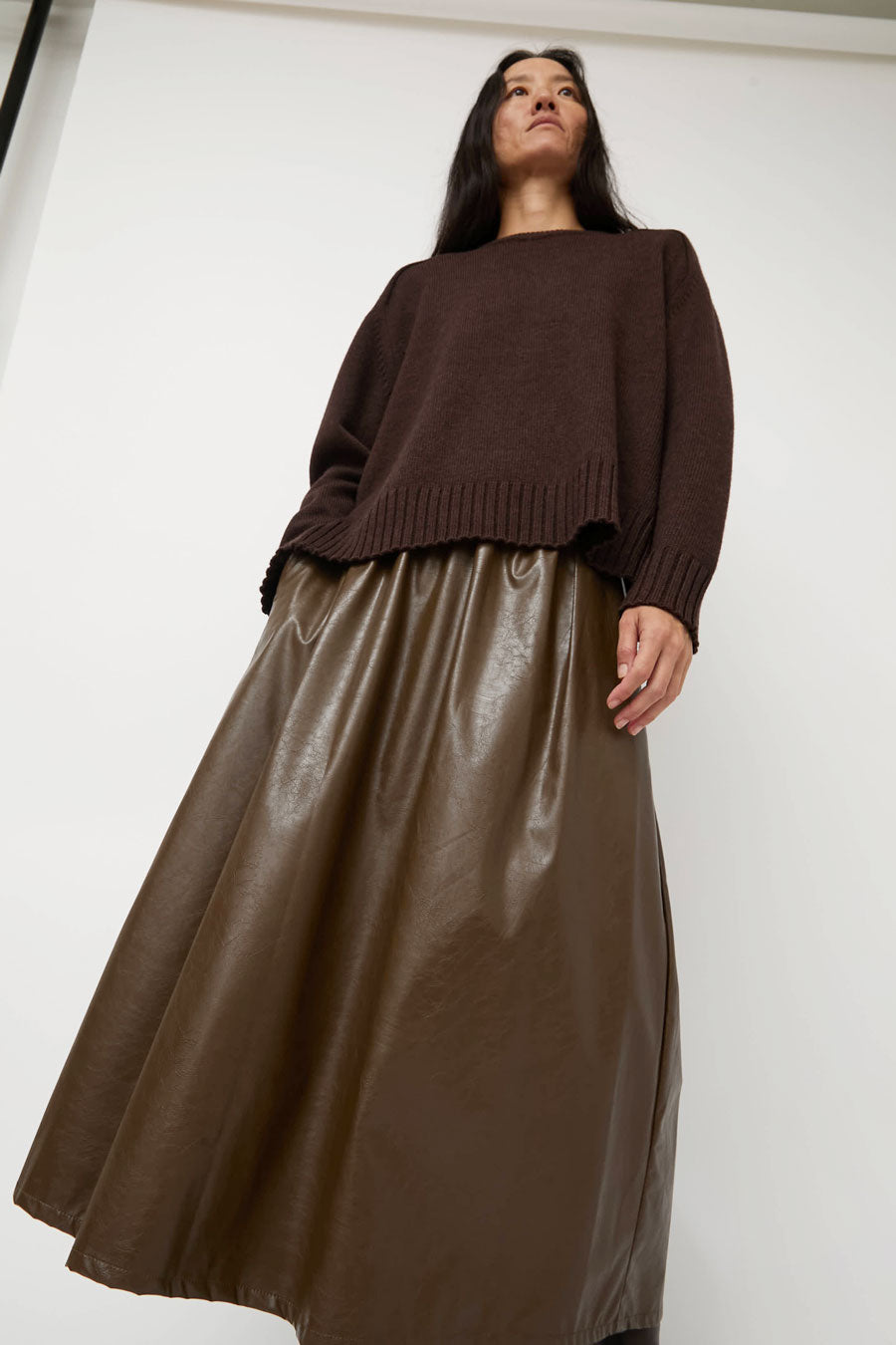 A modern take on a classic silhouette. A-line skirt cut in vegan leather. Mid-length with a bit of volume and a shirred, elasticated waistband.