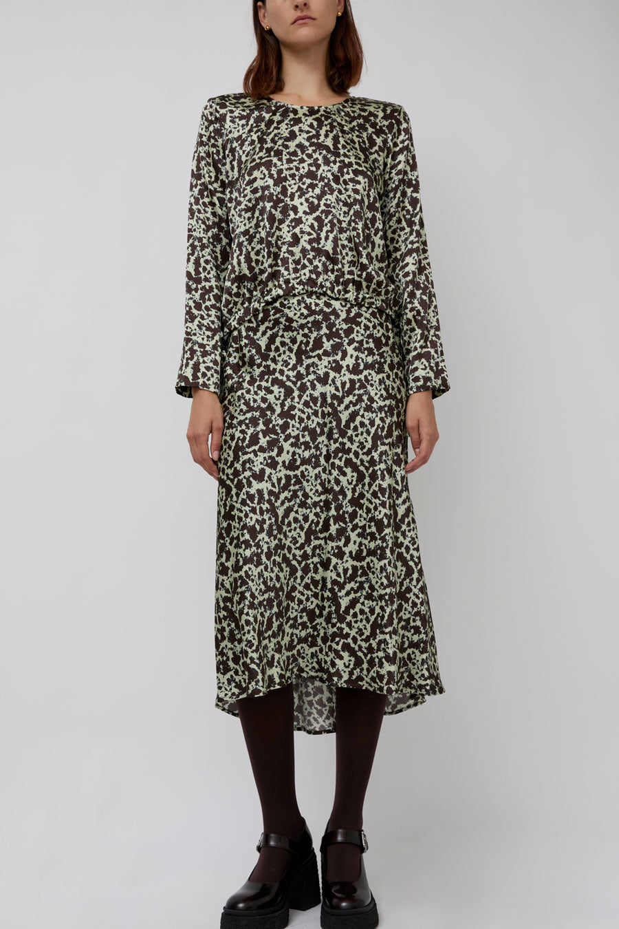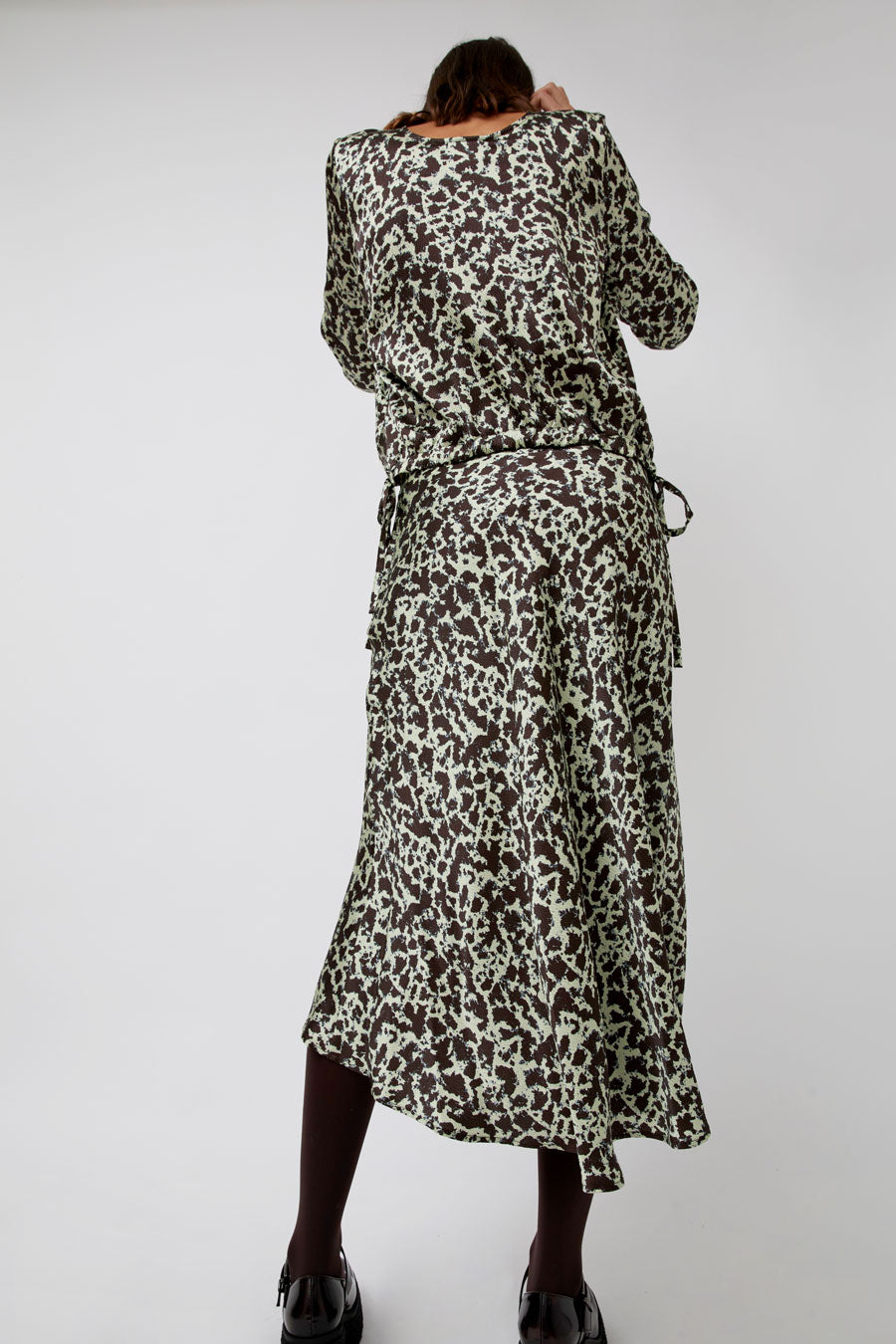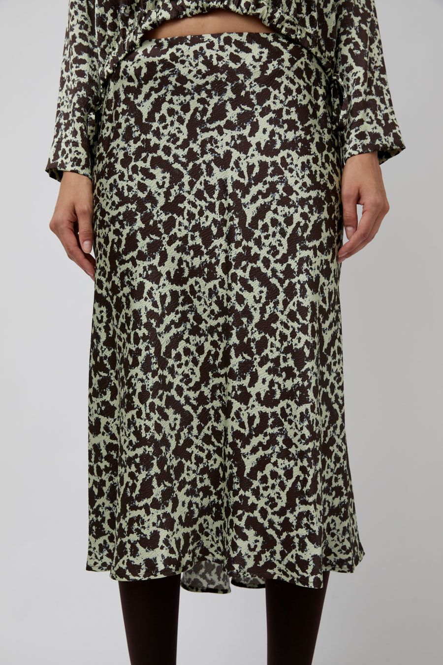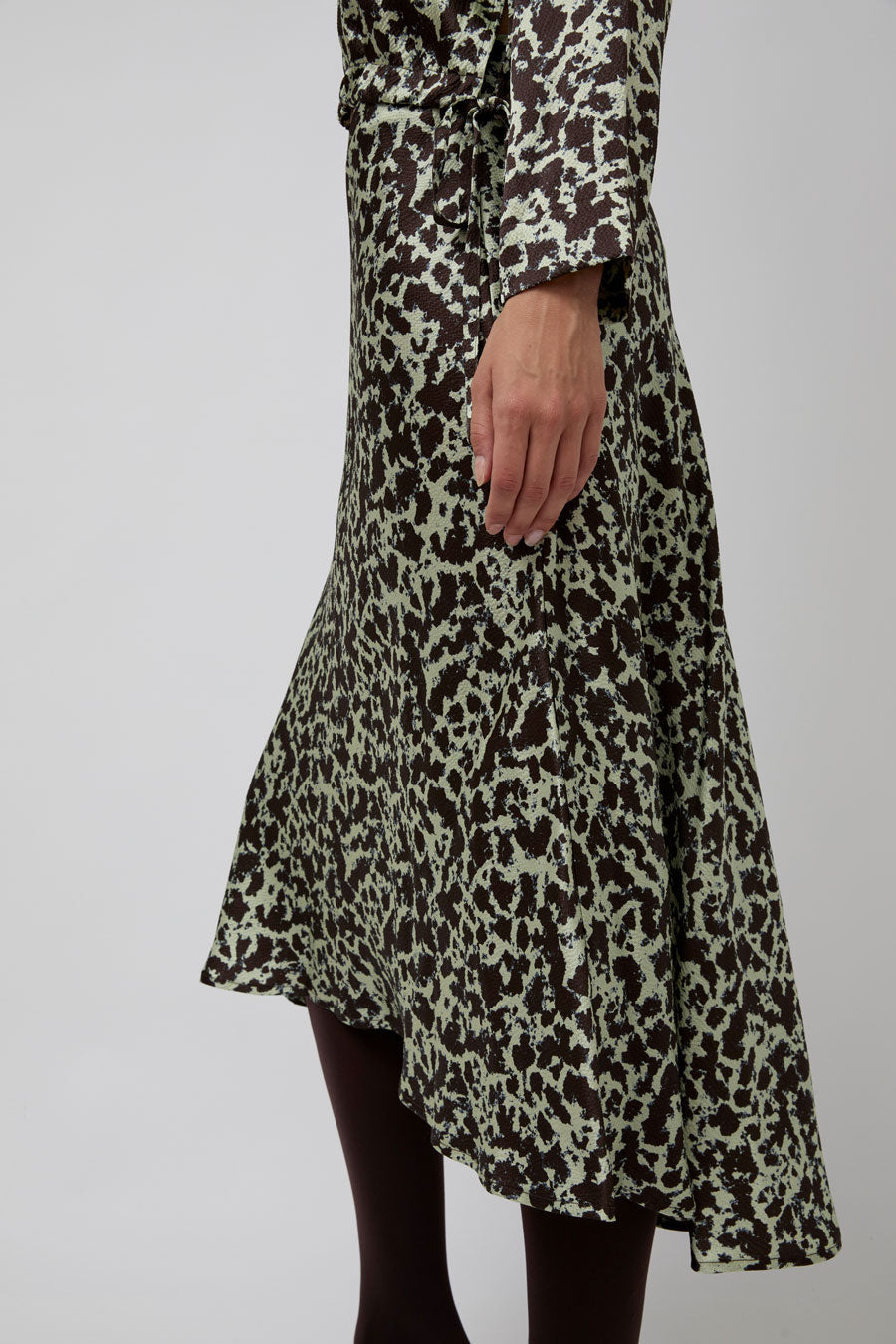 Streamlined A-line midi skirt cut in 100% silk. Hidden side zip closure. The asymmetric hemline is longer in the back and slightly shorter in front. Beautiful heft and drape.