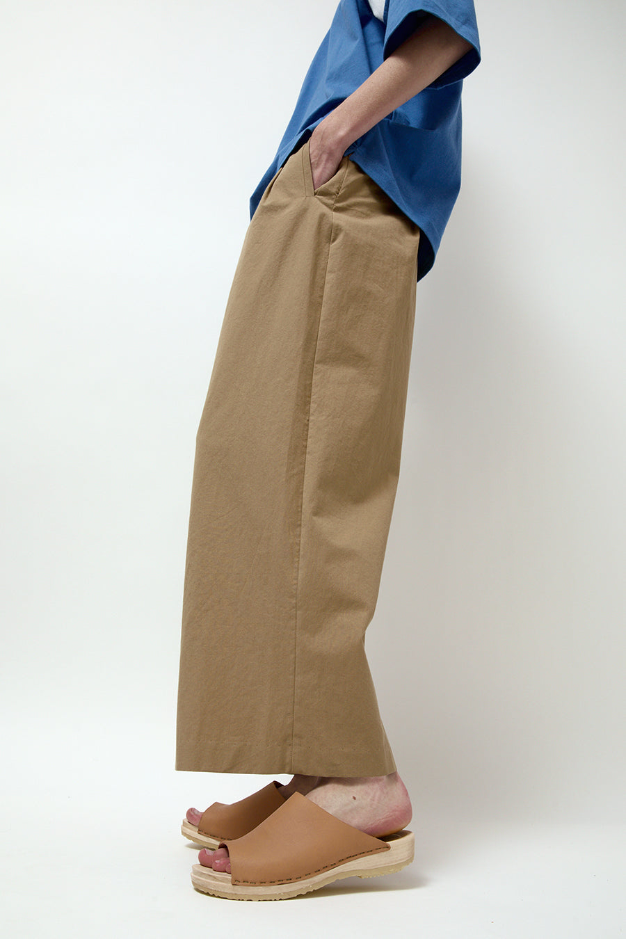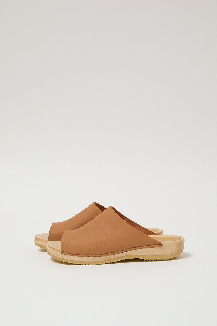 Open toe clog mule on flat base. Warm, medium brown leather upper. Lacquered, lightweight wood base.