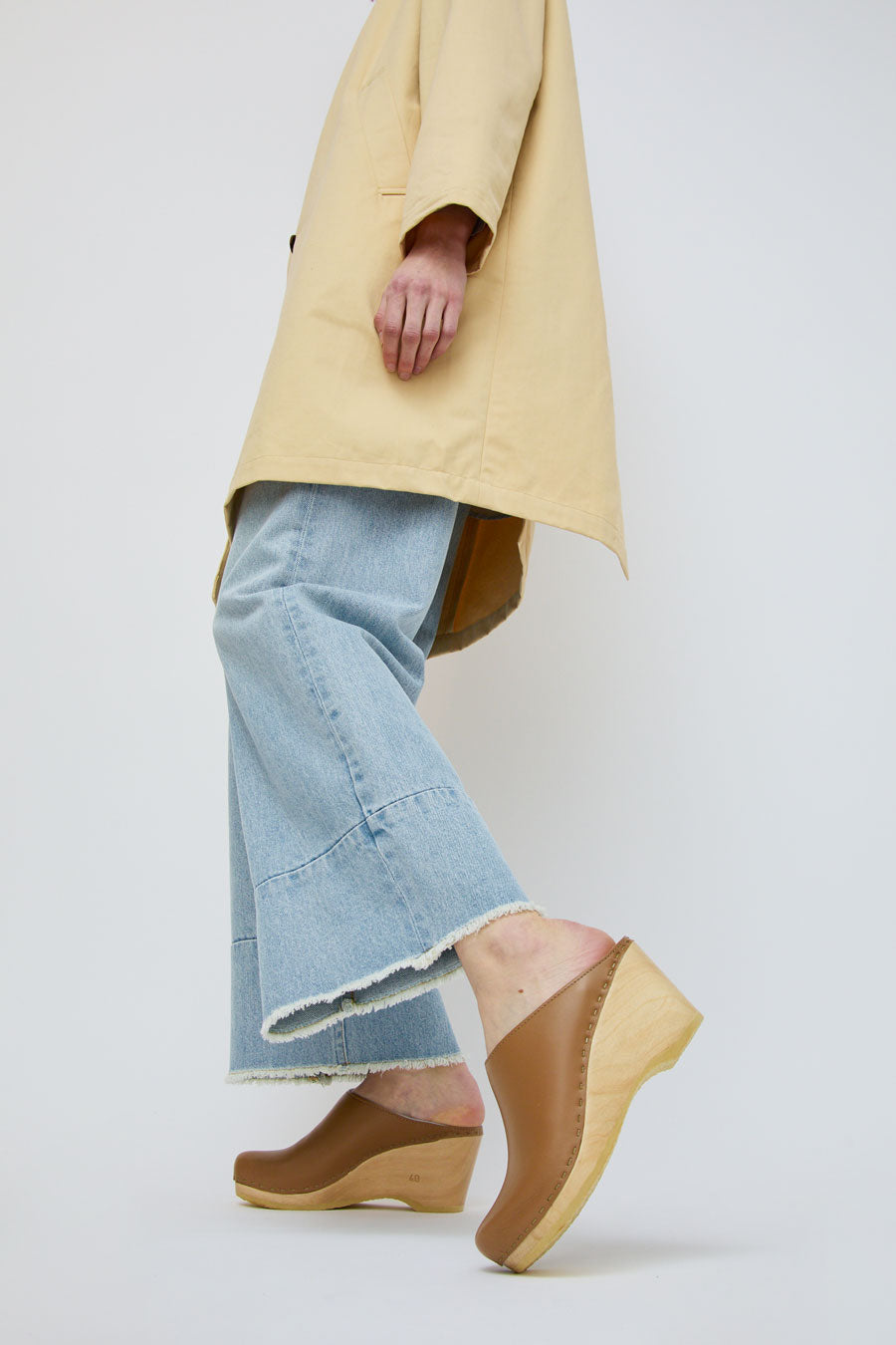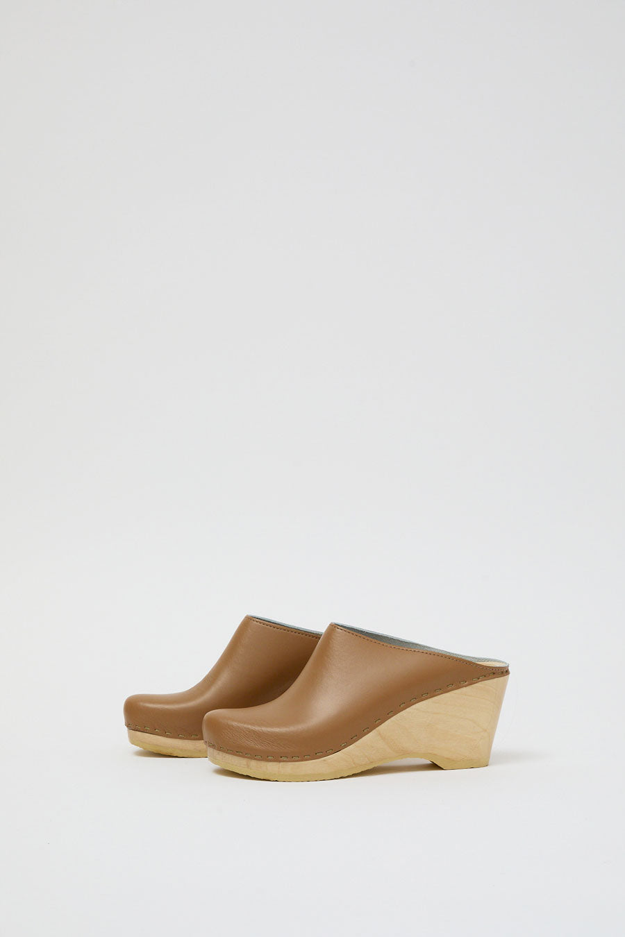 A new take on our classic Old School clog. Smooth, khaki leather upper. Rounded toe, open back. Lightweight wooden wedge heel. Unlined.