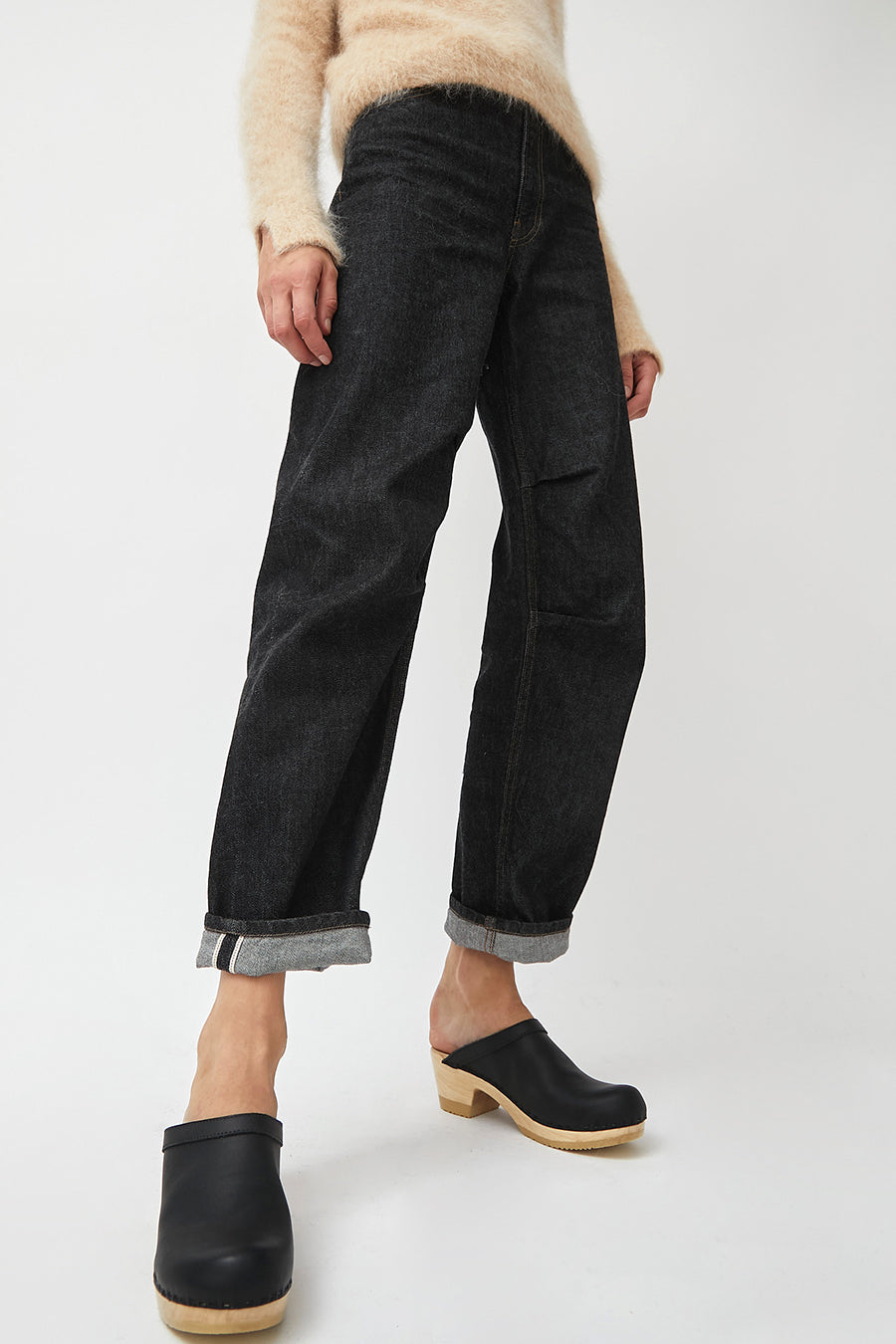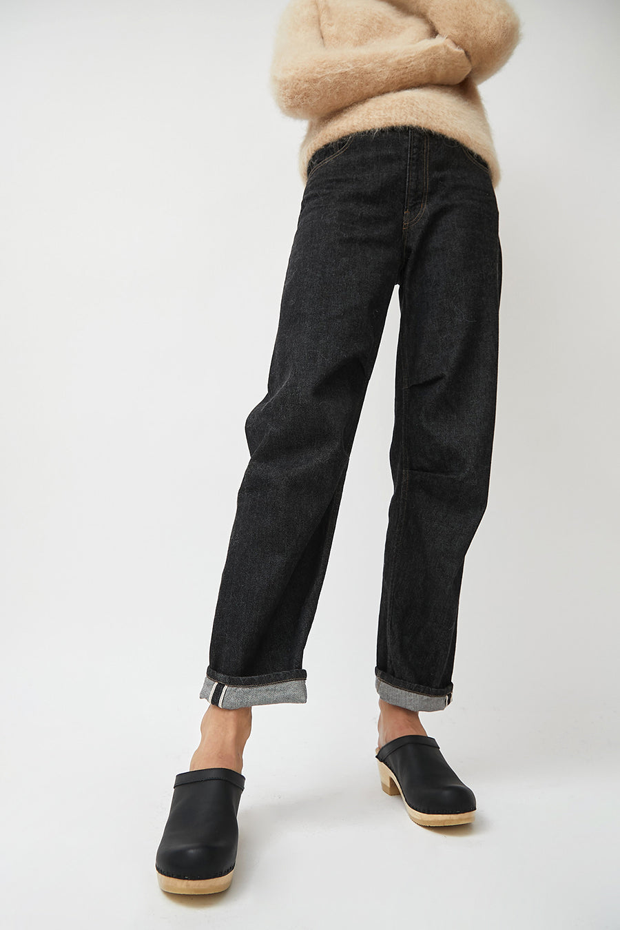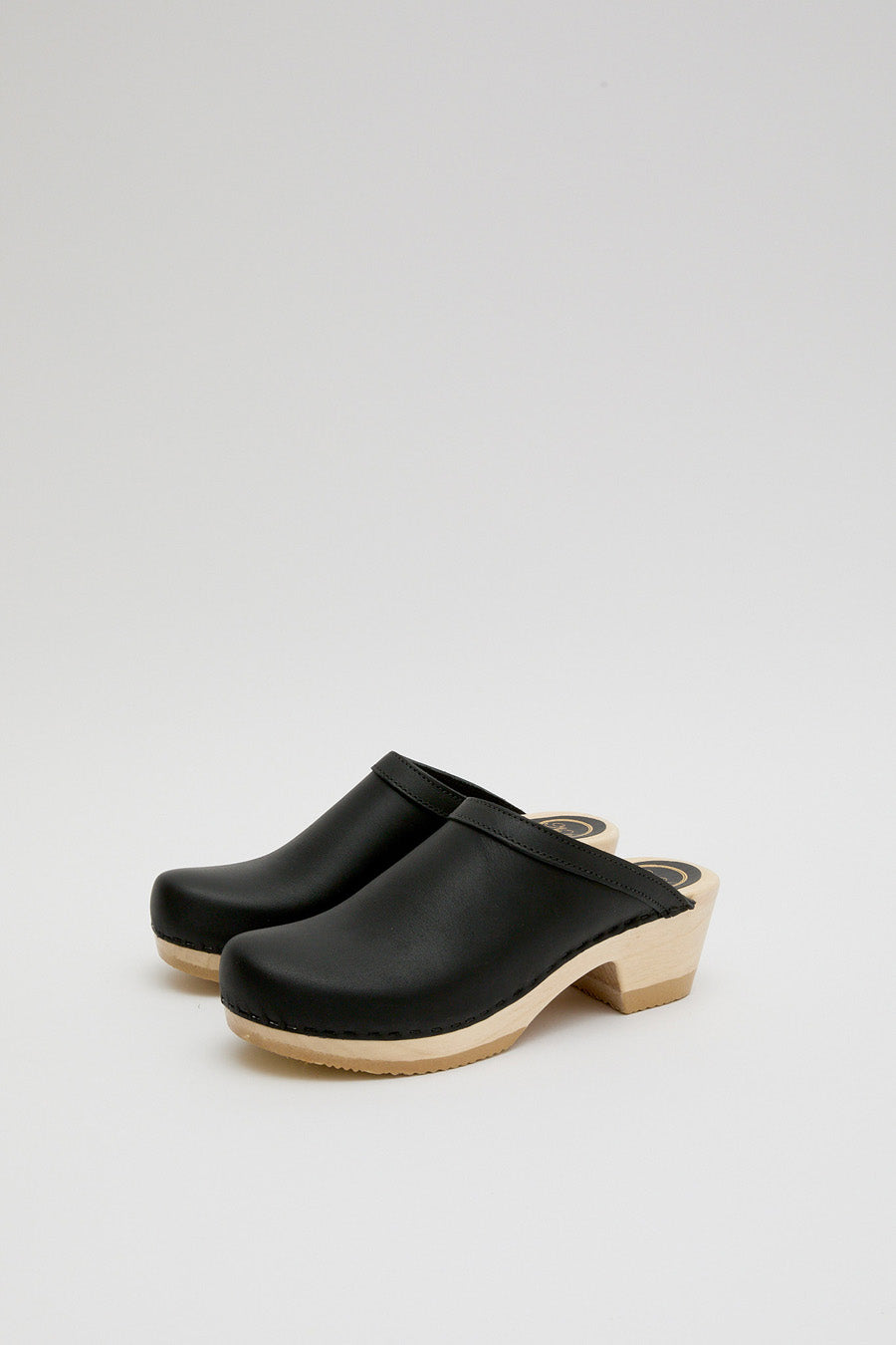 Our bestselling clog style on our mid heel base. Black leather upper. Stitched collar, rounded toe, and open back. Lacquered, lightweight wooden base. Unlined.