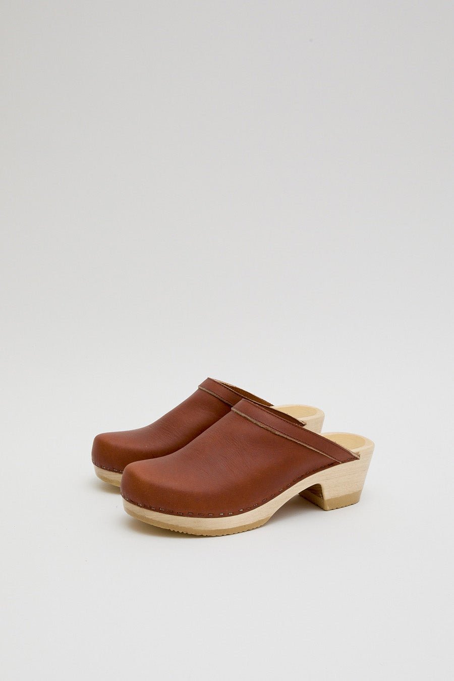Our bestselling clog style on our mid heel base. Reddish brown leather upper. Stitched collar, rounded toe, and open back. Lacquered, lightweight wood base. Unlined.