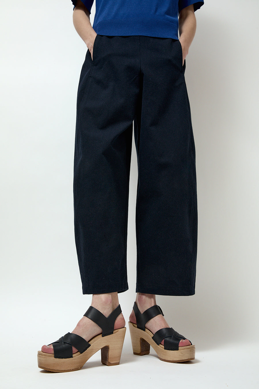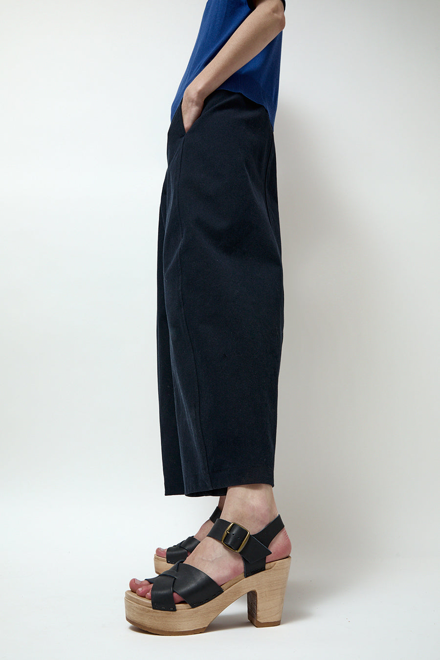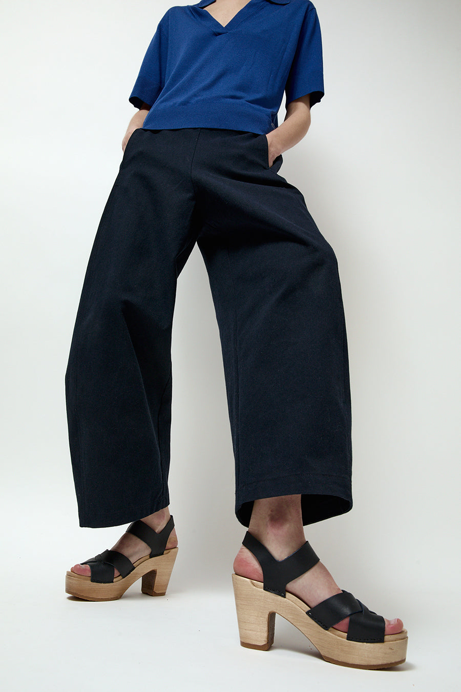 Cross front clog sandal with adjustable ankle strap on platform heel. Deep indigo leather upper. Lacquered, lightweight wood base. Unlined.