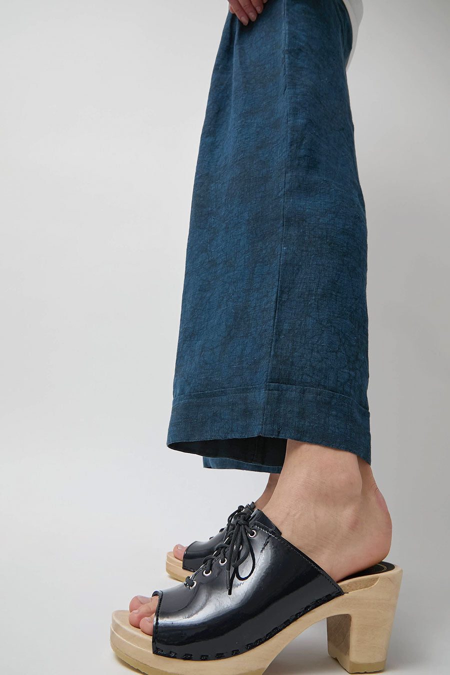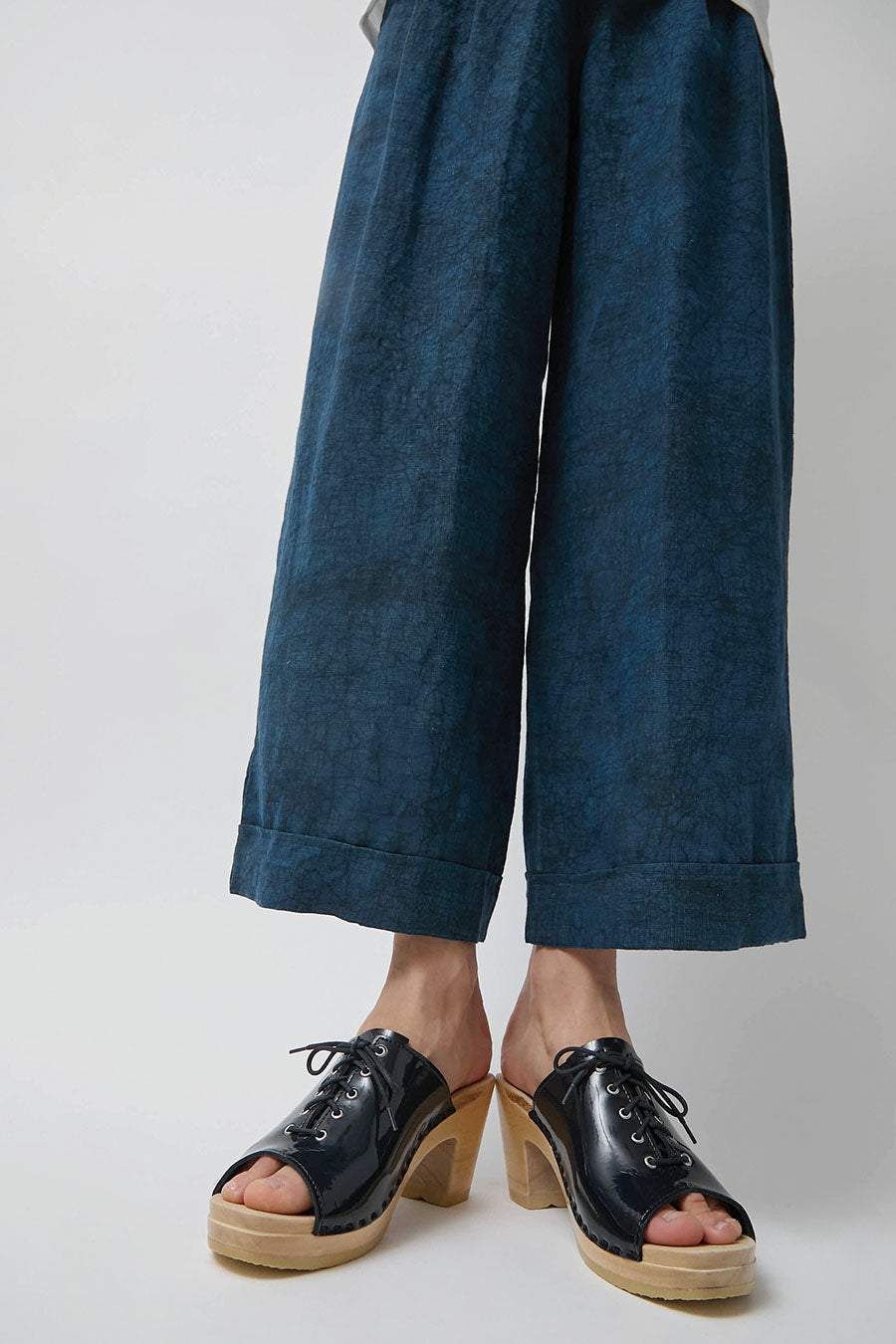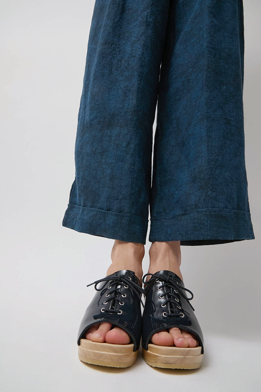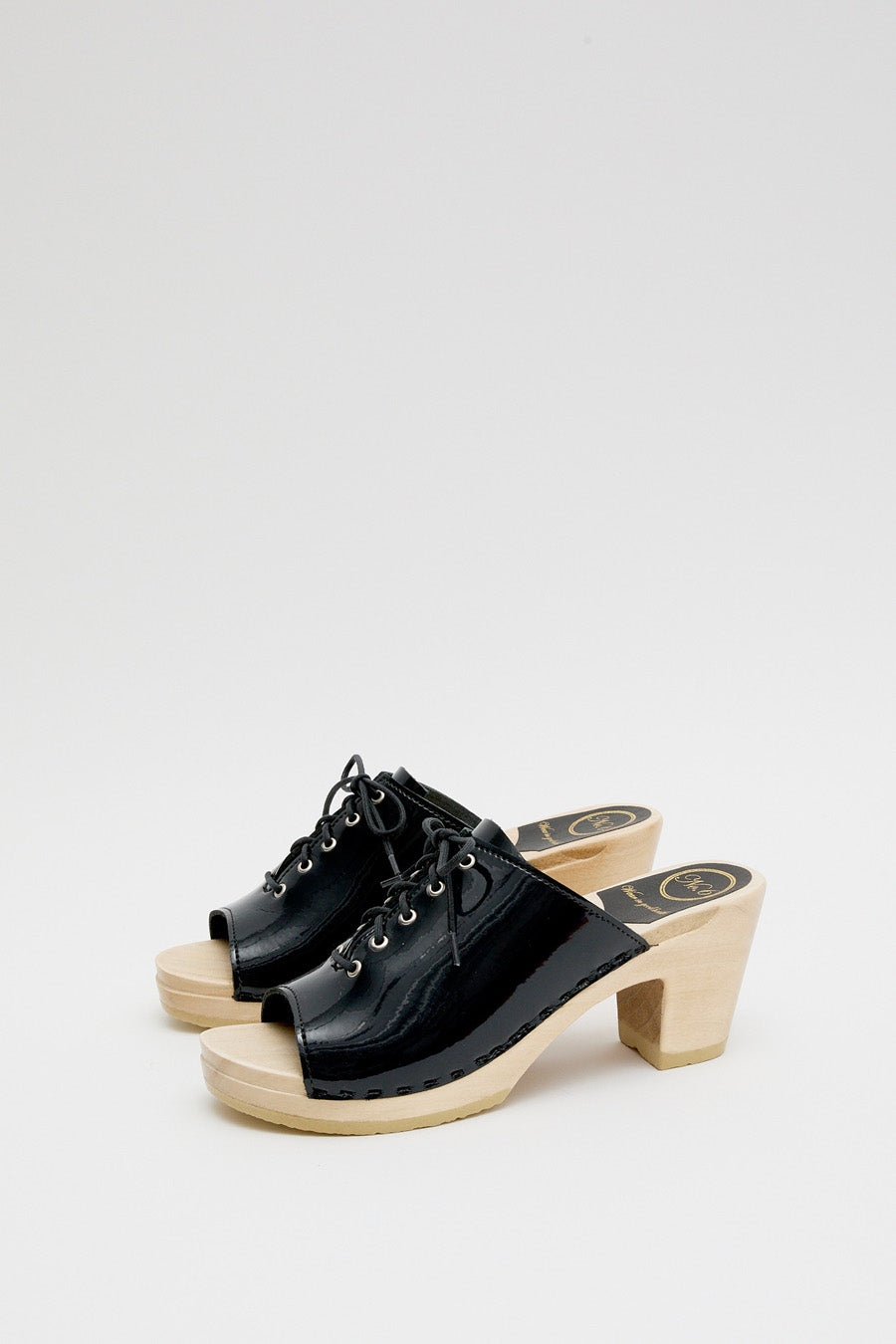 Slip on, open toe clog sandal with front lace up detail on a high heel base. Smooth, deep navy patent leather upper. Lightweight, lacquered wood base. Unlined. Surprisingly comfortable for a high heeled shoe.