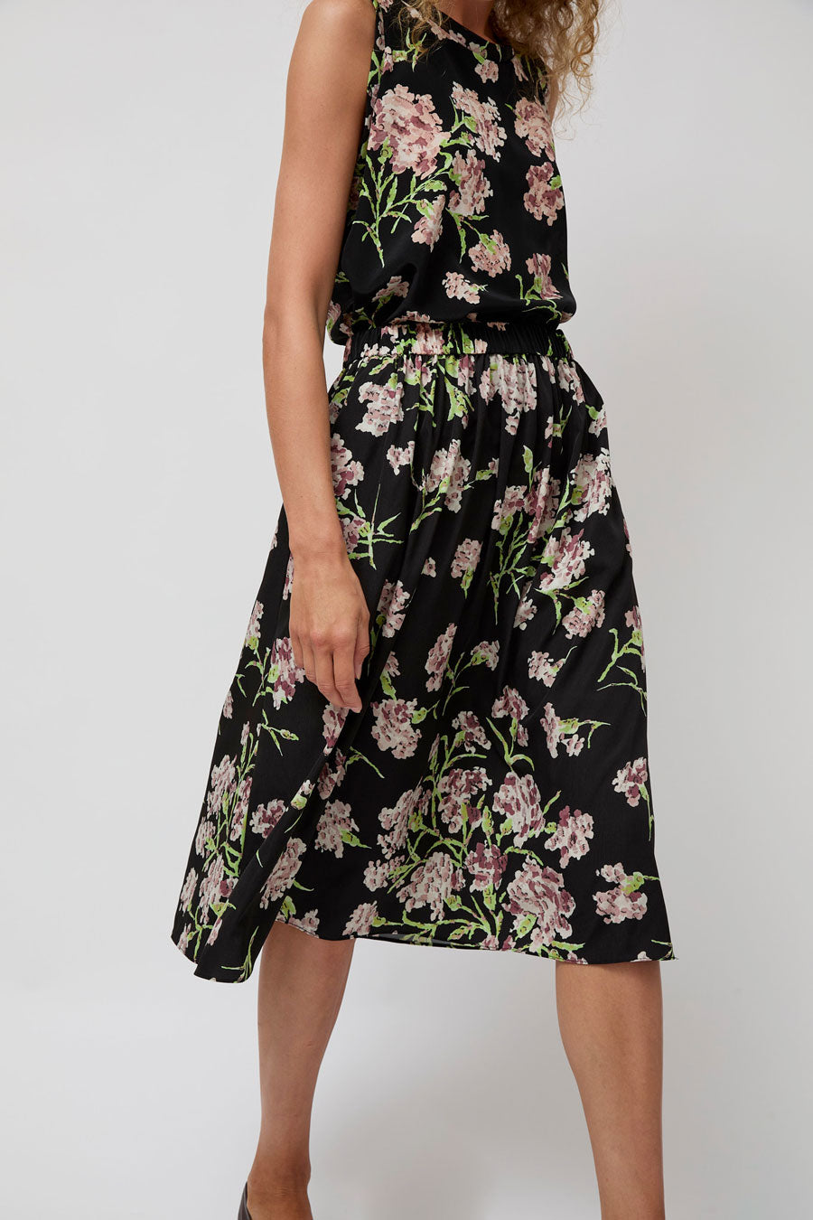Printed silk blend midi skirt with wide, elasticated waistband. Made in New York City.