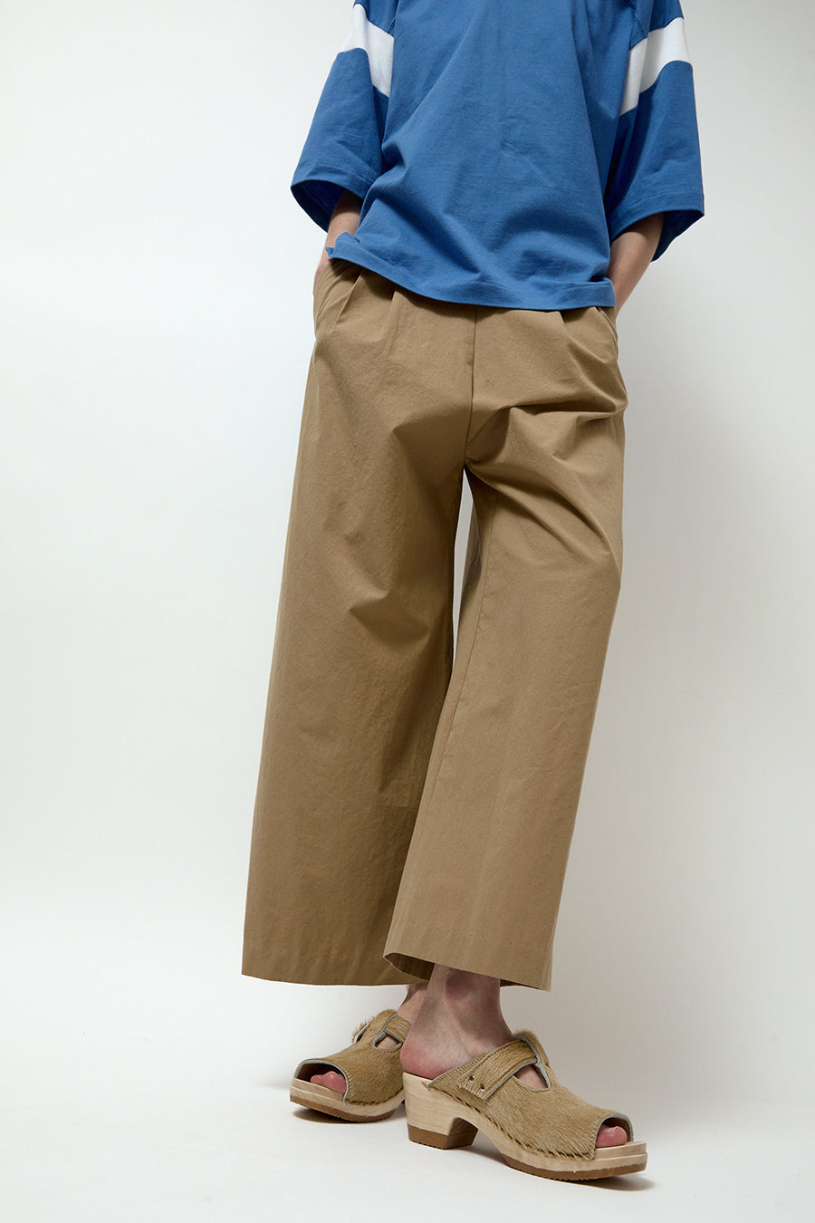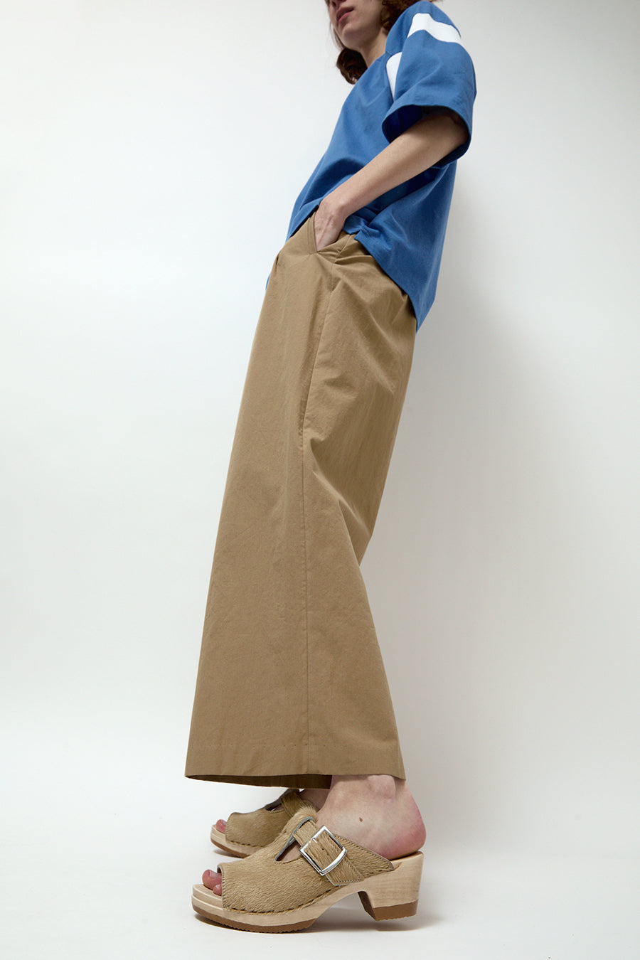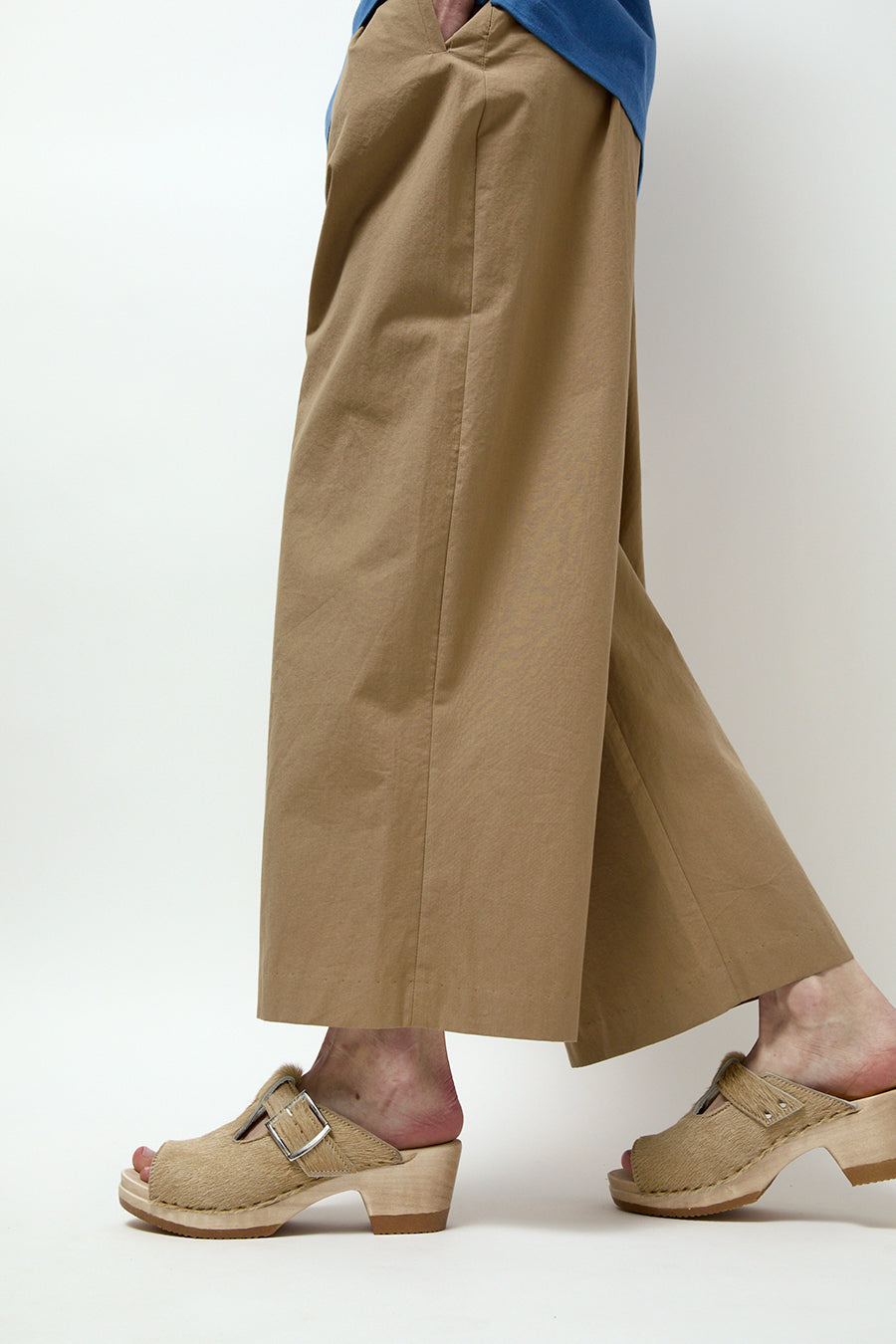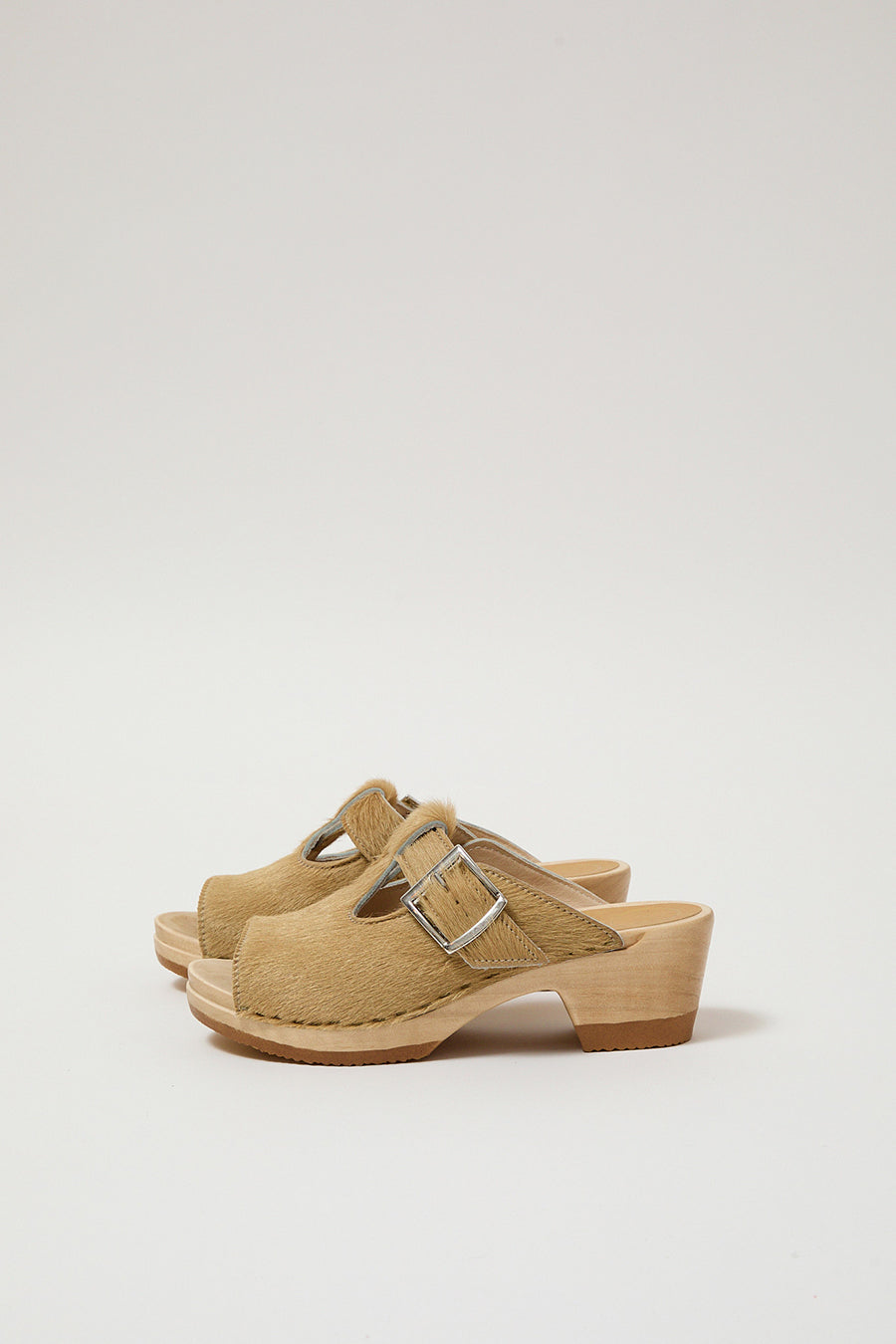 Open toe T strap clog sandal on a mid-heel. Golden calf hair upper. Adjustable buckle strap with double rivet detail. Lightweight, lacquered wood base. Unlined.