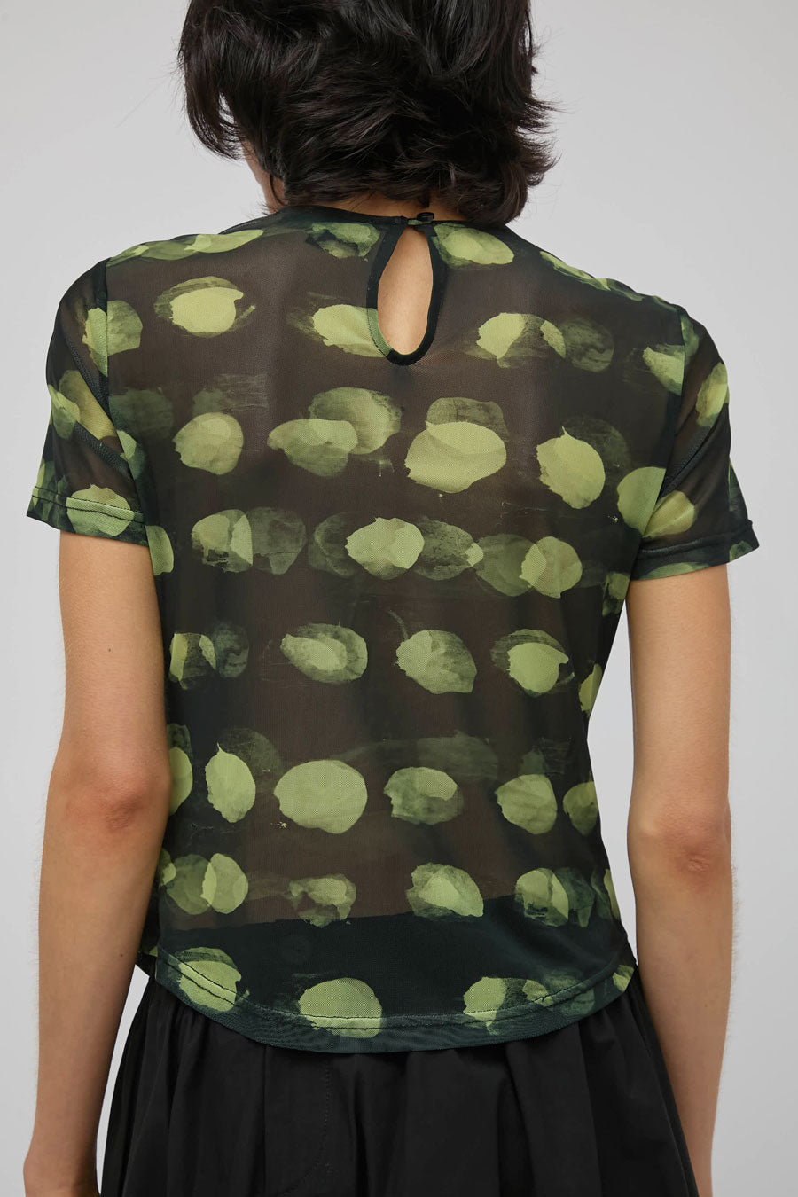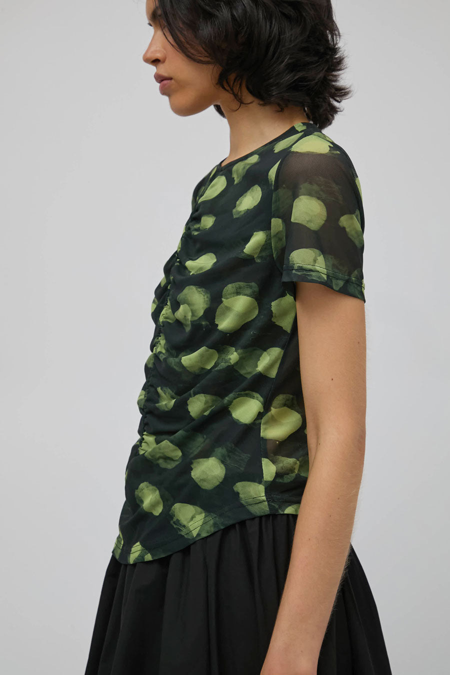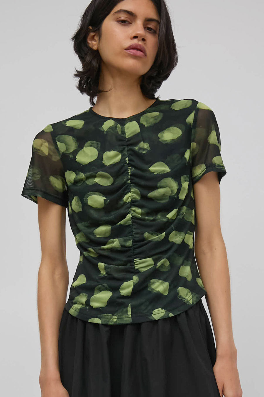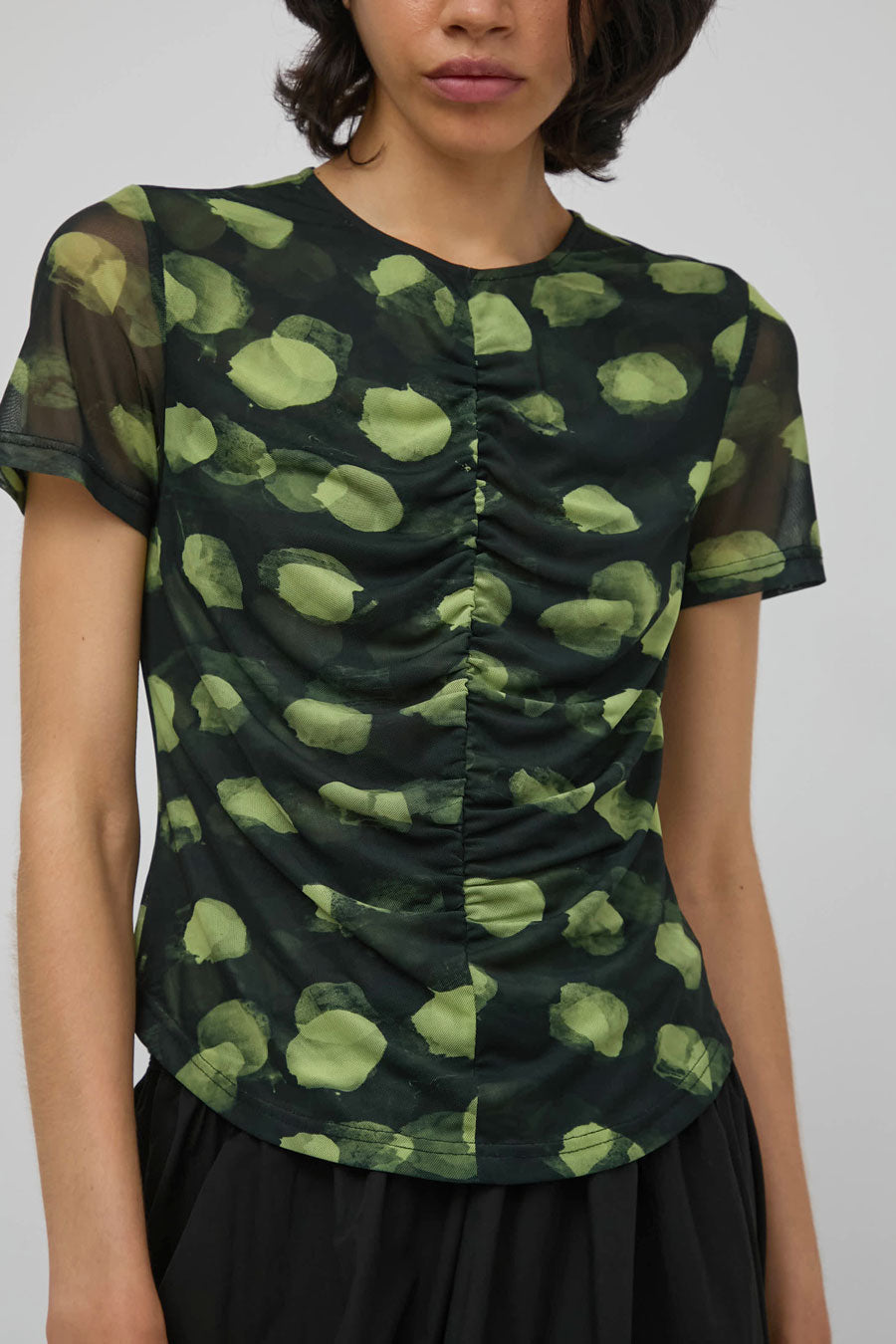 Elevated short-sleeve t-shirt with a flattering ruched center seam. Slim fit with a hem long enough to tuck. Back button keyhole closure.