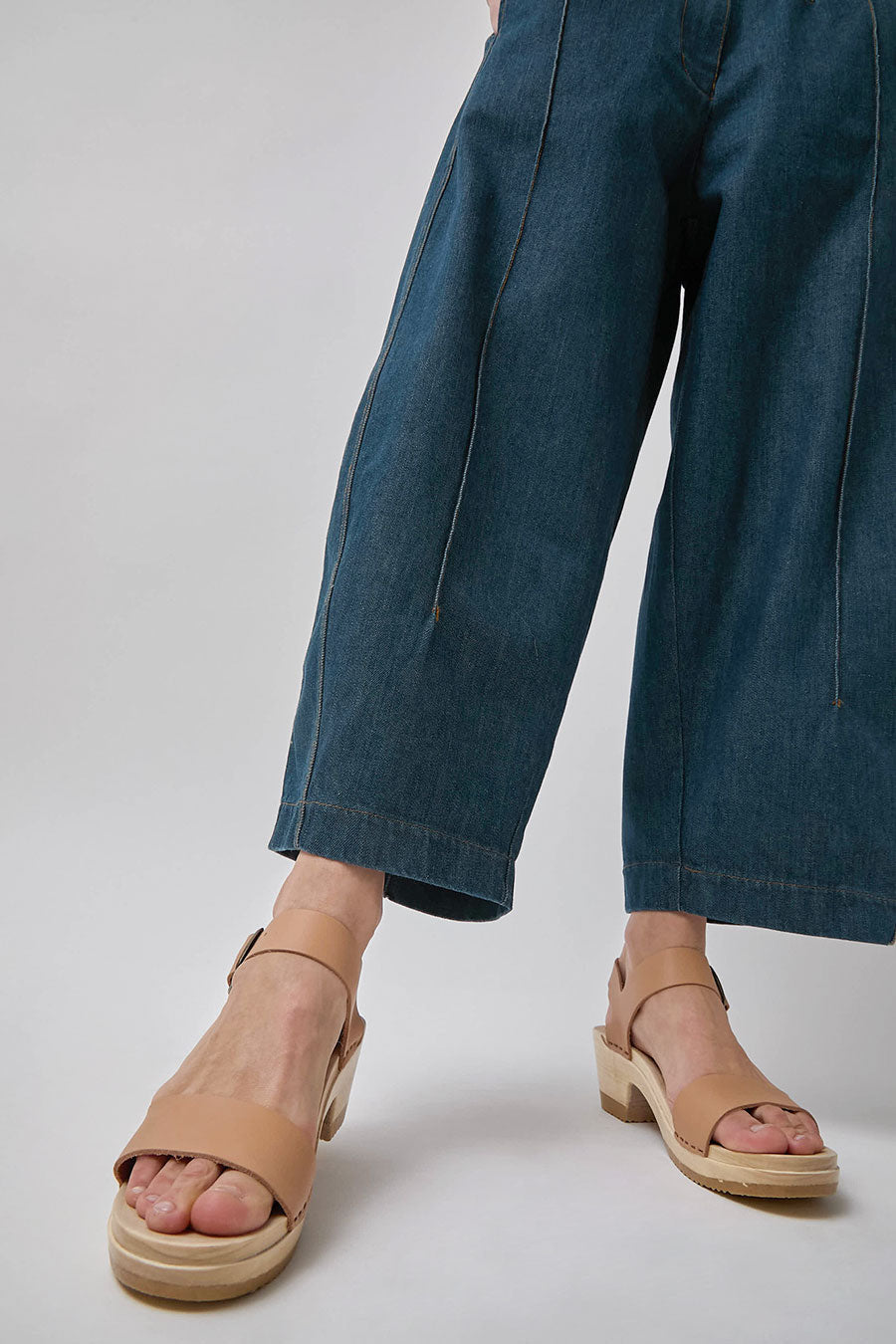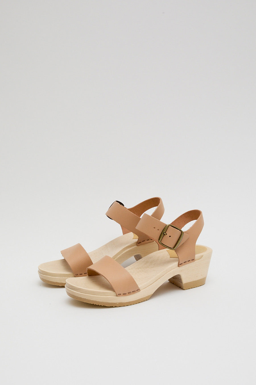 A clog sandal as simple as its name, in a neutral peach-pink leather. Wide toe strap and adjustable ankle strap on our popular mid heel base. Antiqued brass buckle.